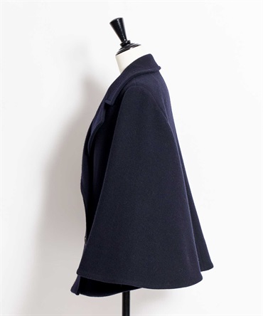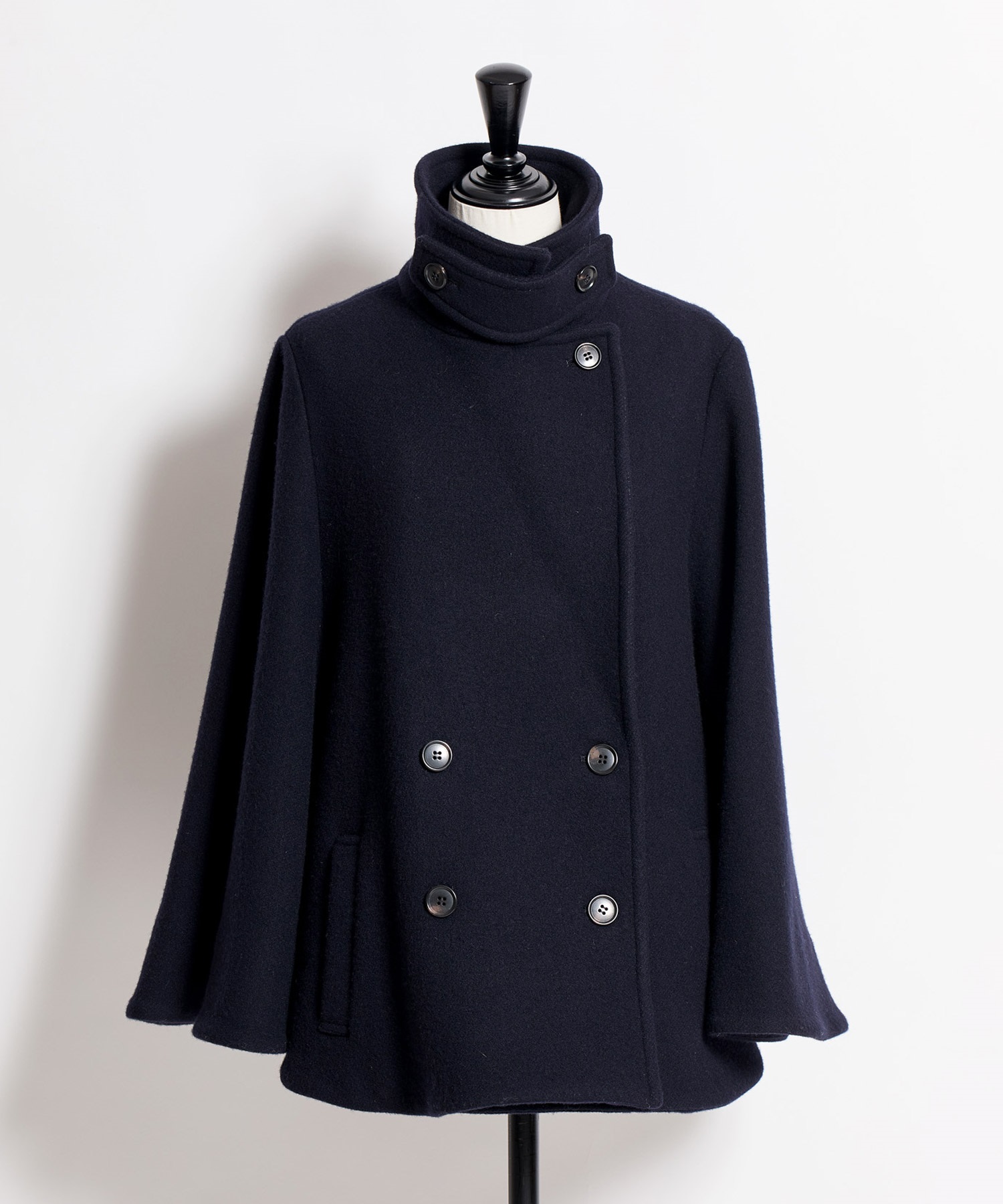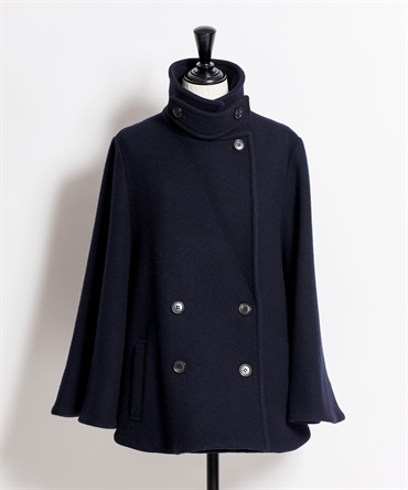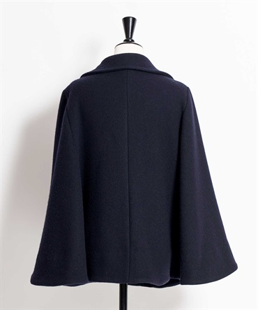 【おすすめポイント】:スタンドカラーとしても着られるので、防寒性もばっちり。袖が長めのケープシルエットがかわいらしい印象を与えてくれます。ダブルボタンがクラシックなアクセントになっていて、上品な雰囲気で着られる一着です。