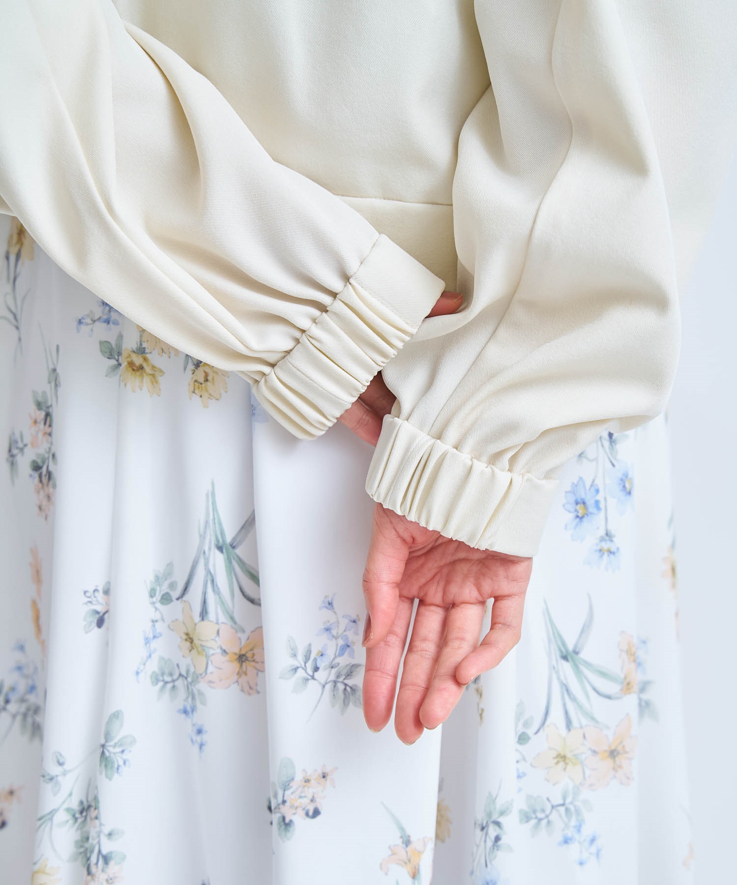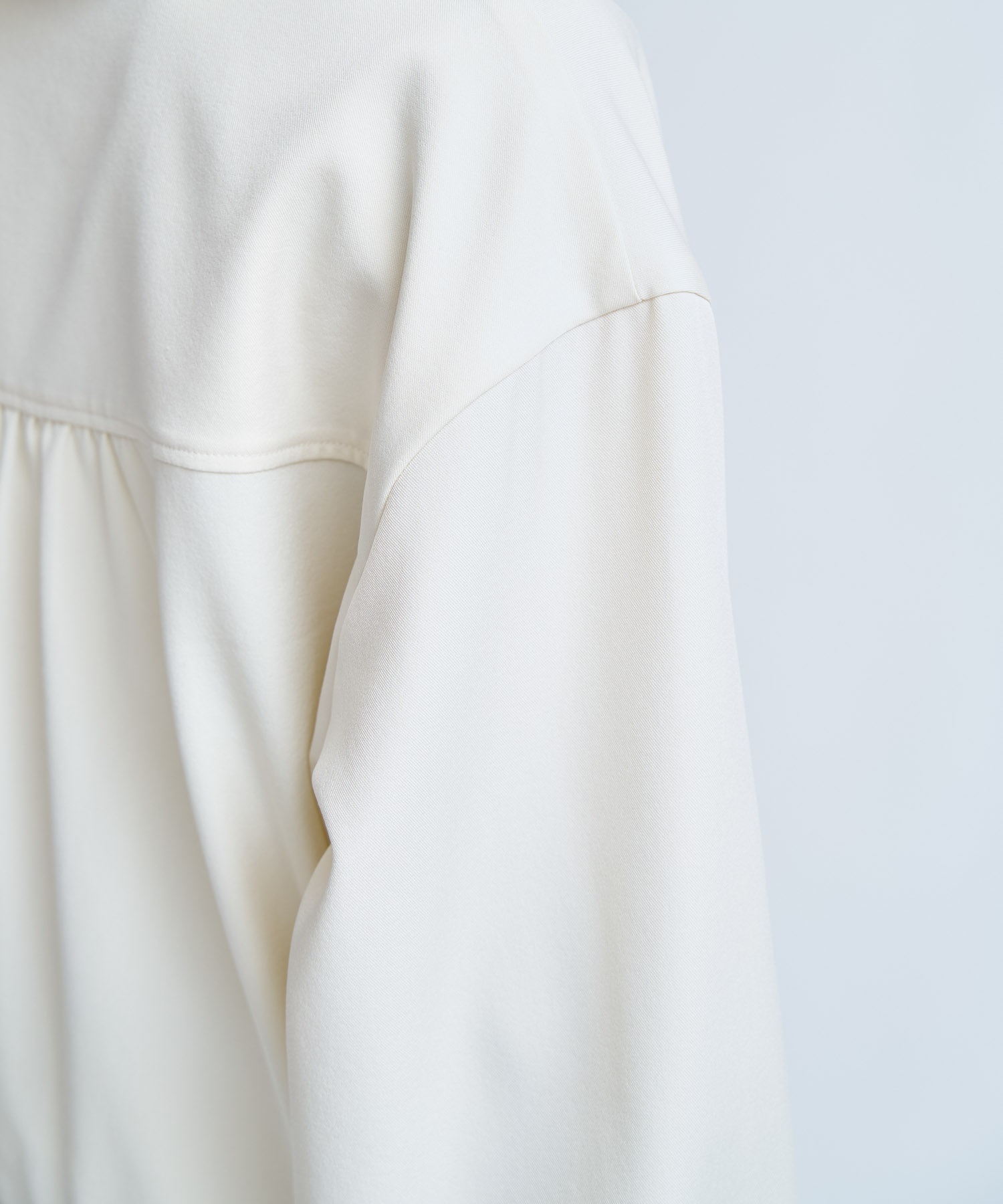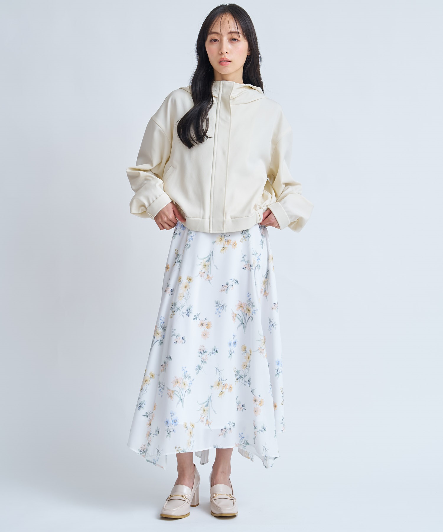 裾脇に施したゴムシャーリングがさりげないアクセントとなり、女性らしいバランスに仕上げました。