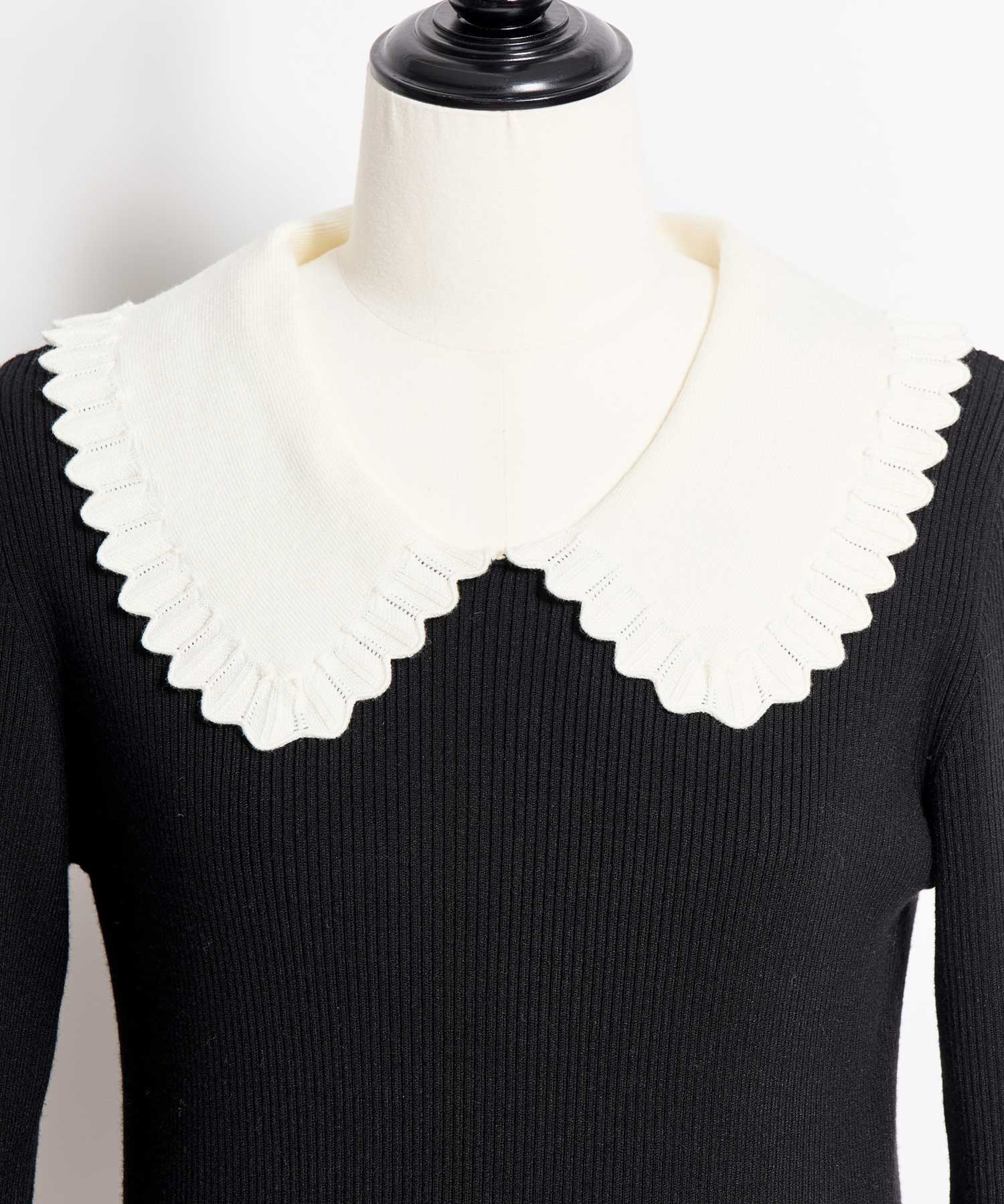 配色スカラップ襟が目を惹く、フェミニンムード漂うリブニットトップス。