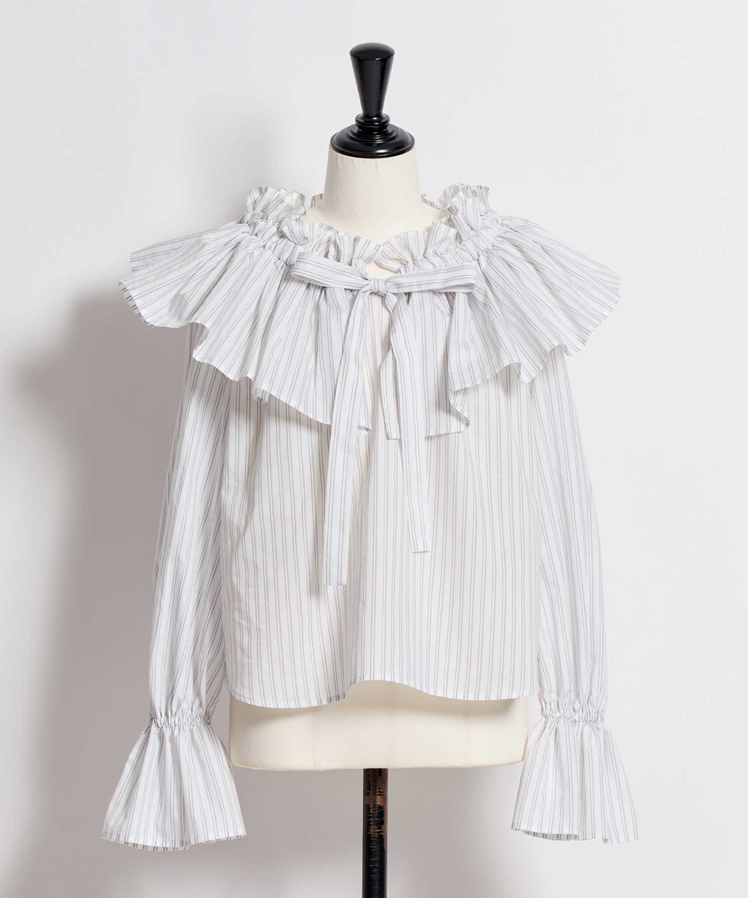 襟元と袖にあしらったフレアが、華やかで印象的なデザインブラウス。