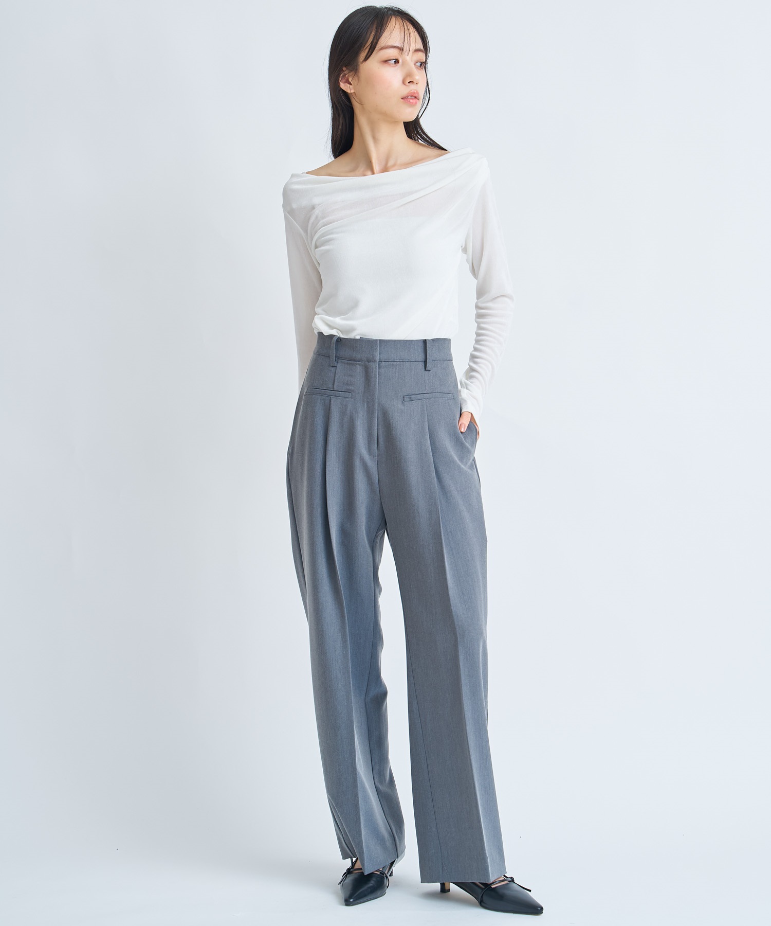 程よい透け感と落ち感のあるカットソー素材を使用したアシンメトリータック入りトップス。