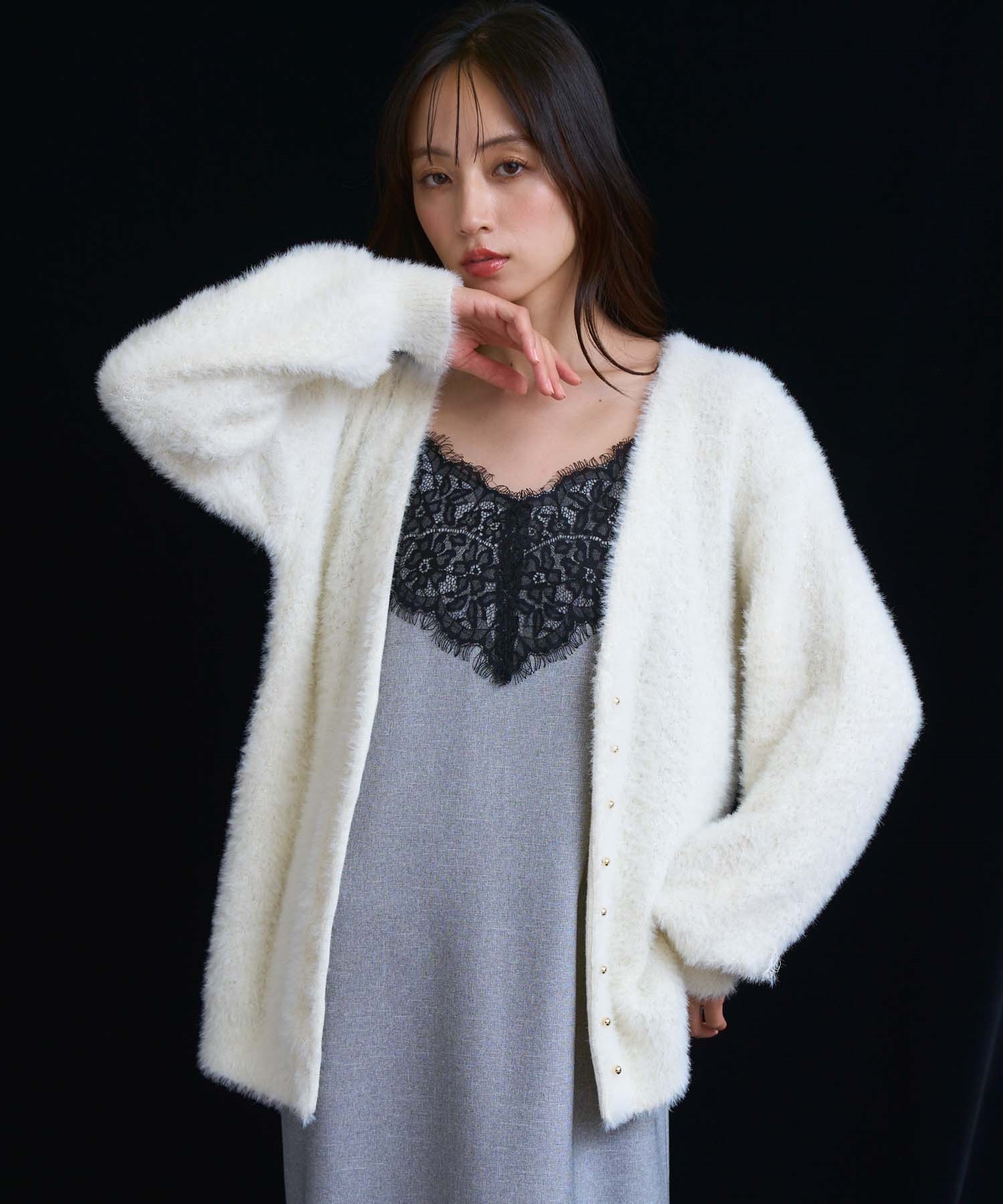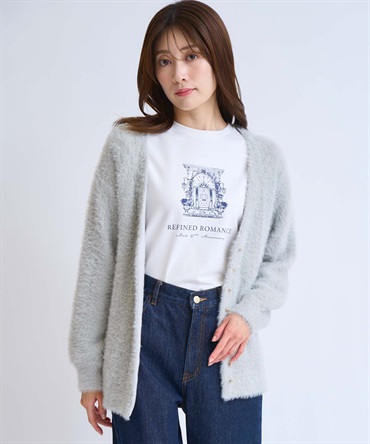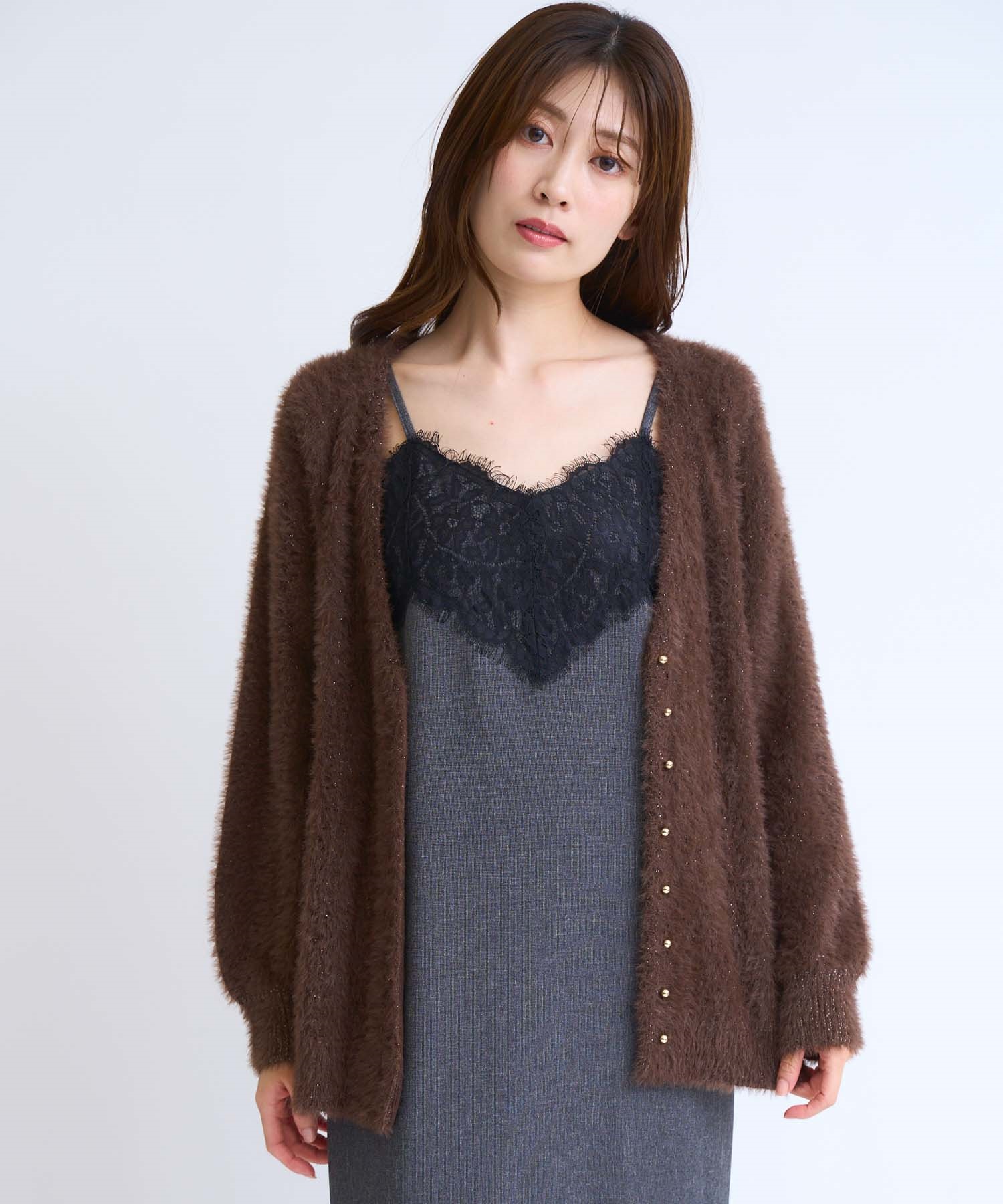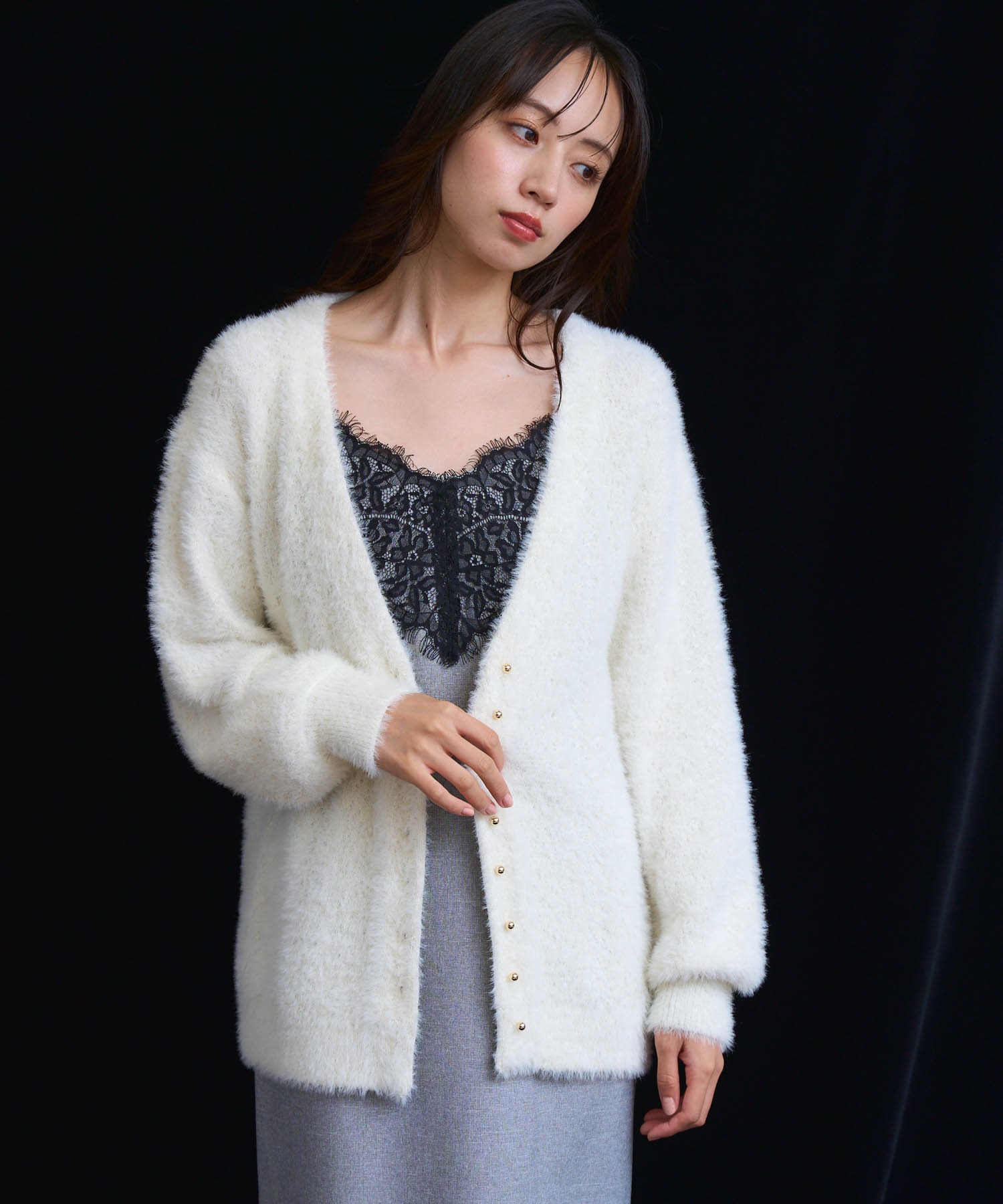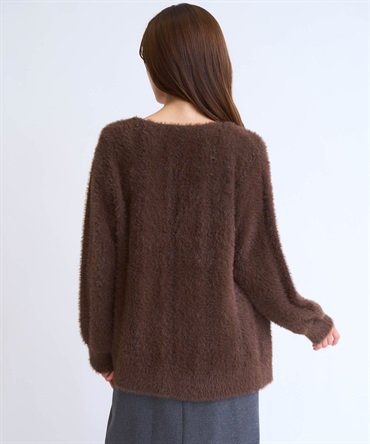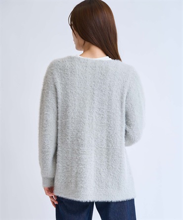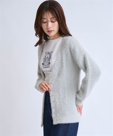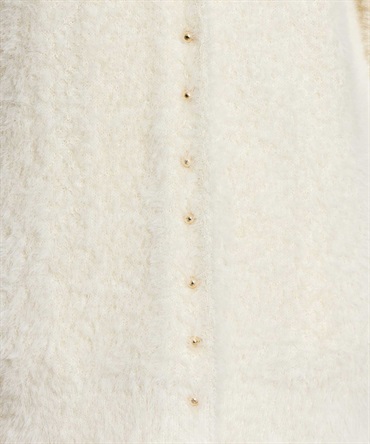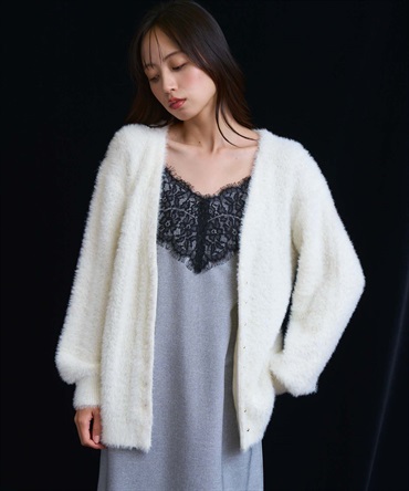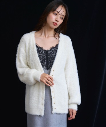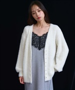 フェザーとラメ糸を織り交ぜた、華やかな表情のカーディガン。