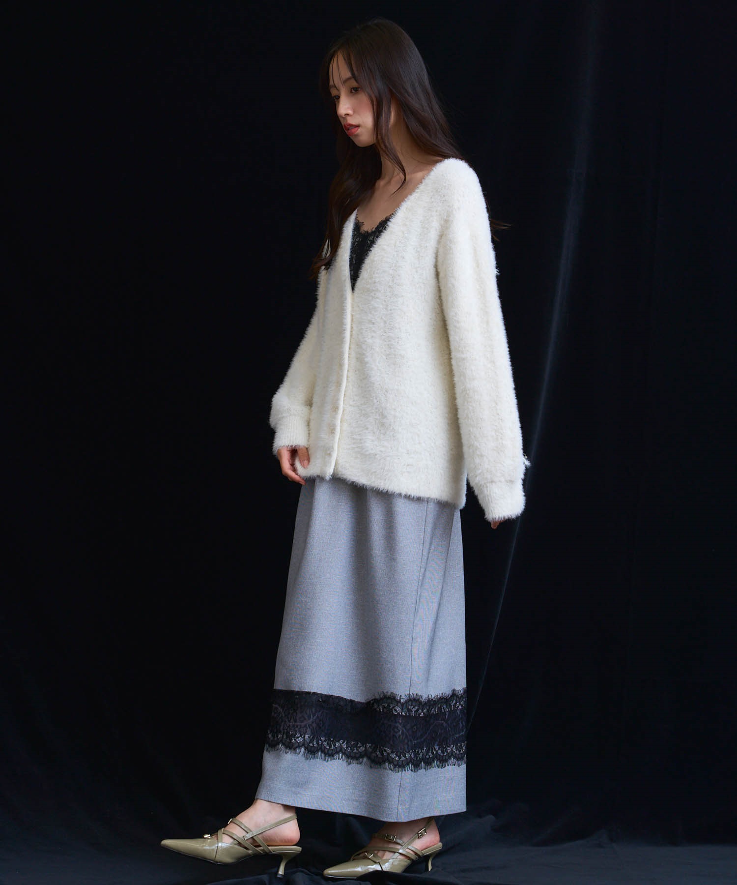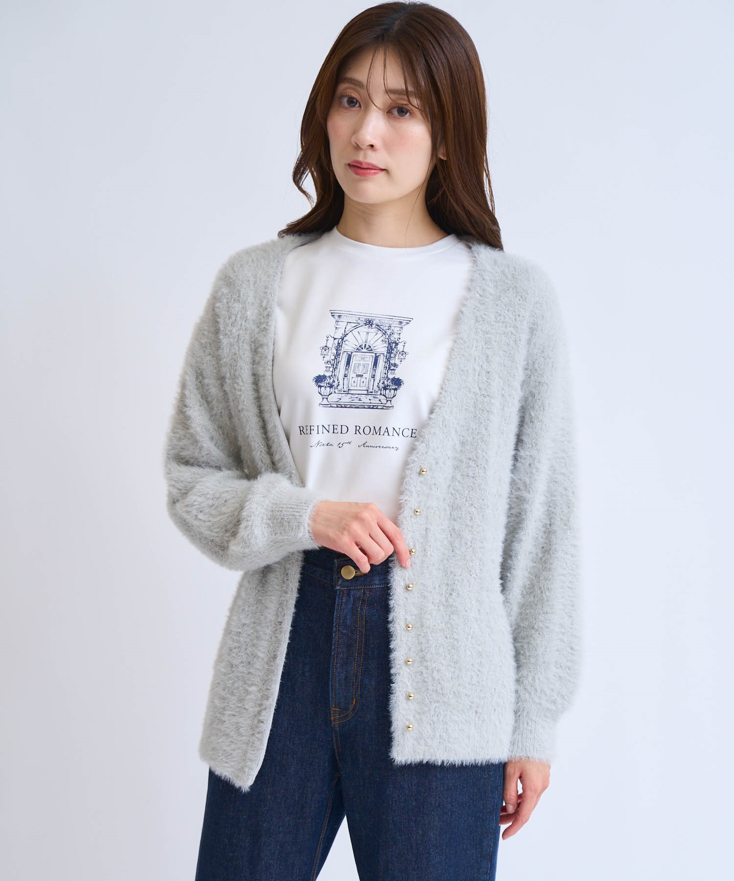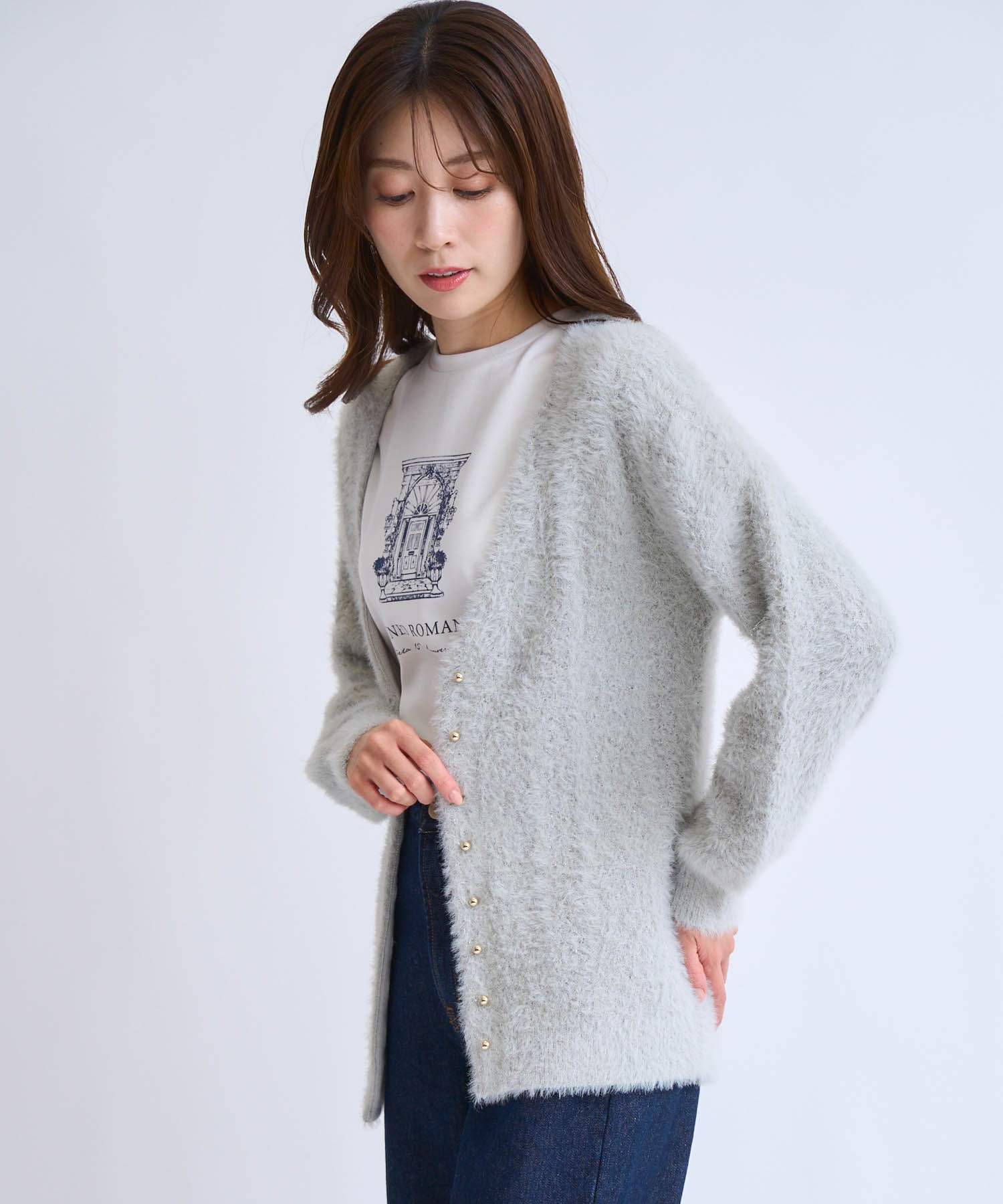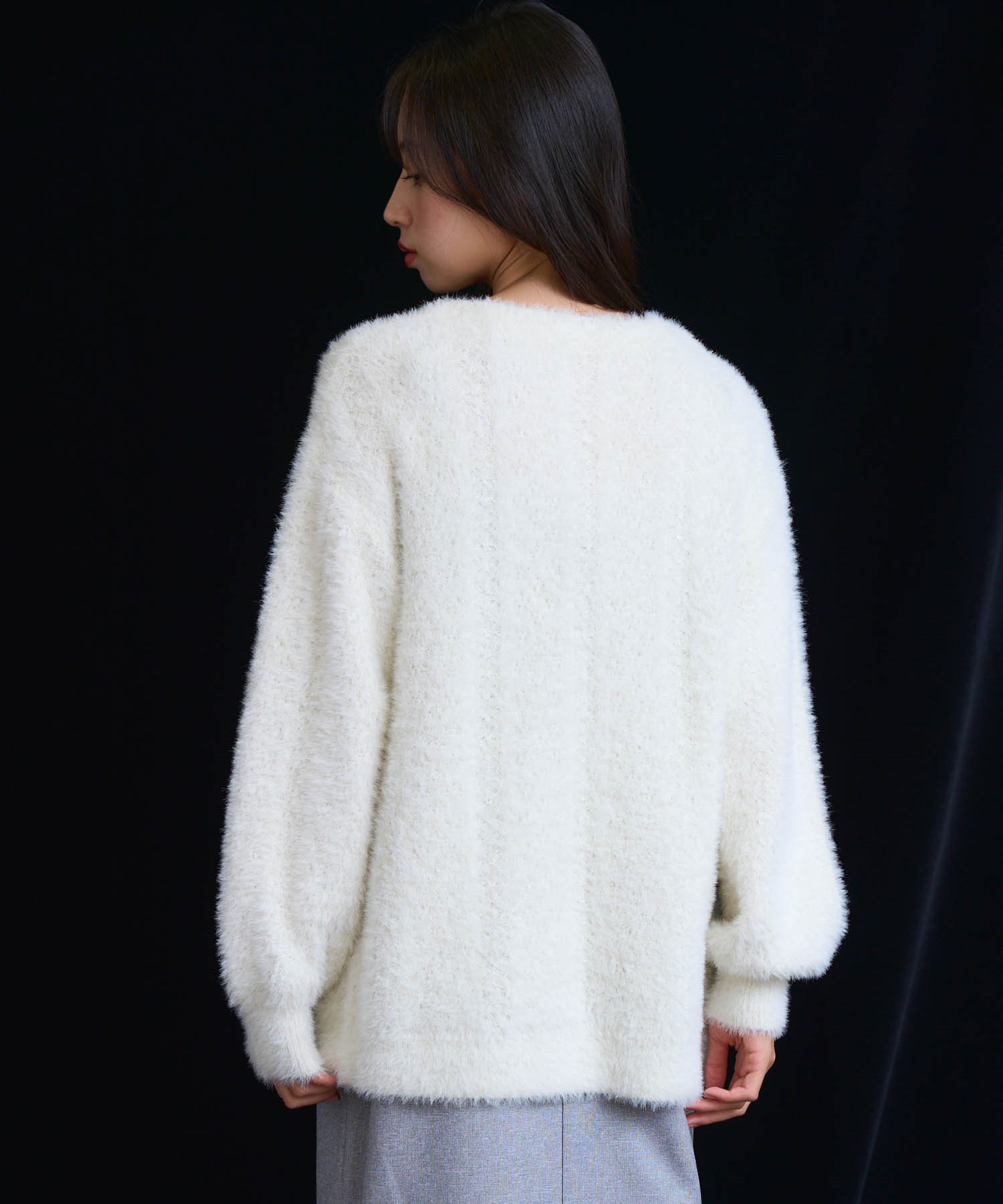 フェザーとラメ糸を織り交ぜた、華やかな表情のカーディガン。
