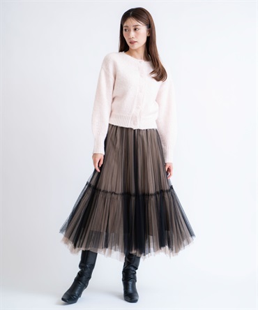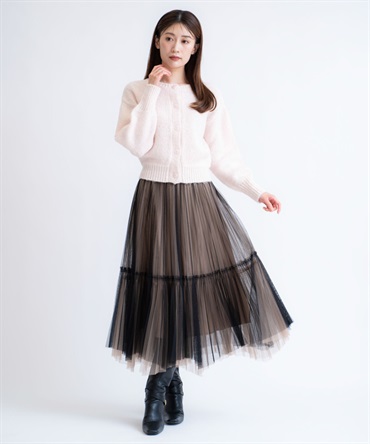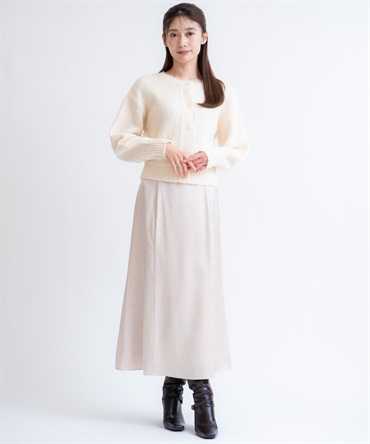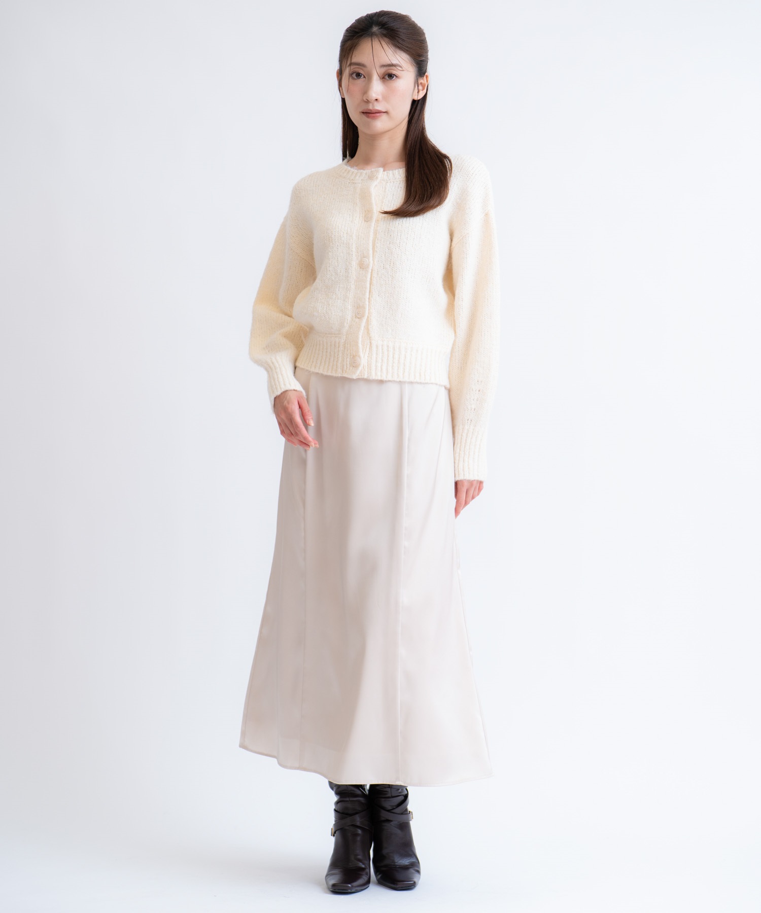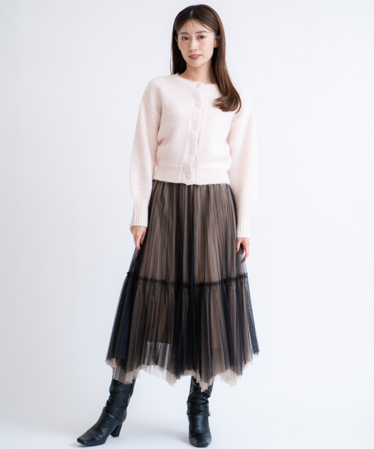 ふんわりとしたボリュームスカートと合わせて、女性らしいコーディネートに仕上げて。
