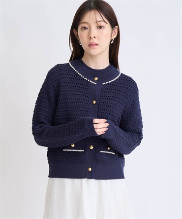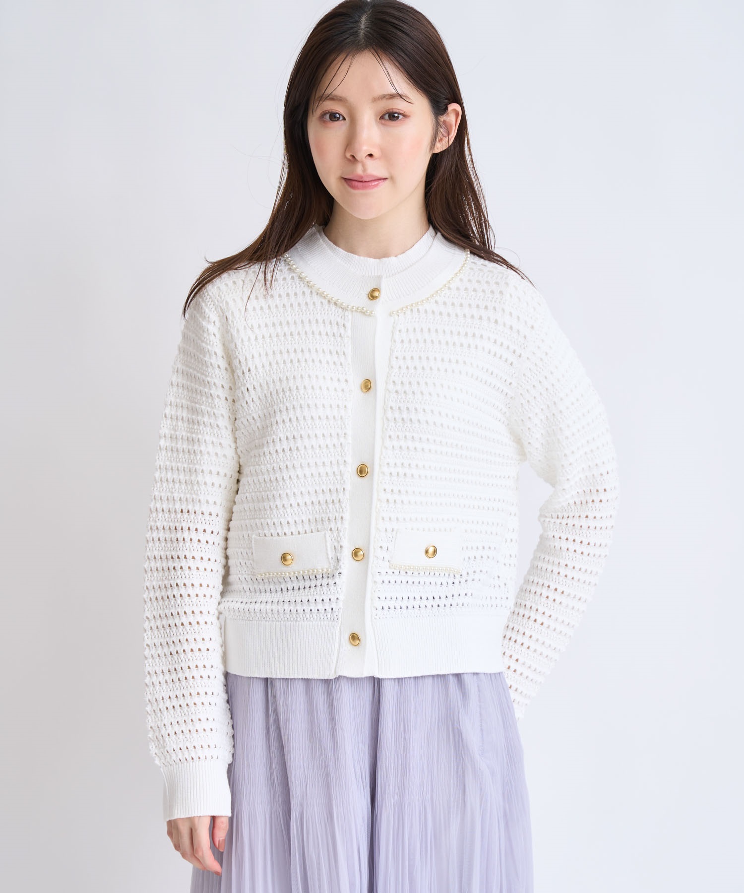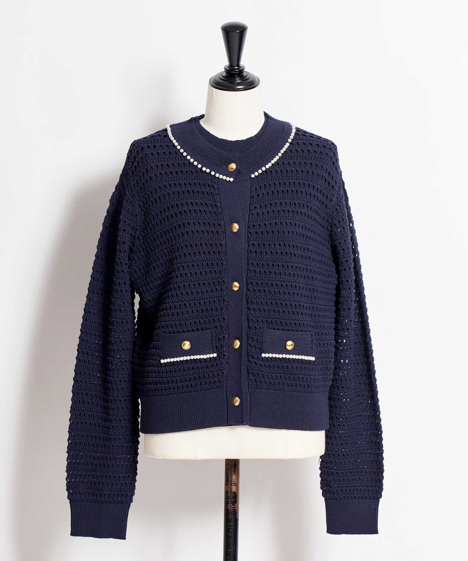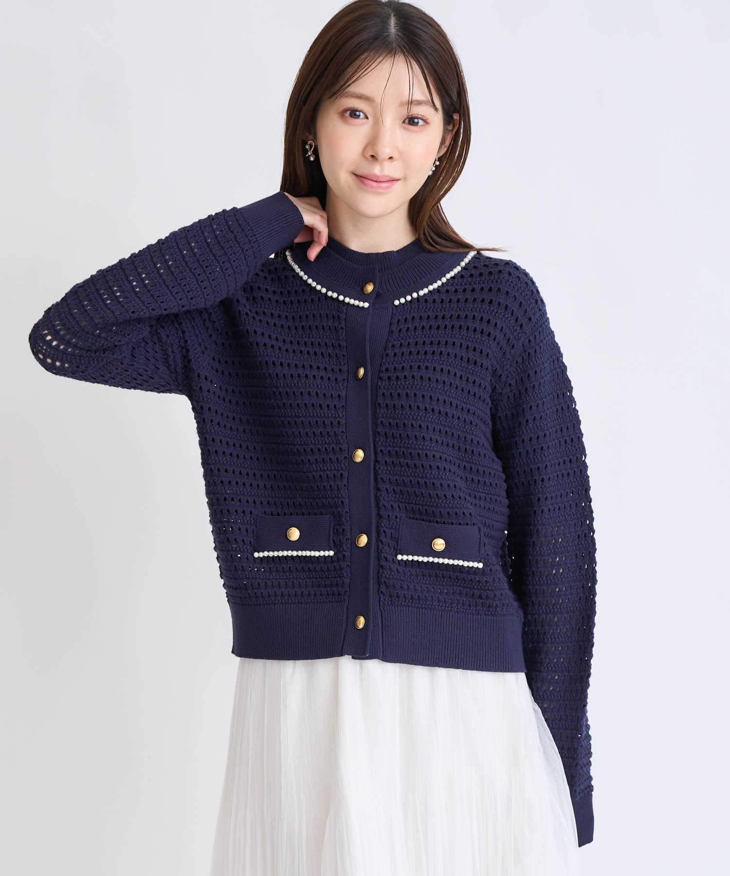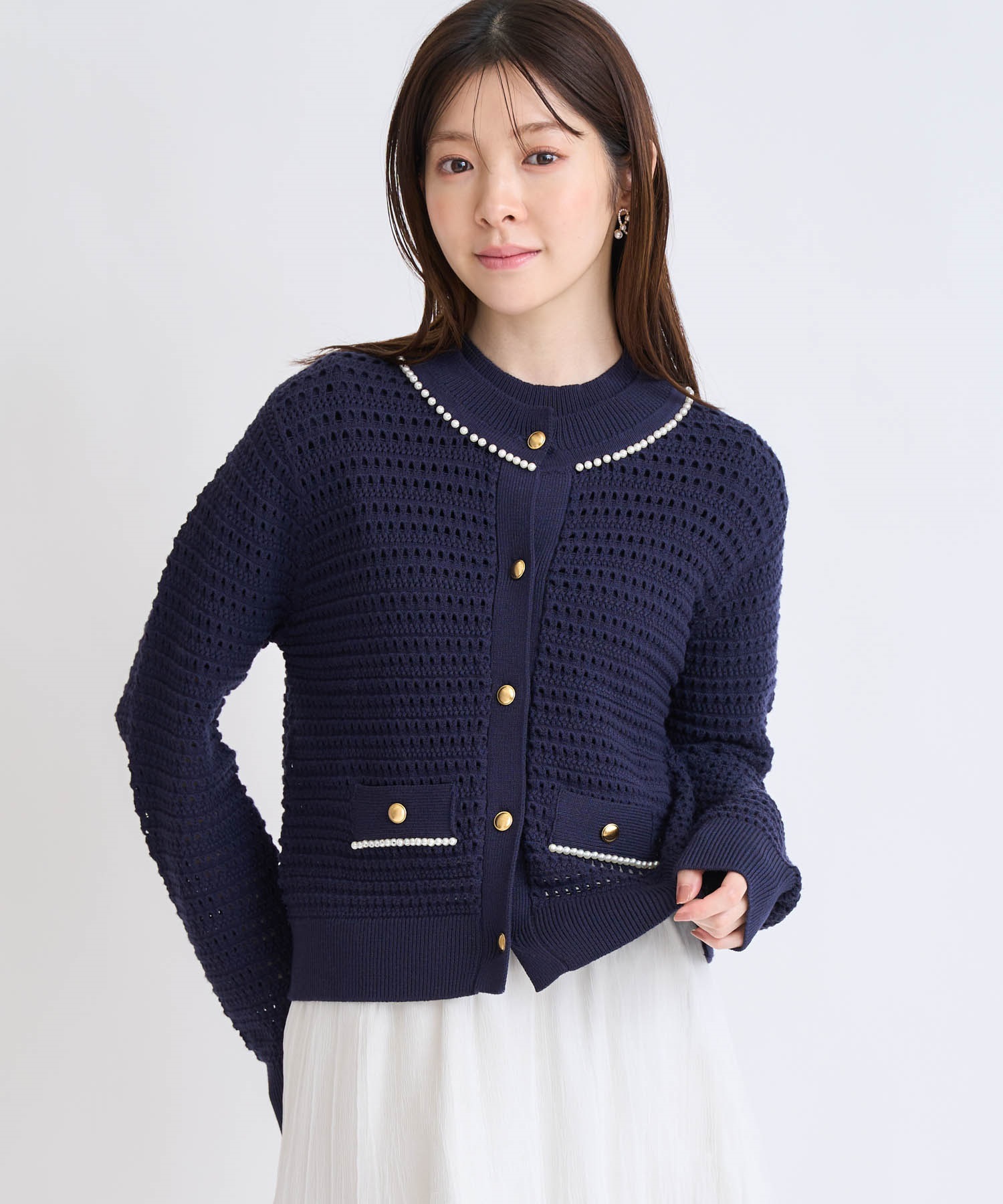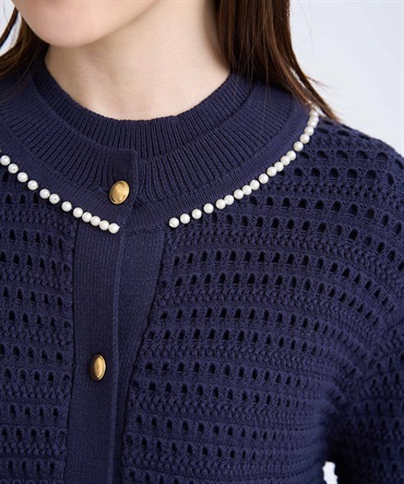 レース編みとパールの縫い付けが華やかなニットカーディガン。