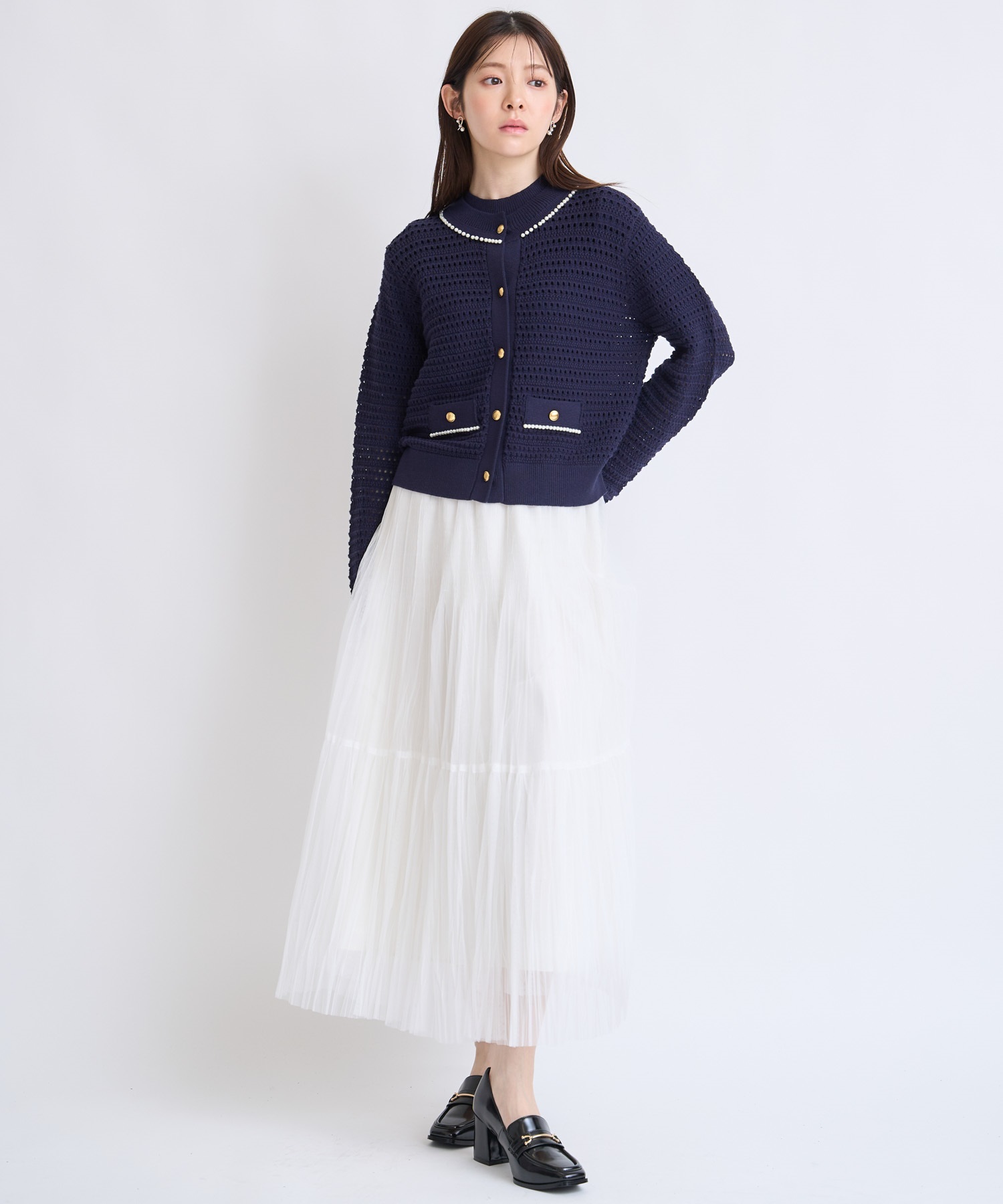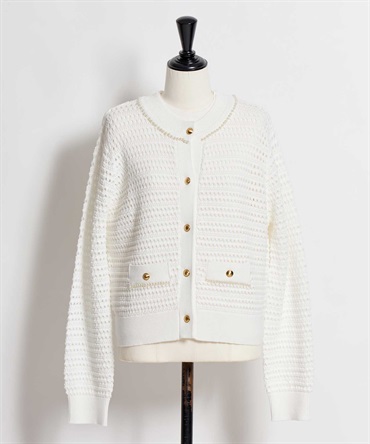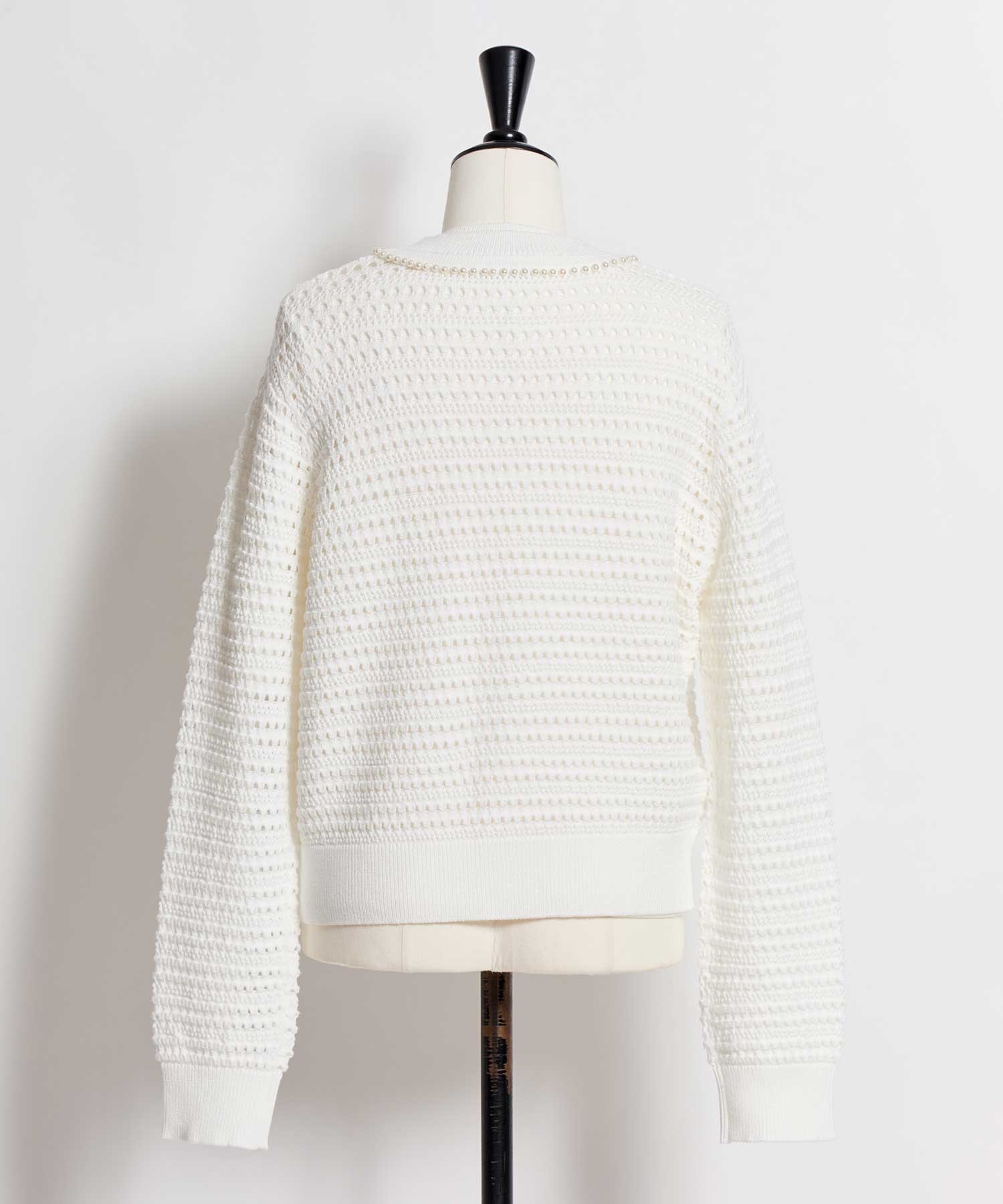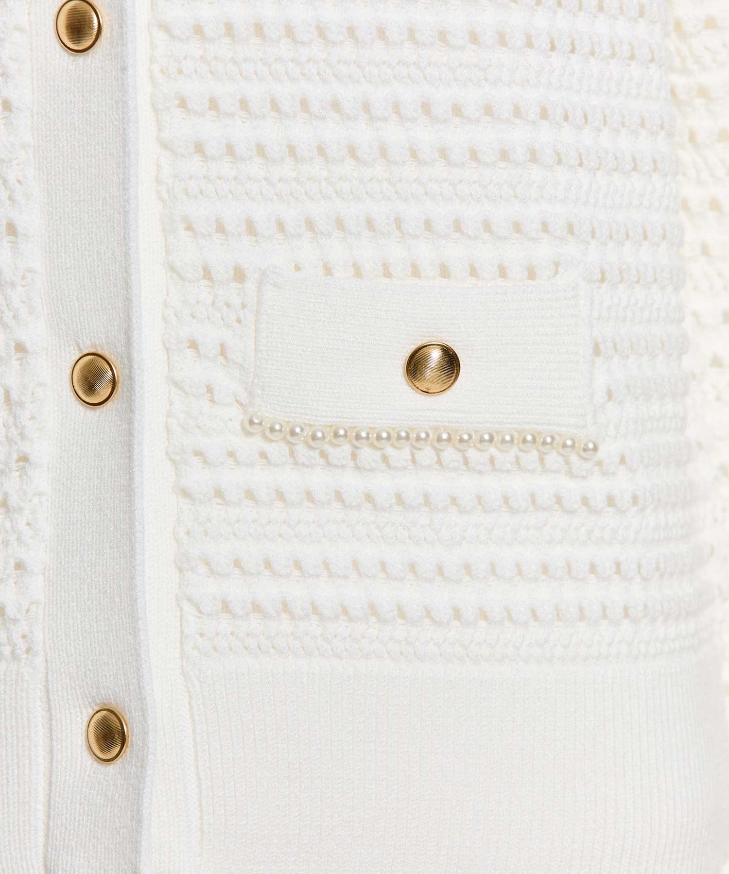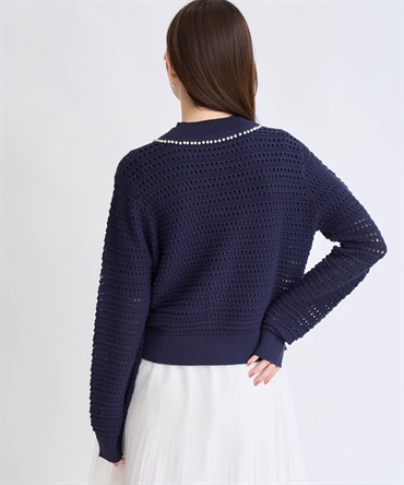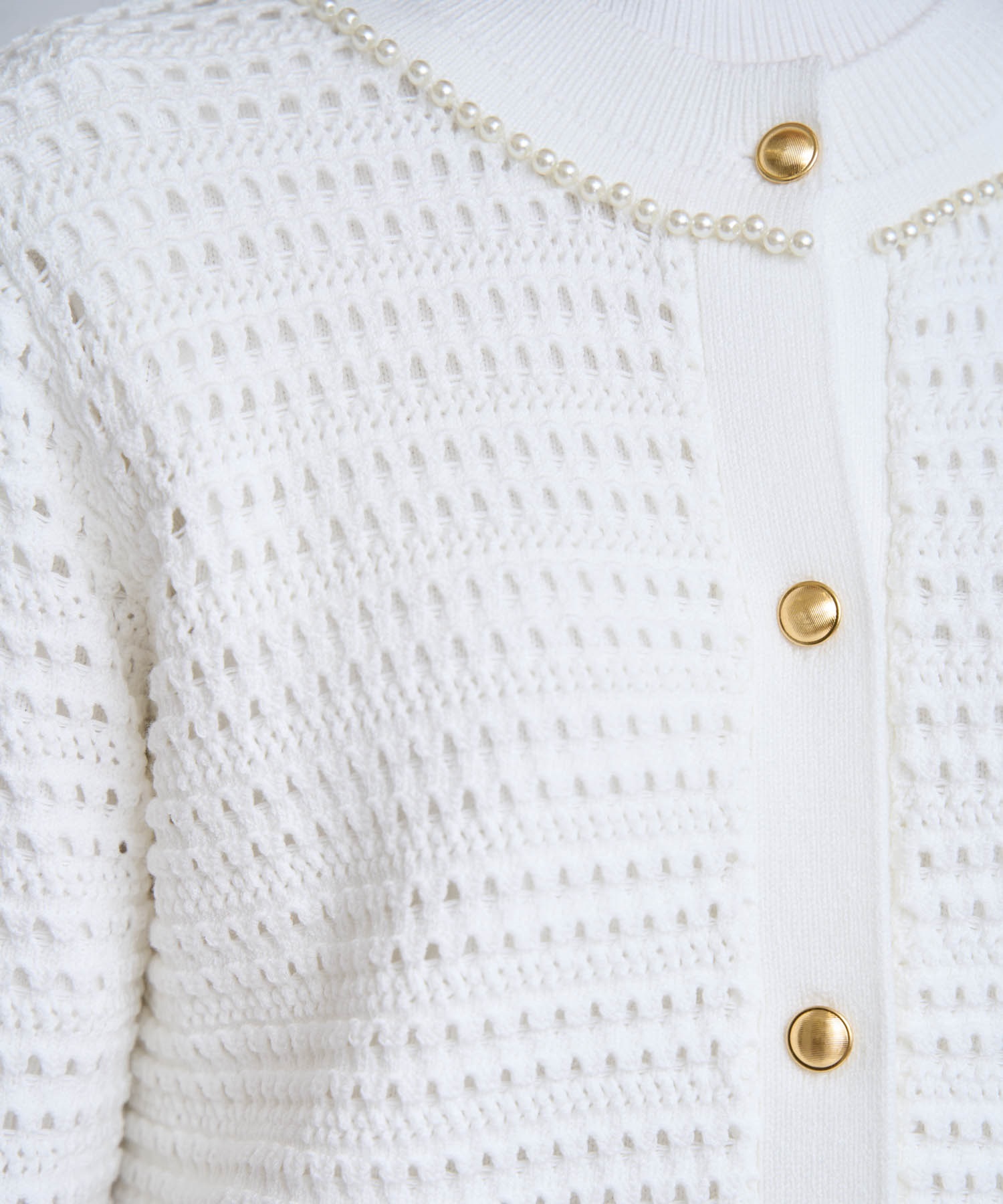 レース編みとパールの縫い付けが華やかなニットカーディガン。