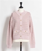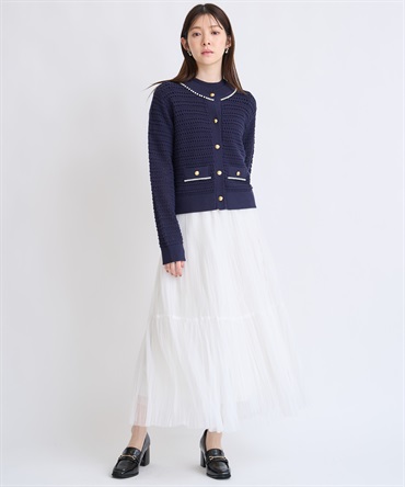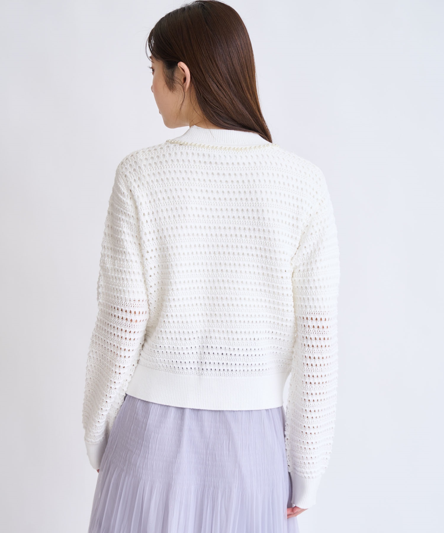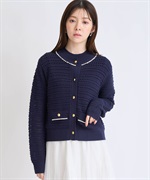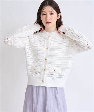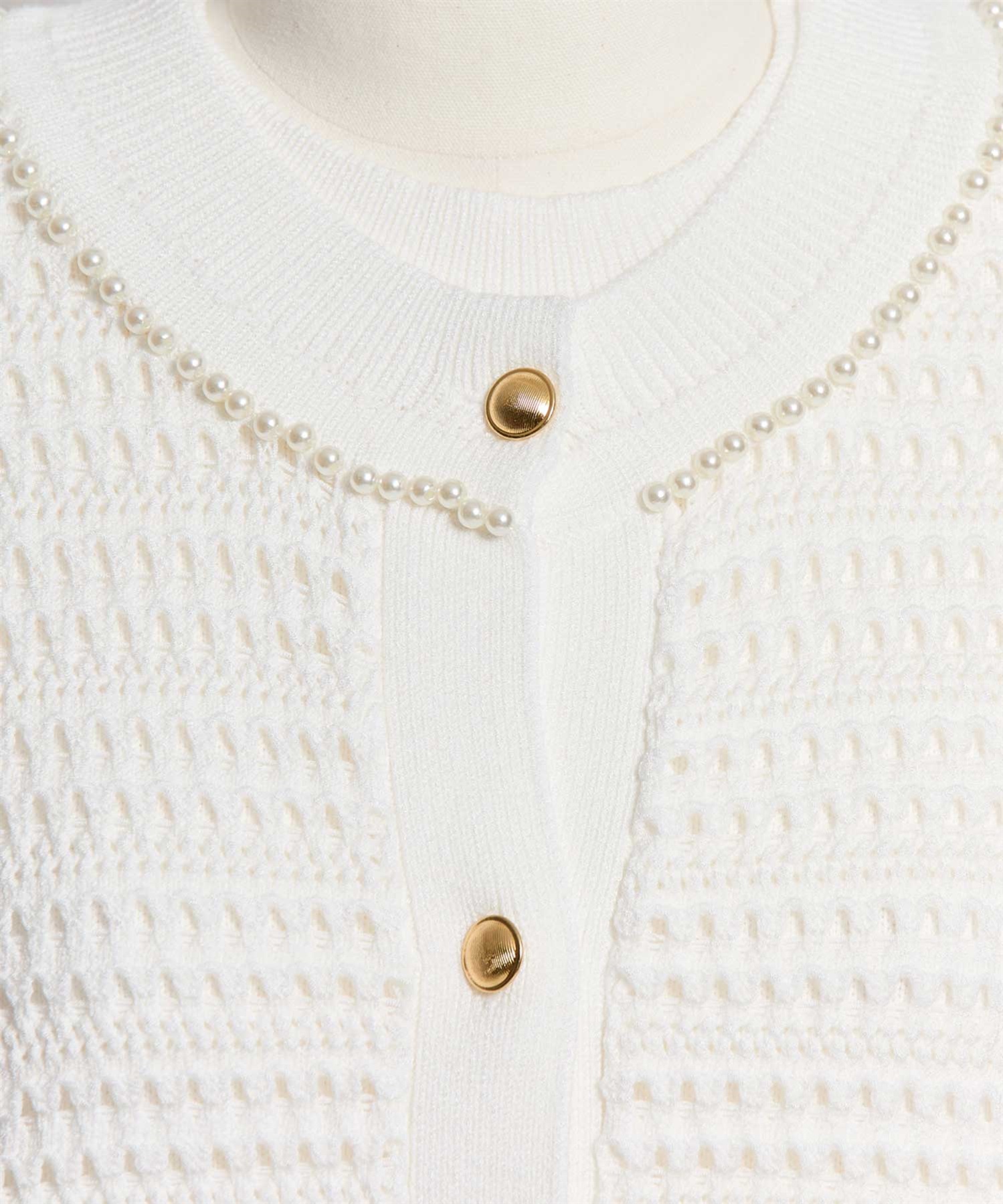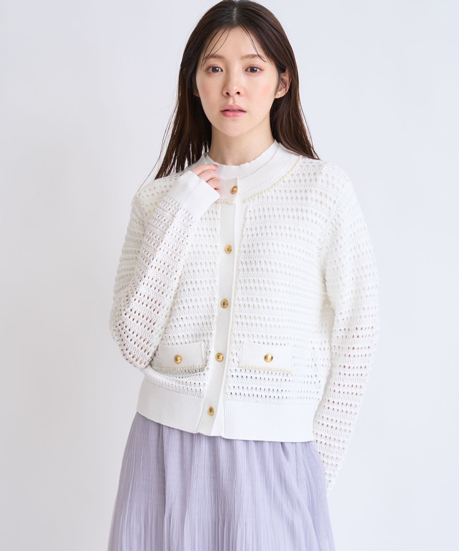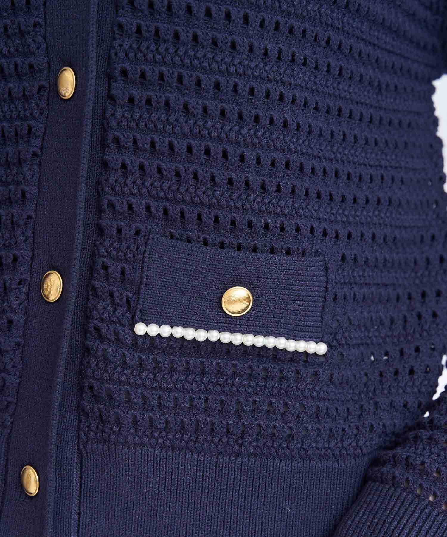 レース編みとパールの縫い付けが華やかなニットカーディガン。