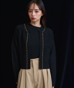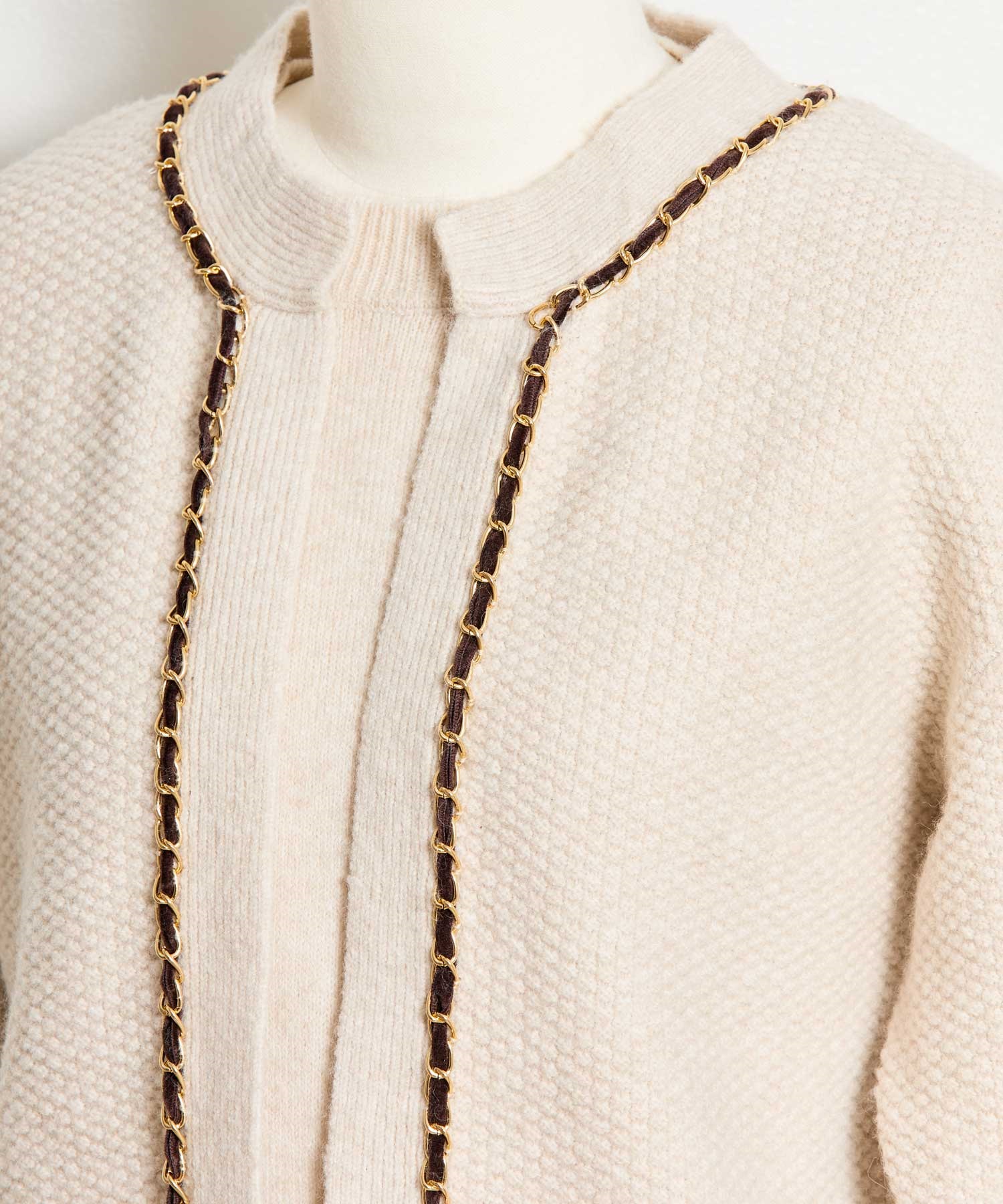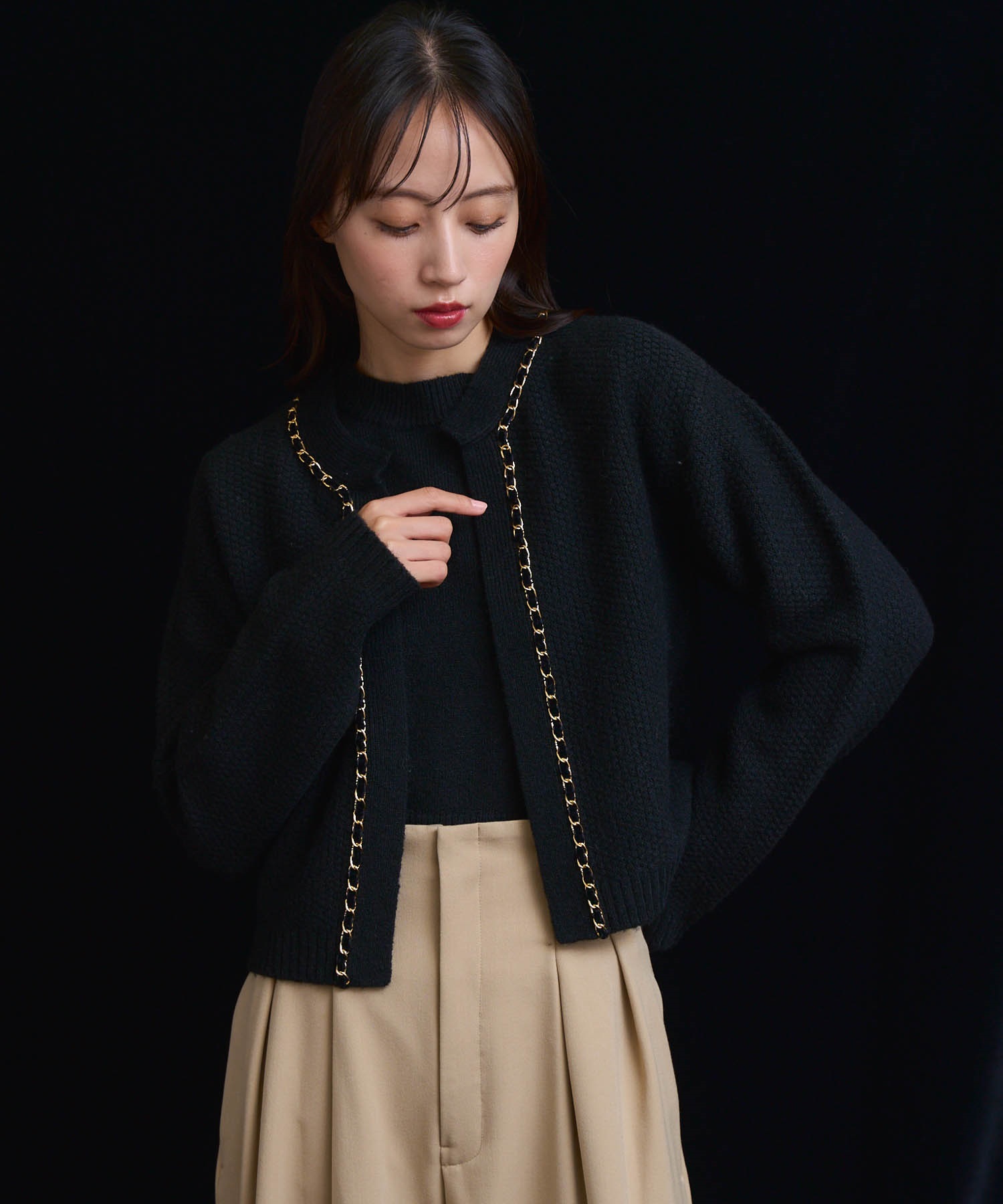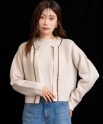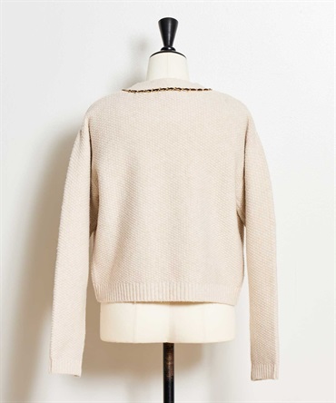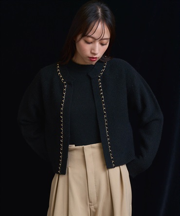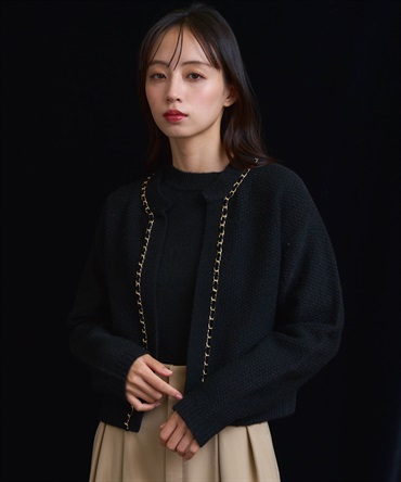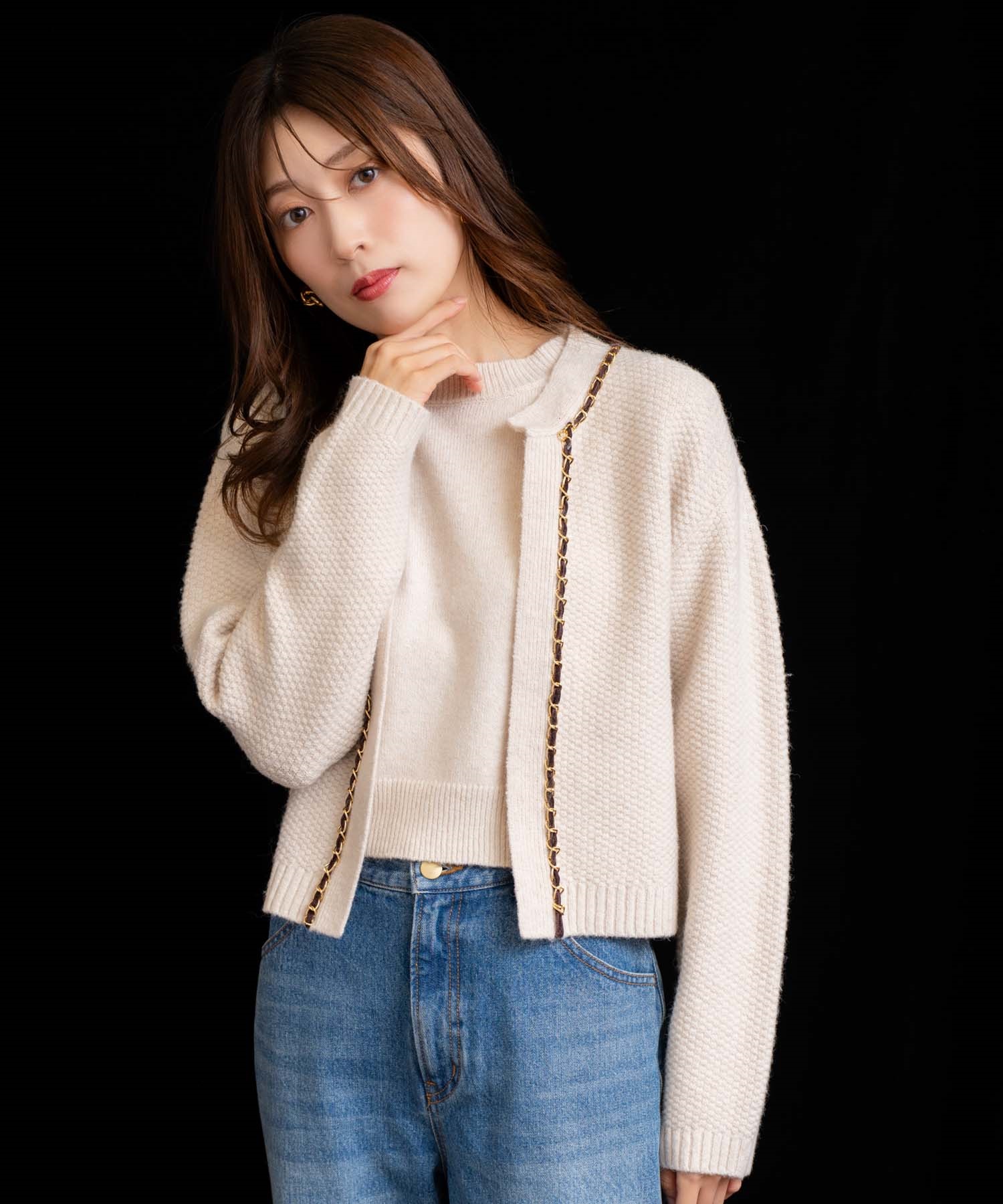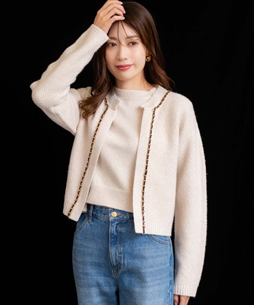 ベロア素材とチェーンブレードをあしらった、上品なニットアンサンブル。