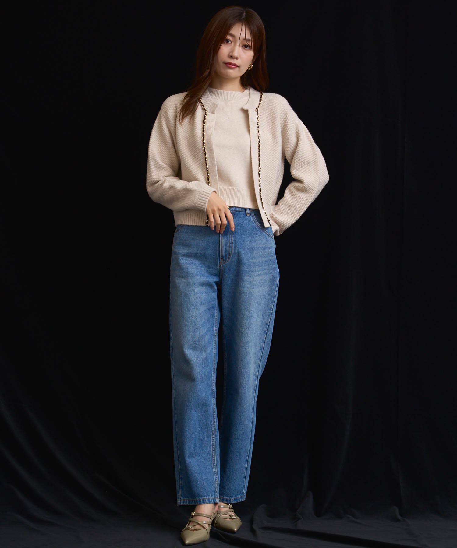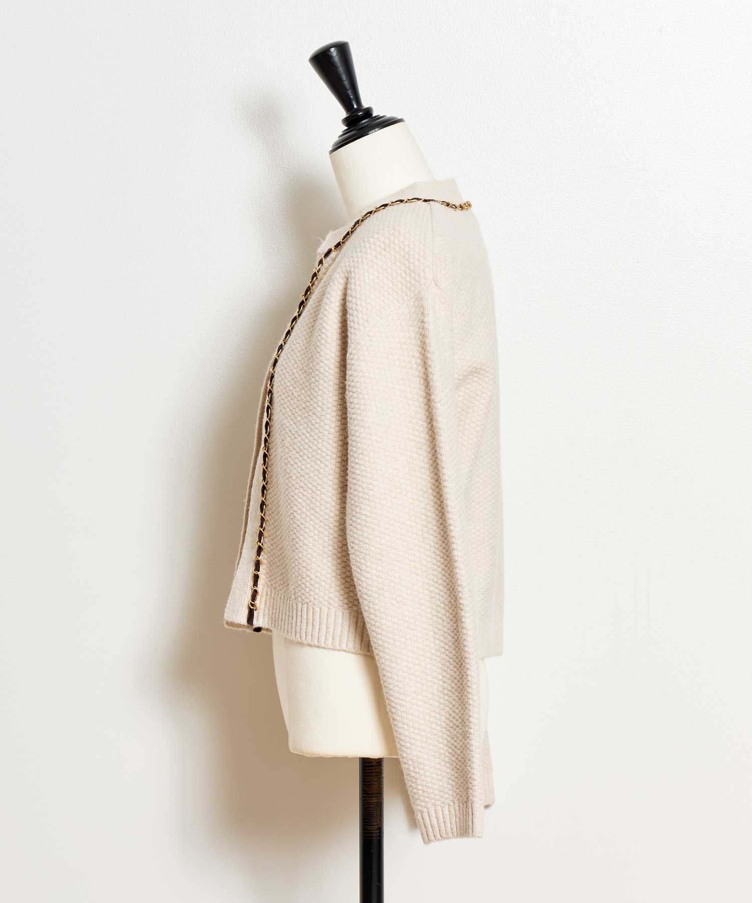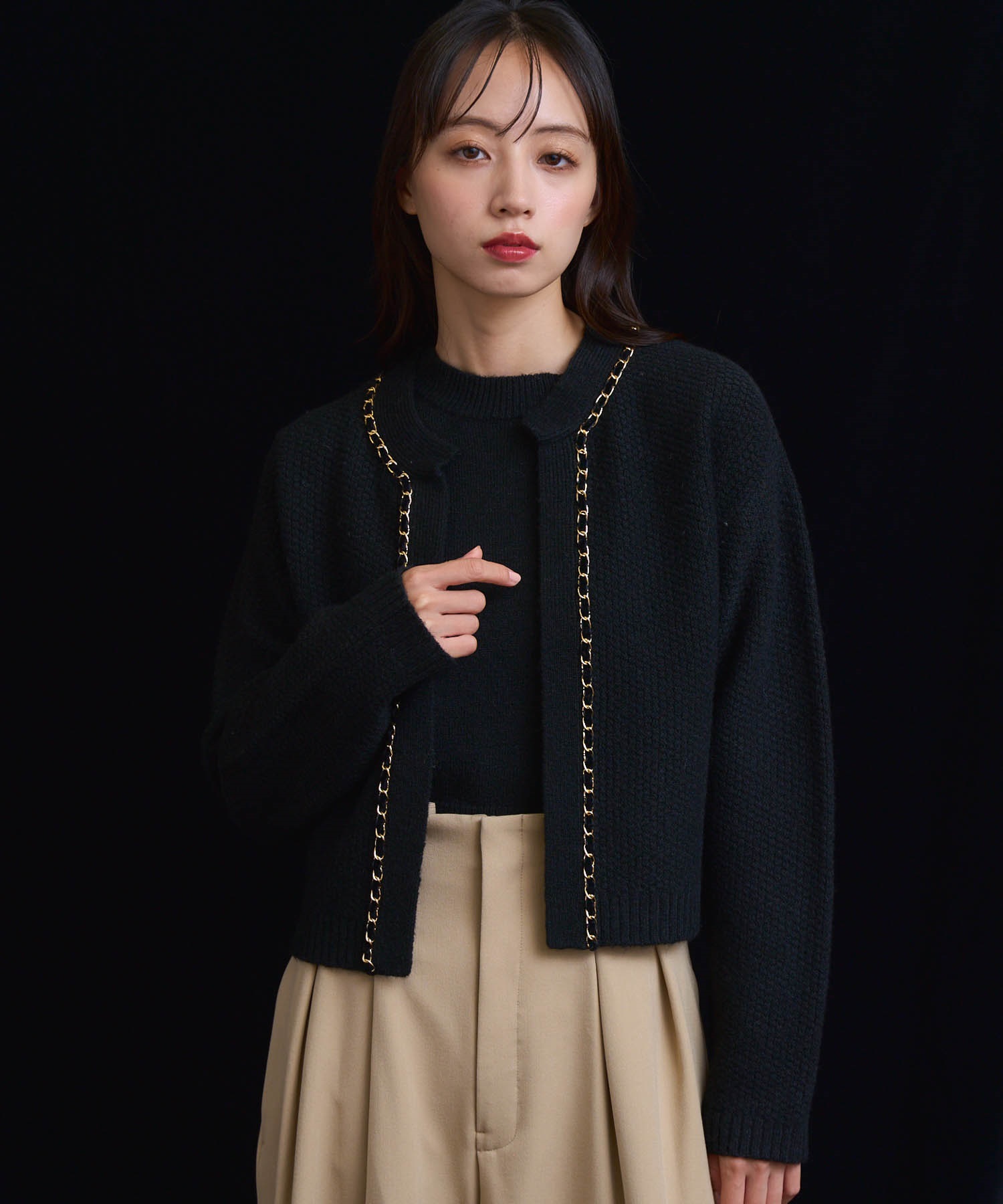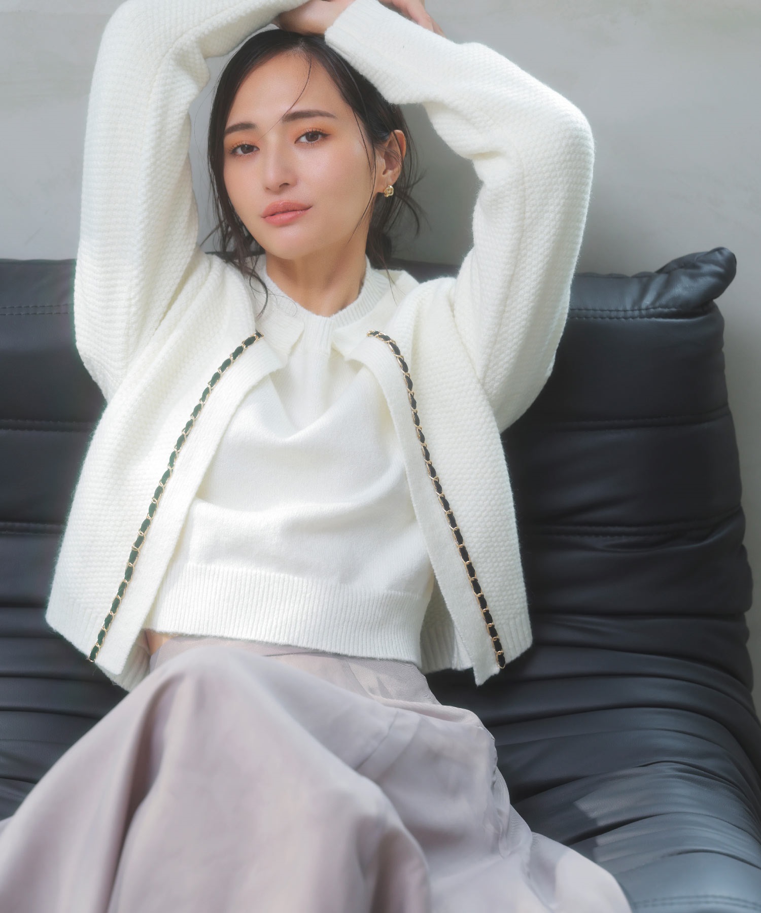 ベロア素材とチェーンブレードをあしらった、上品なニットアンサンブル。