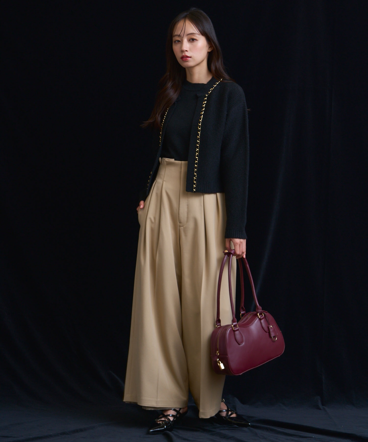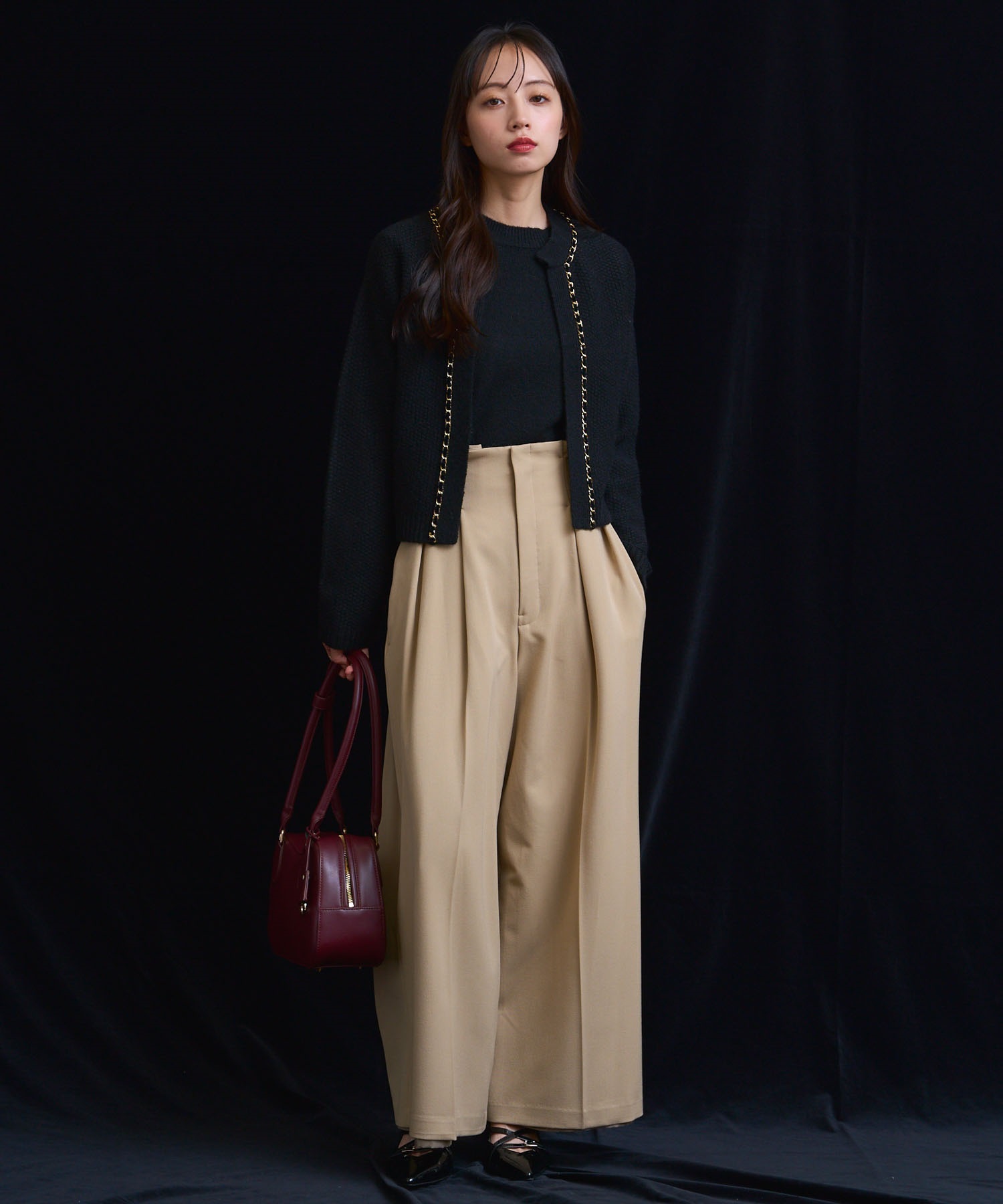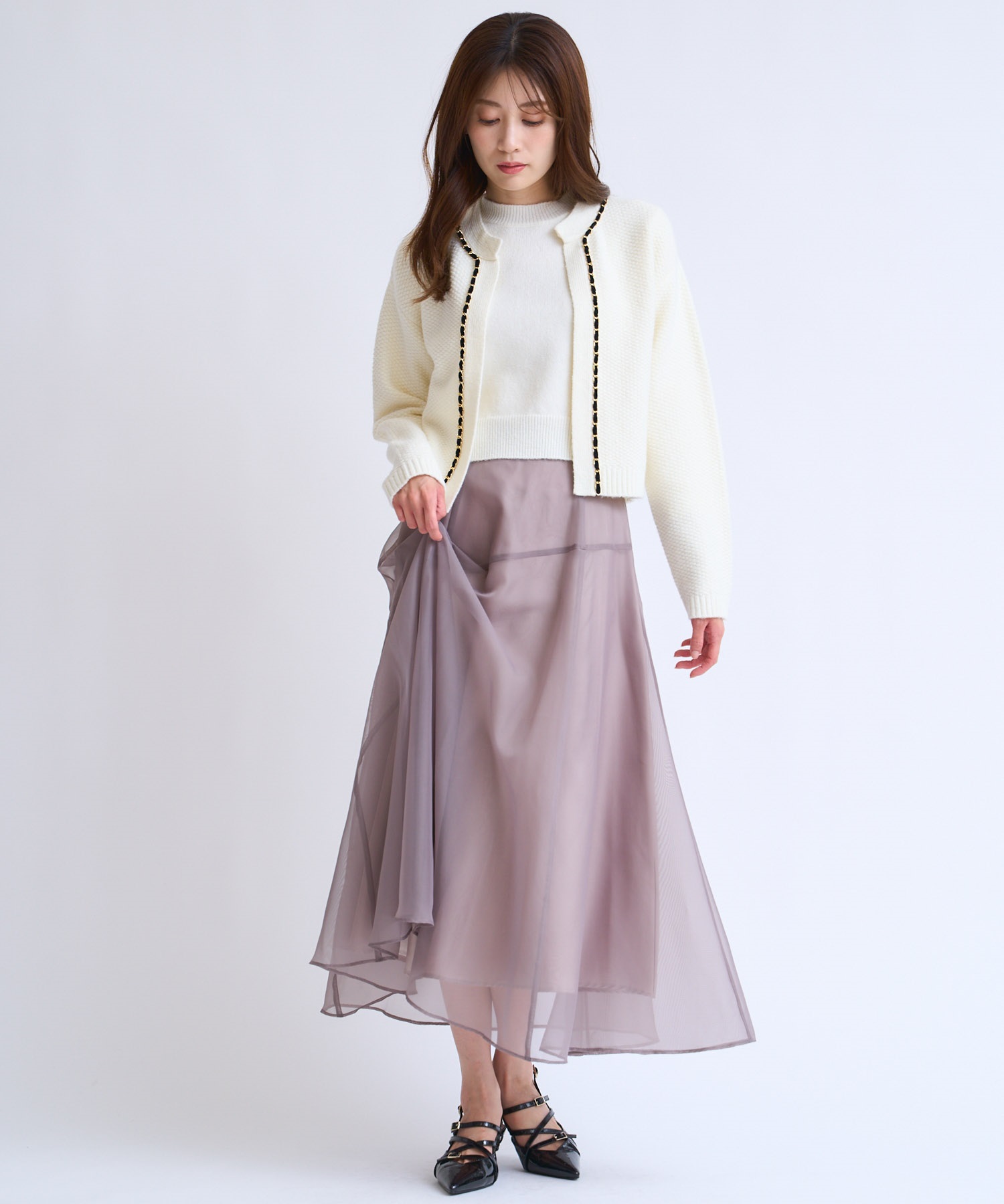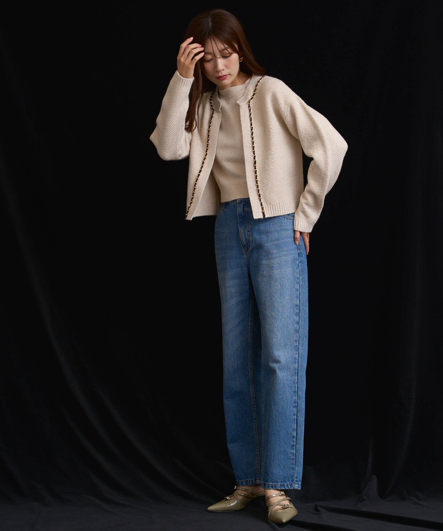 ベロア素材とチェーンブレードをあしらった、上品なニットアンサンブル。