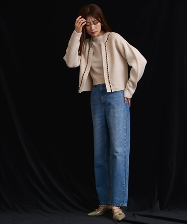 カーディガンは鹿の子編み、インナーは天竺編みで、編地の異なる表情が程よいカジュアル感をプラス。