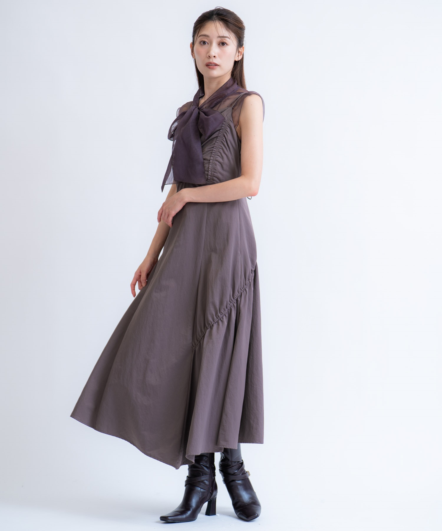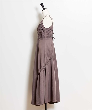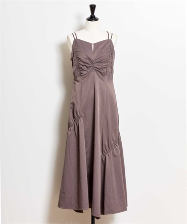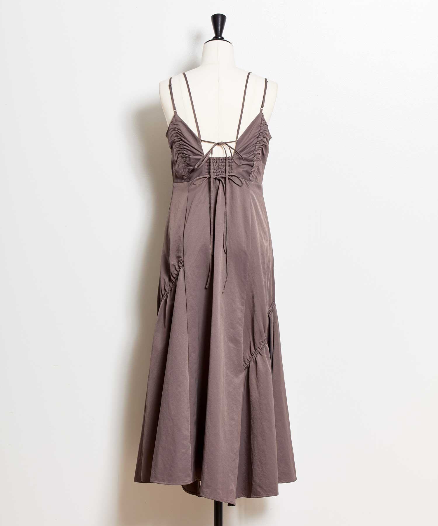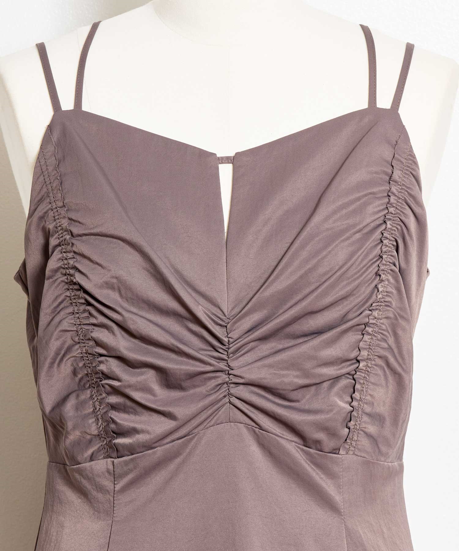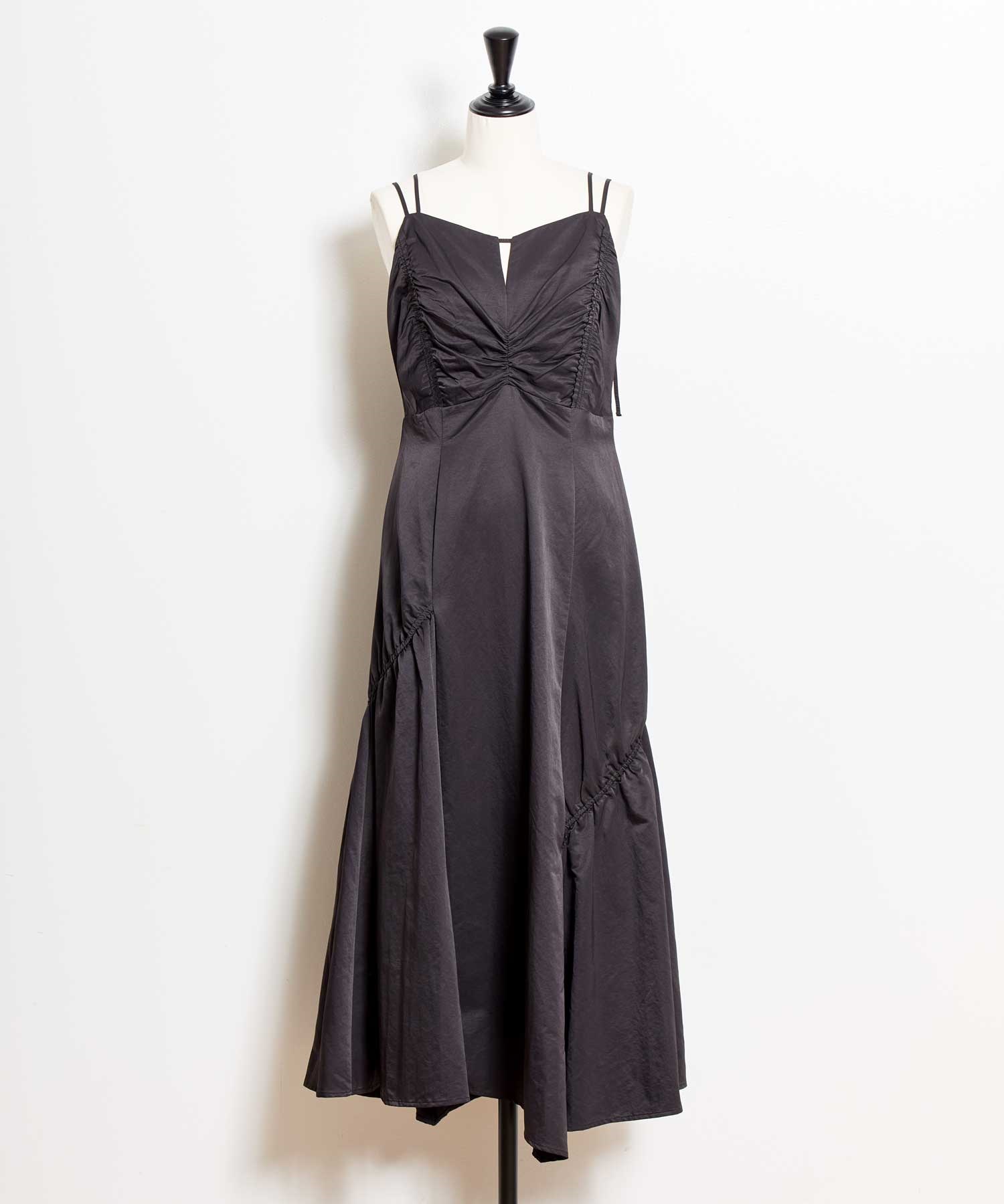 胸元とスカートにシャーリングデザインのあるキャミワンピース。つやとハリ感のある素材で、季節の変わり目にも活躍する一枚です。