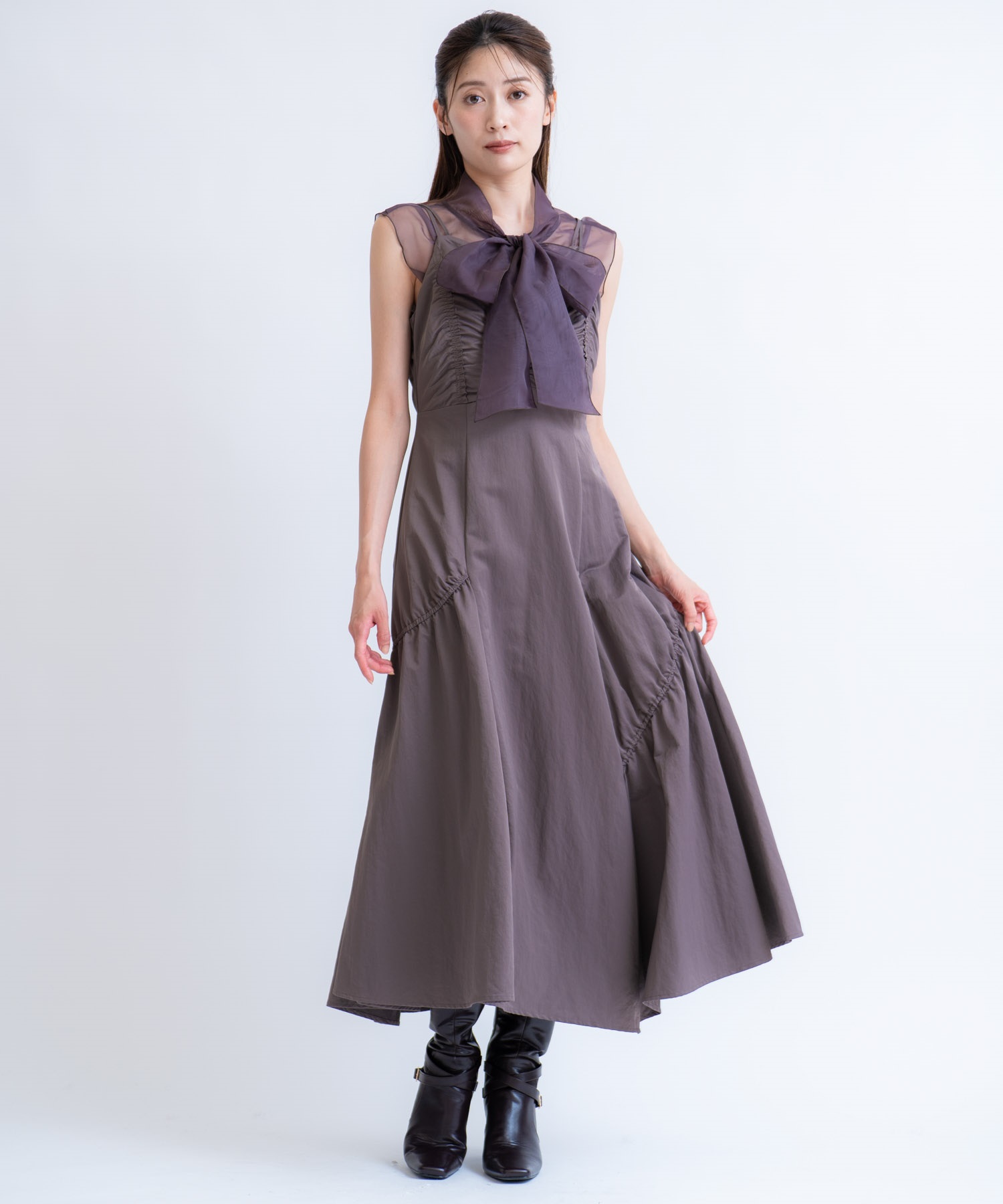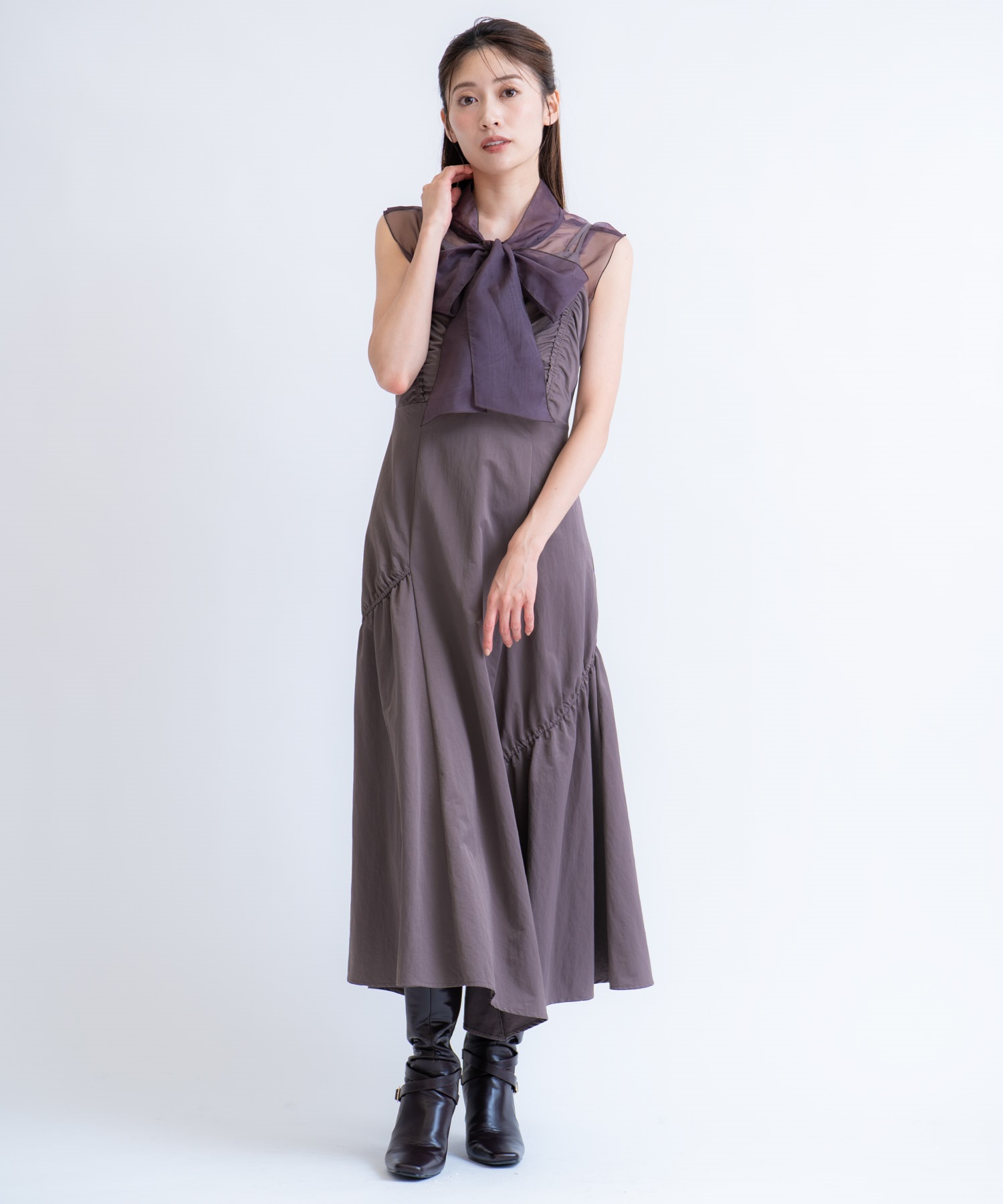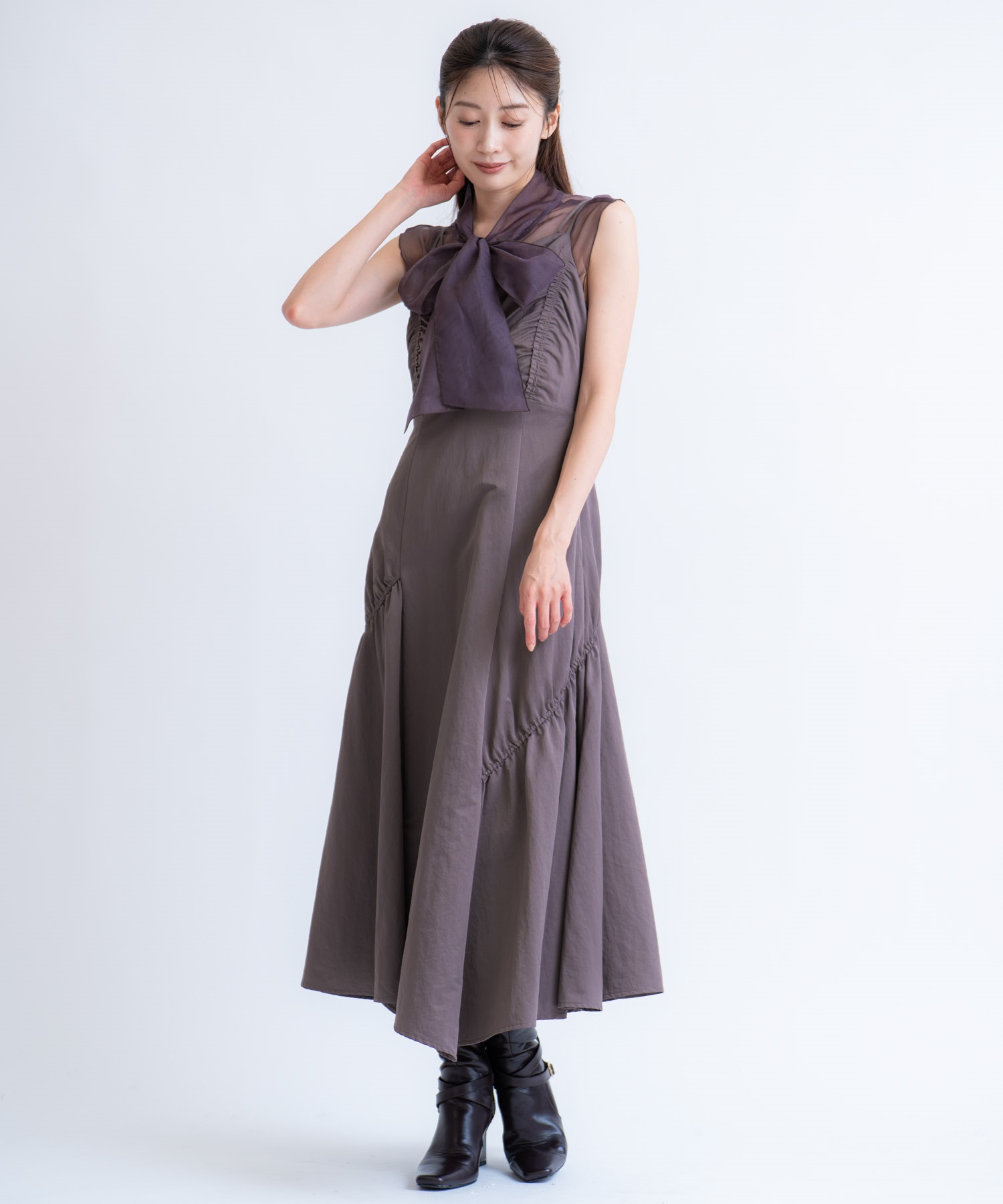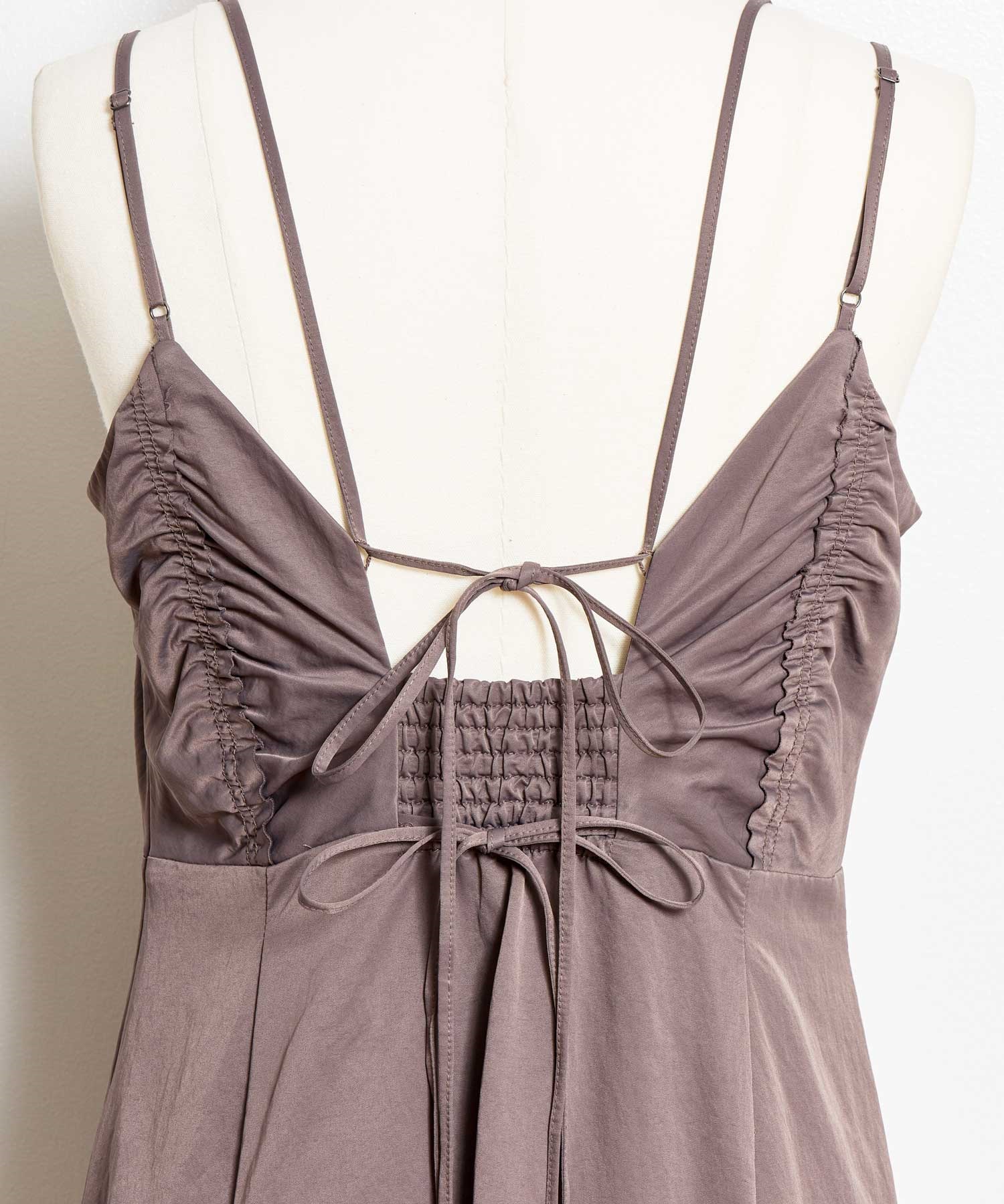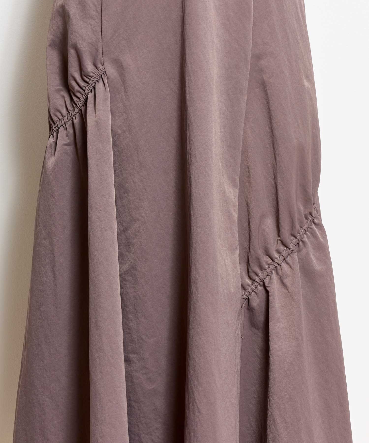胸元とスカートにシャーリングデザインのあるキャミワンピース。つやとハリ感のある素材で、季節の変わり目にも活躍する一枚です。