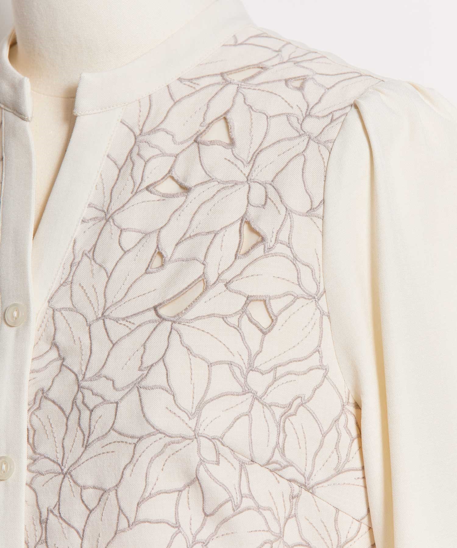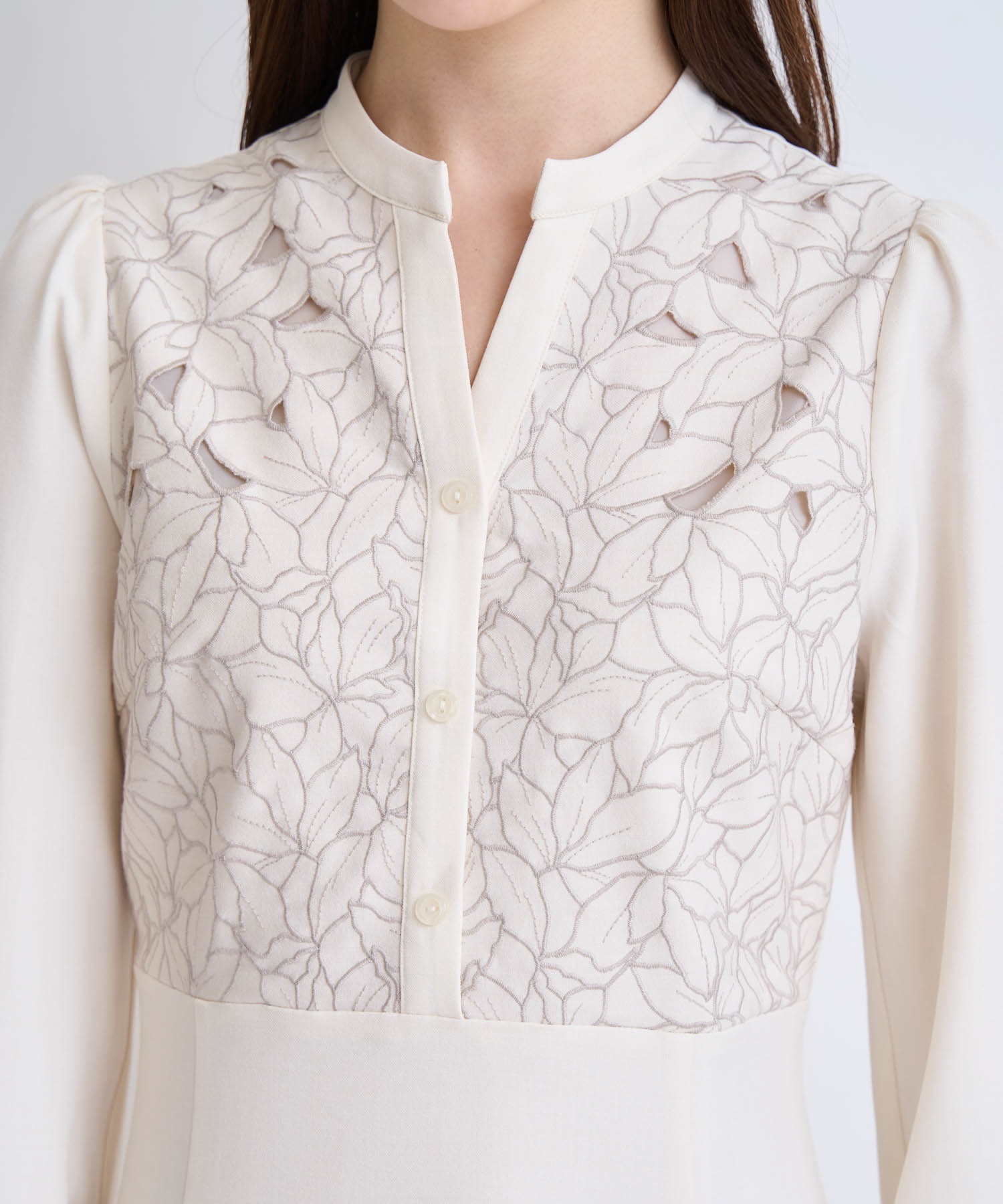 前身頃の刺繍はカットワークにより奥行きのある表情を演出。