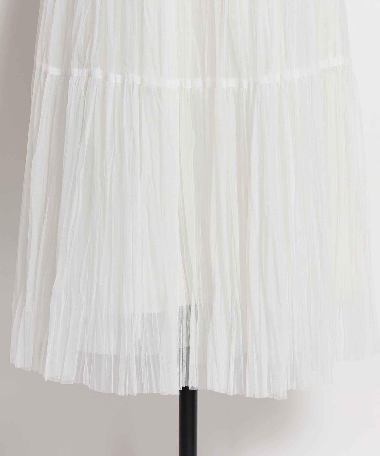 【着用感】:白は透け防止のために4枚生地になっています。チュール×プリーツでふわっとした印象ですが着るとストンと落ちてスッキリ着ることができます。