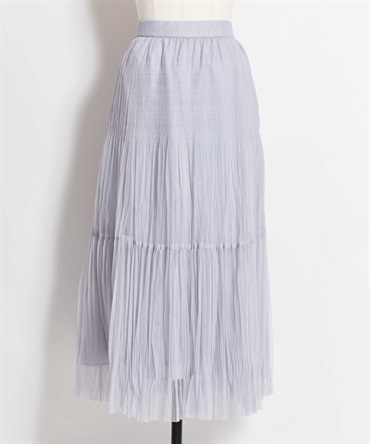 【おすすめポイント】:ウエスト部分と裾部分で異なる種類のプリーツを施した、凝ったデザイン。ウエストは細かいプリーツで広がりすぎず、裾は分量感のあるプリーツでふんわりとした印象に。全体のバランスがよく、ブルーがかった淡いグレーのカラーも可愛いポイントです。