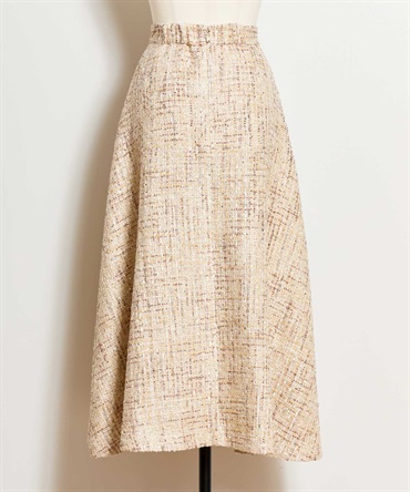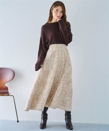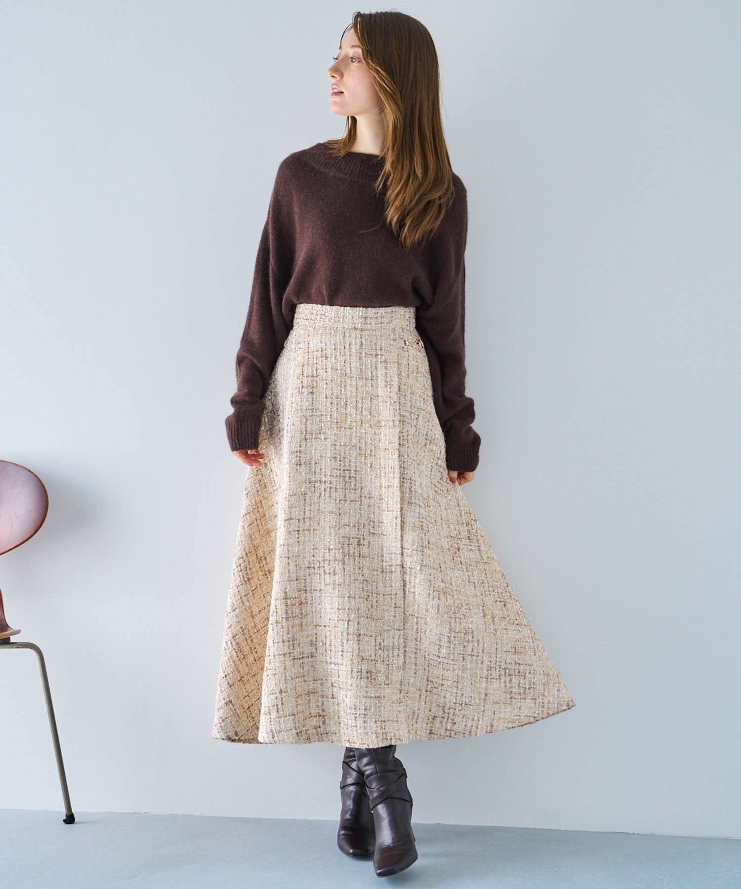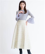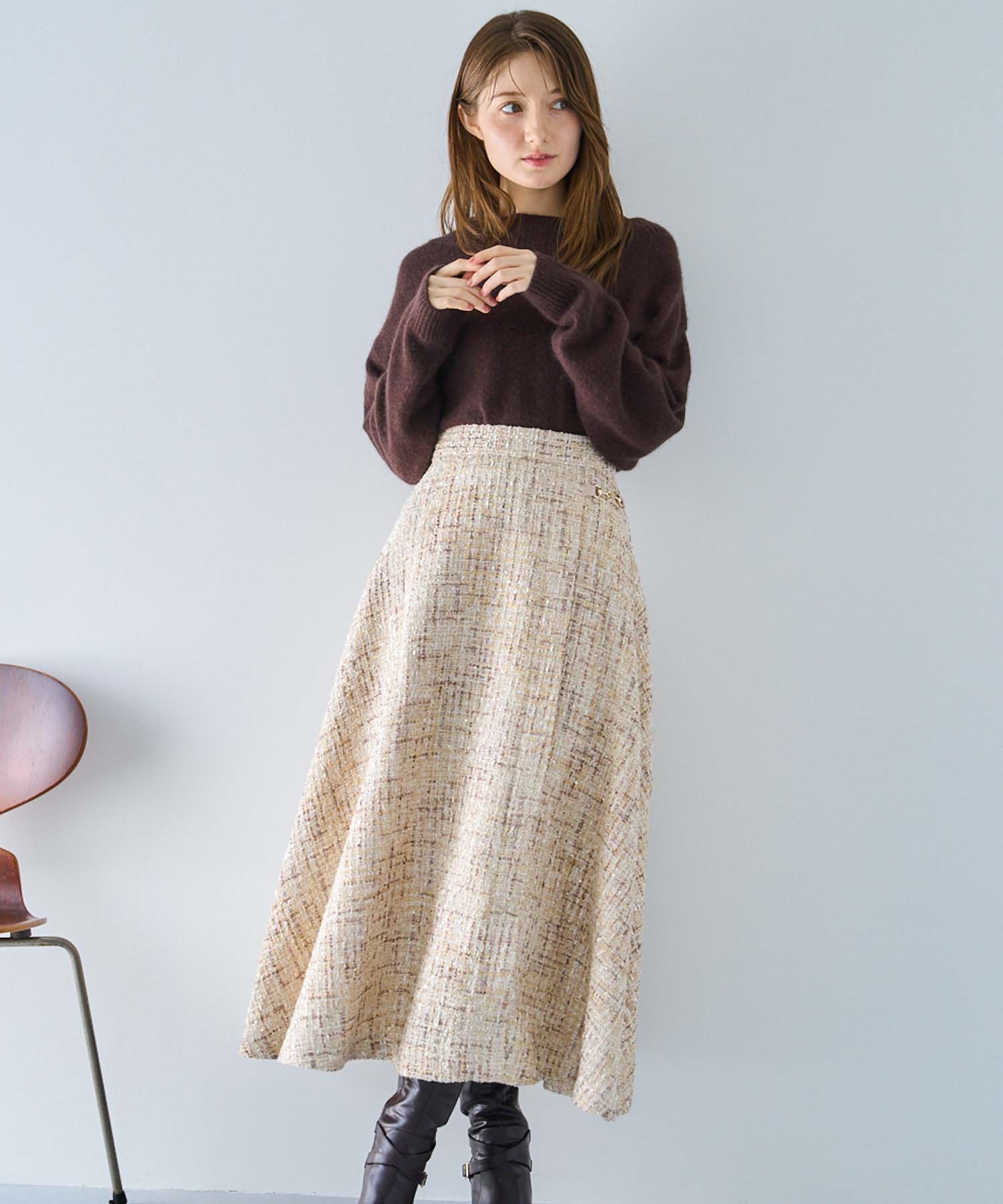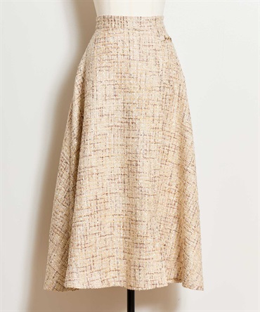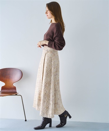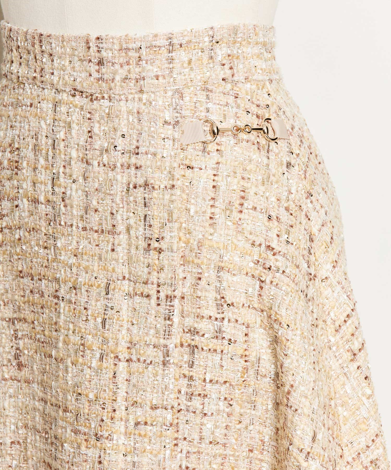 ファンシーツイードを使用した、華やかさのあるフレアスカート。 ラップ風のデザインにビットパーツを添えて、上品な高見えディテールに。 定番ツイードも、キャッチーなカラーでウィンターパステルが楽しめます。 ニットやブーツと合わせて、季節感のあるフェミニンスタイルに。