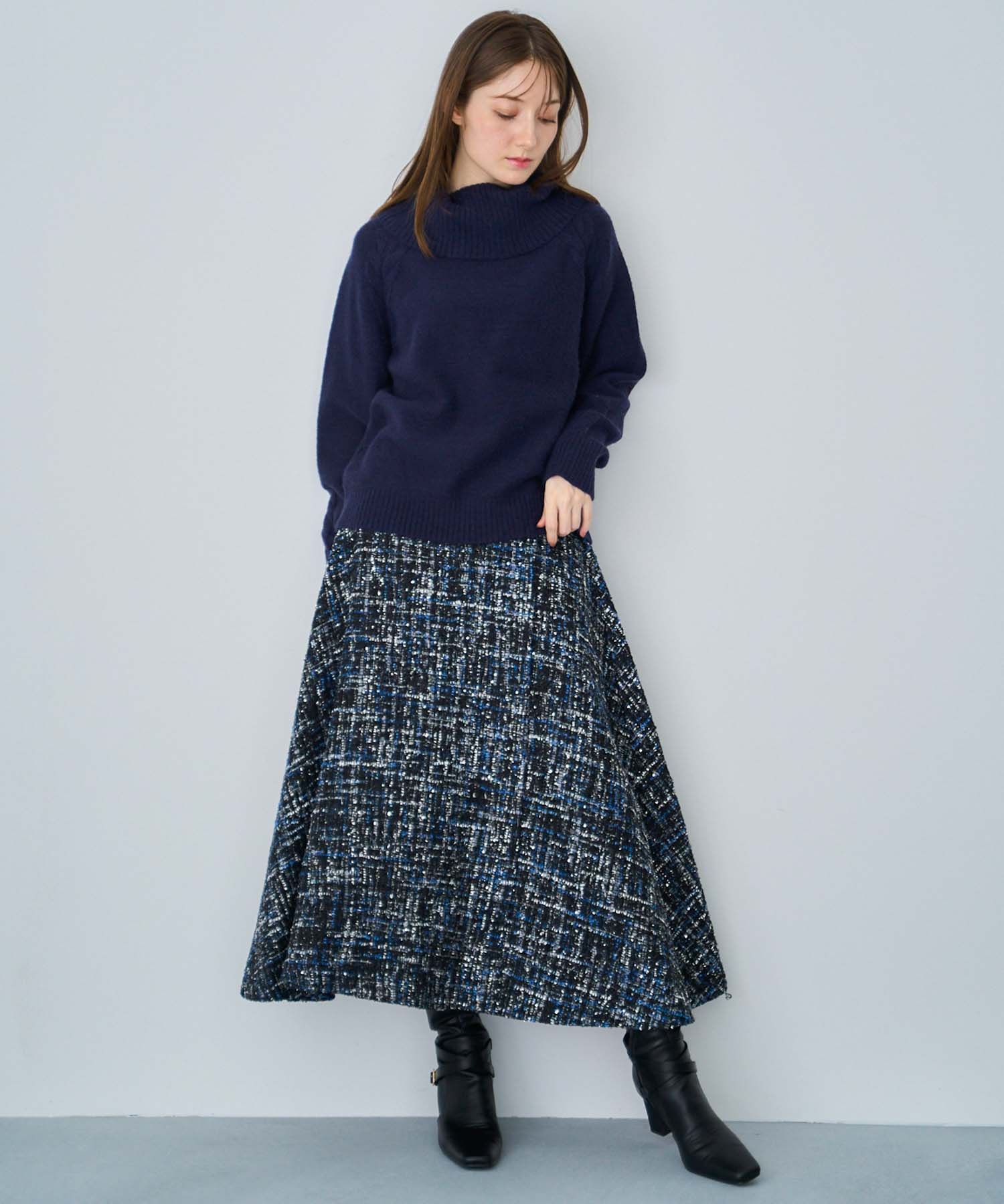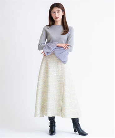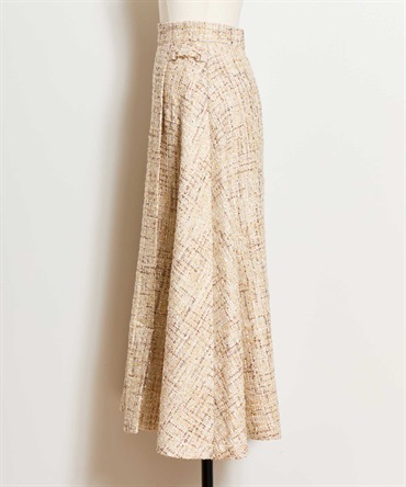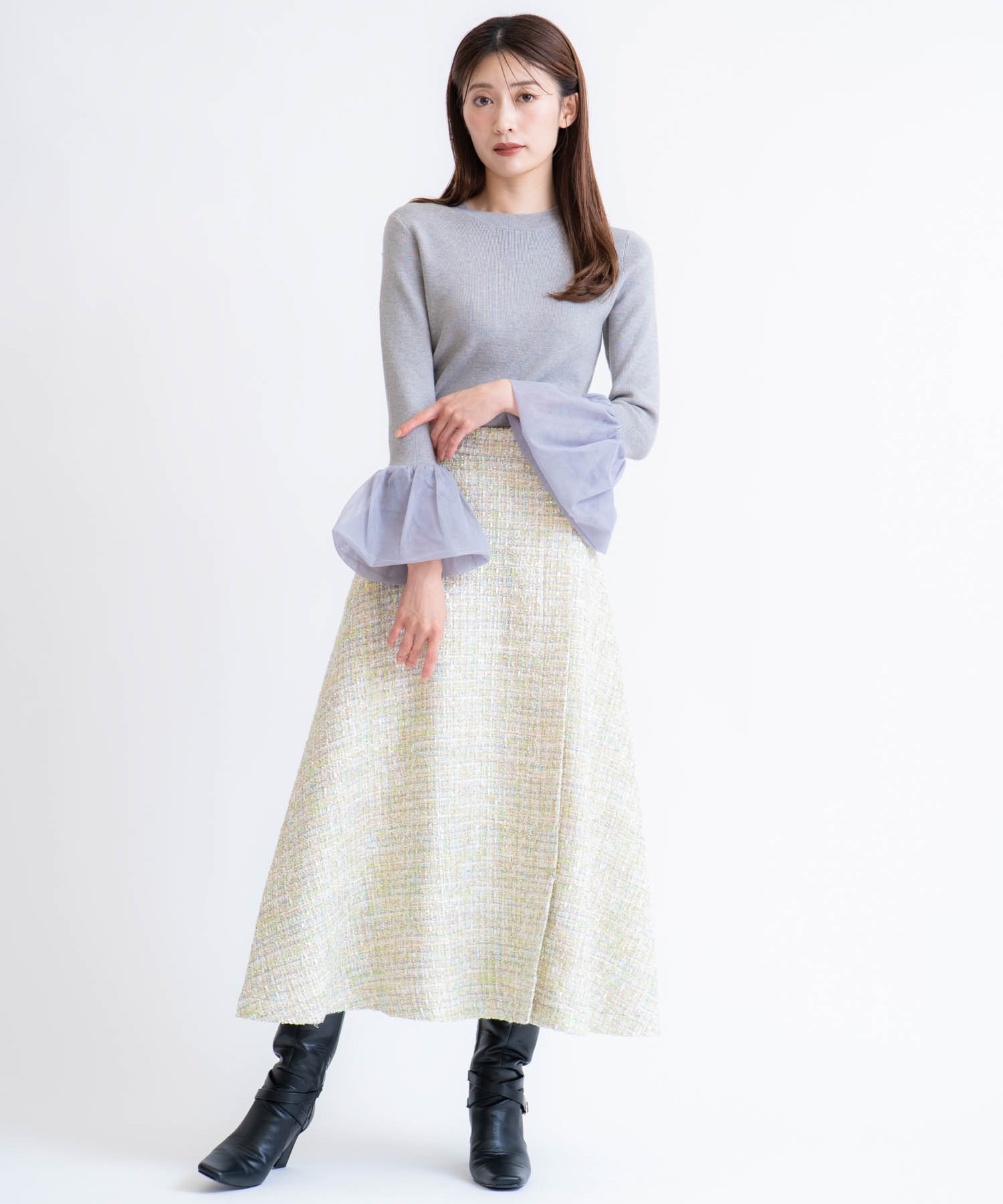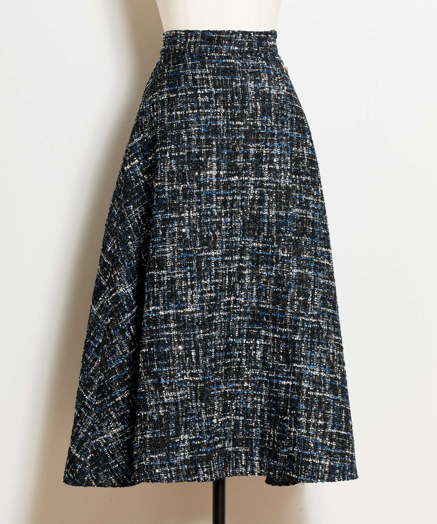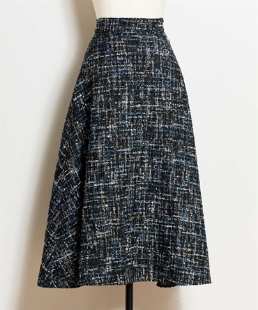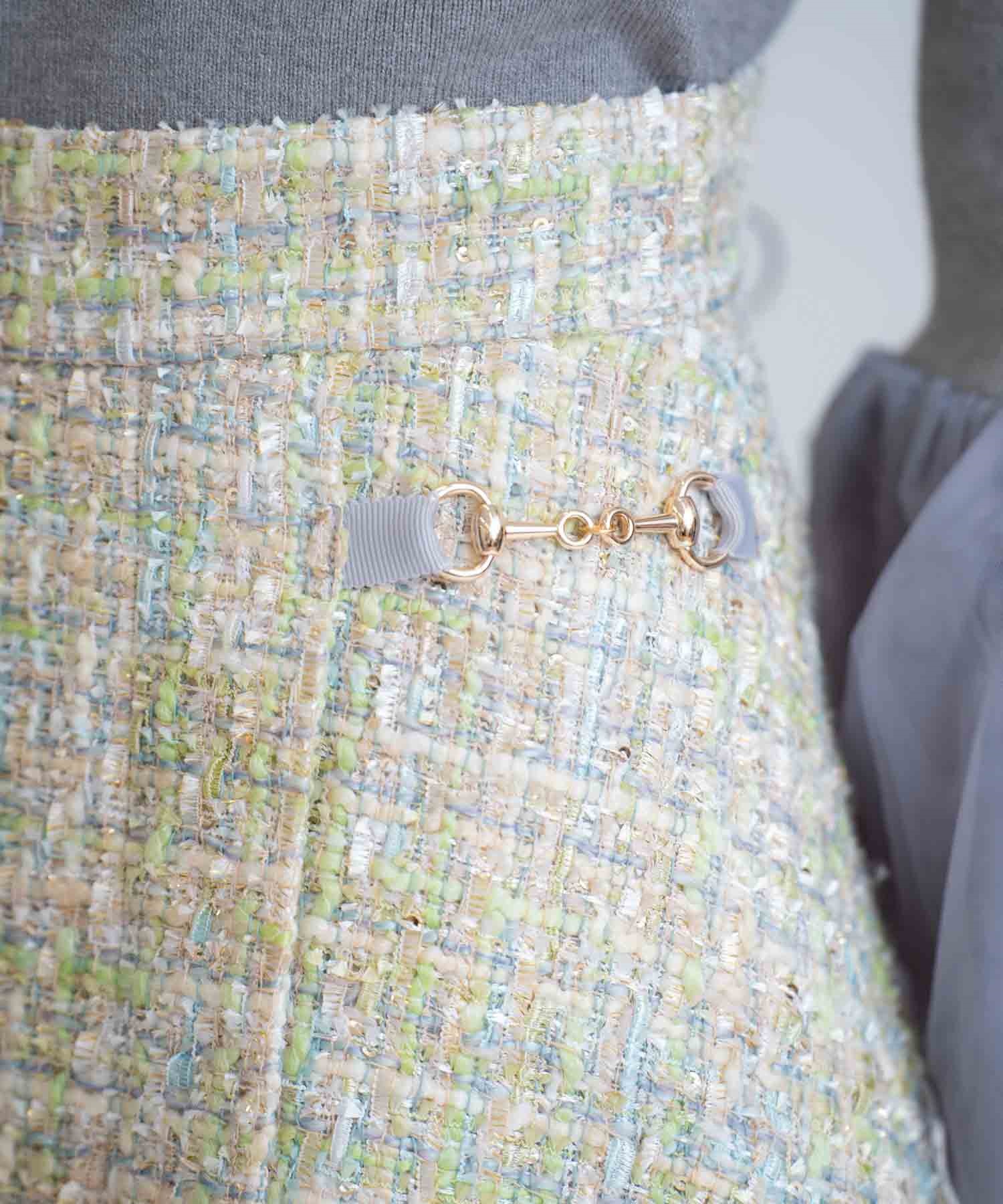 ファンシーツイードを使用した、華やかさのあるフレアスカート。 ラップ風のデザインにビットパーツを添えて、上品な高見えディテールに。 定番ツイードも、キャッチーなカラーでウィンターパステルが楽しめます。 ニットやブーツと合わせて、季節感のあるフェミニンスタイルに。