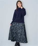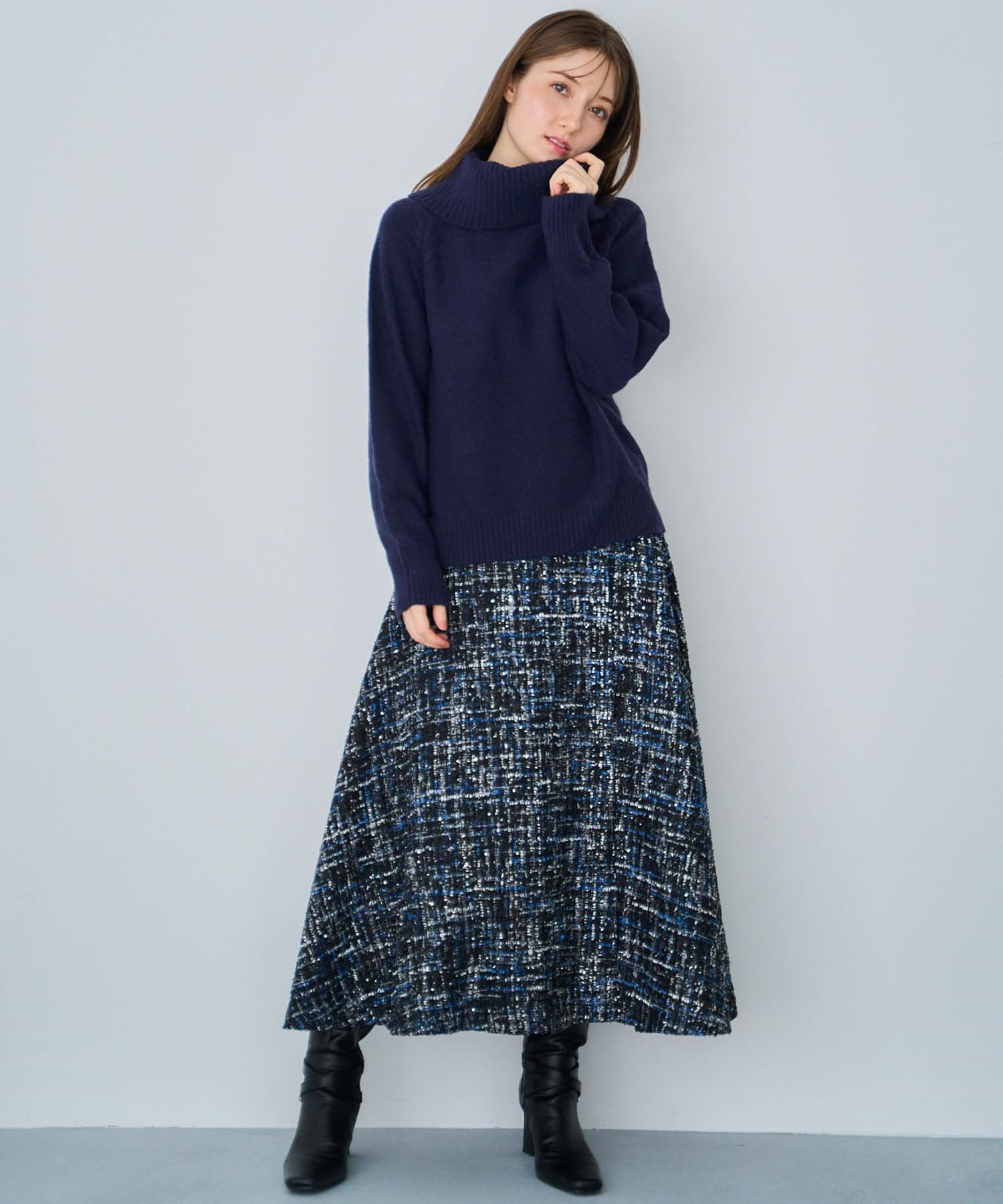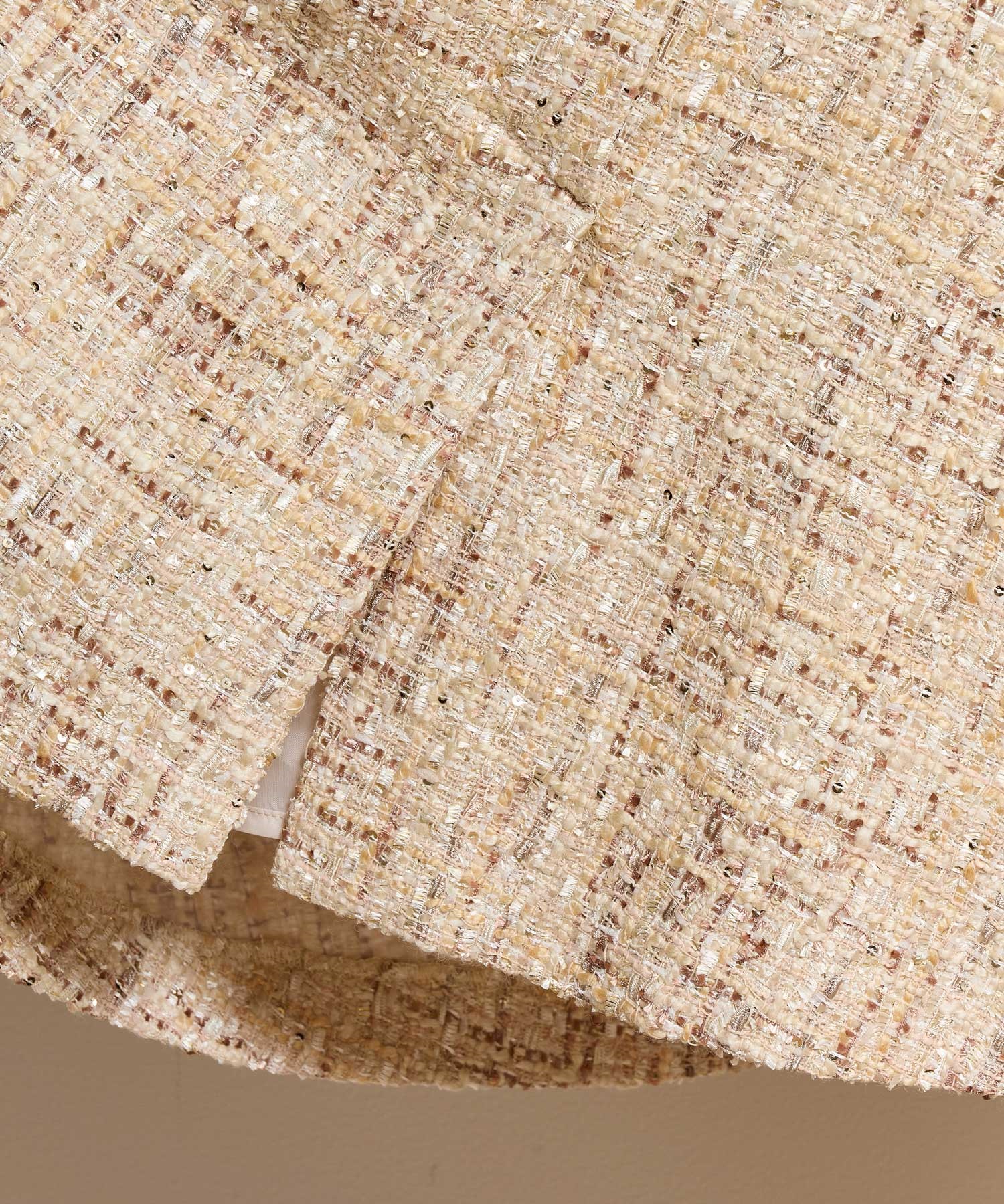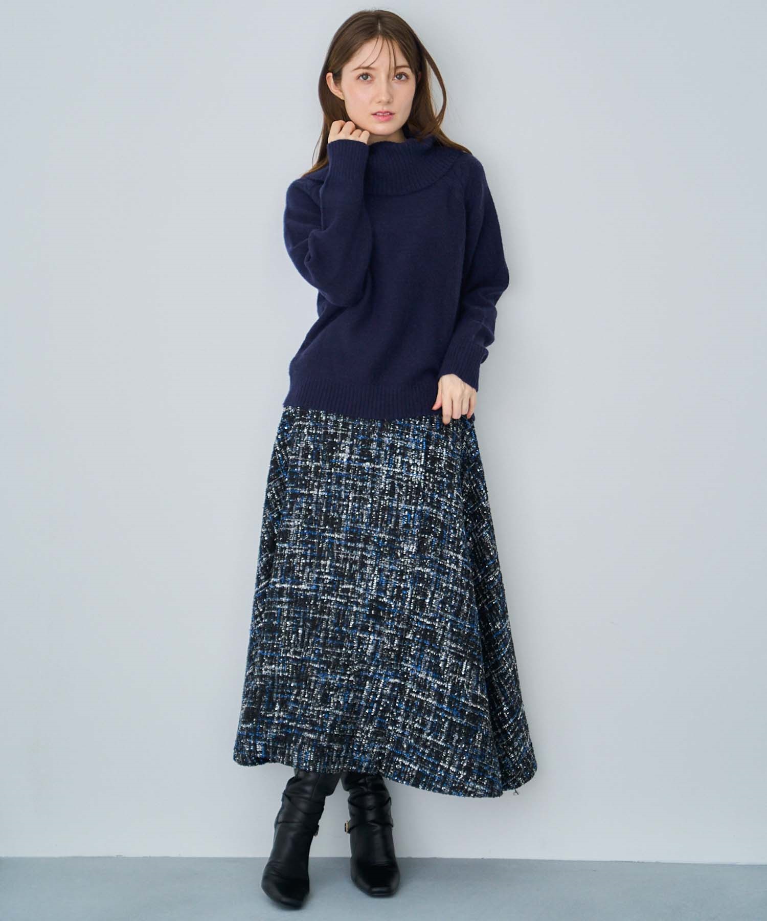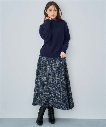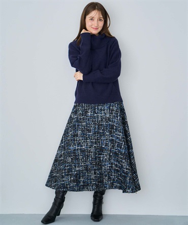 ファンシーツイードを使用した、華やかさのあるフレアスカート。 ラップ風のデザインにビットパーツを添えて、上品な高見えディテールに。 定番ツイードも、キャッチーなカラーでウィンターパステルが楽しめます。 ニットやブーツと合わせて、季節感のあるフェミニンスタイルに。