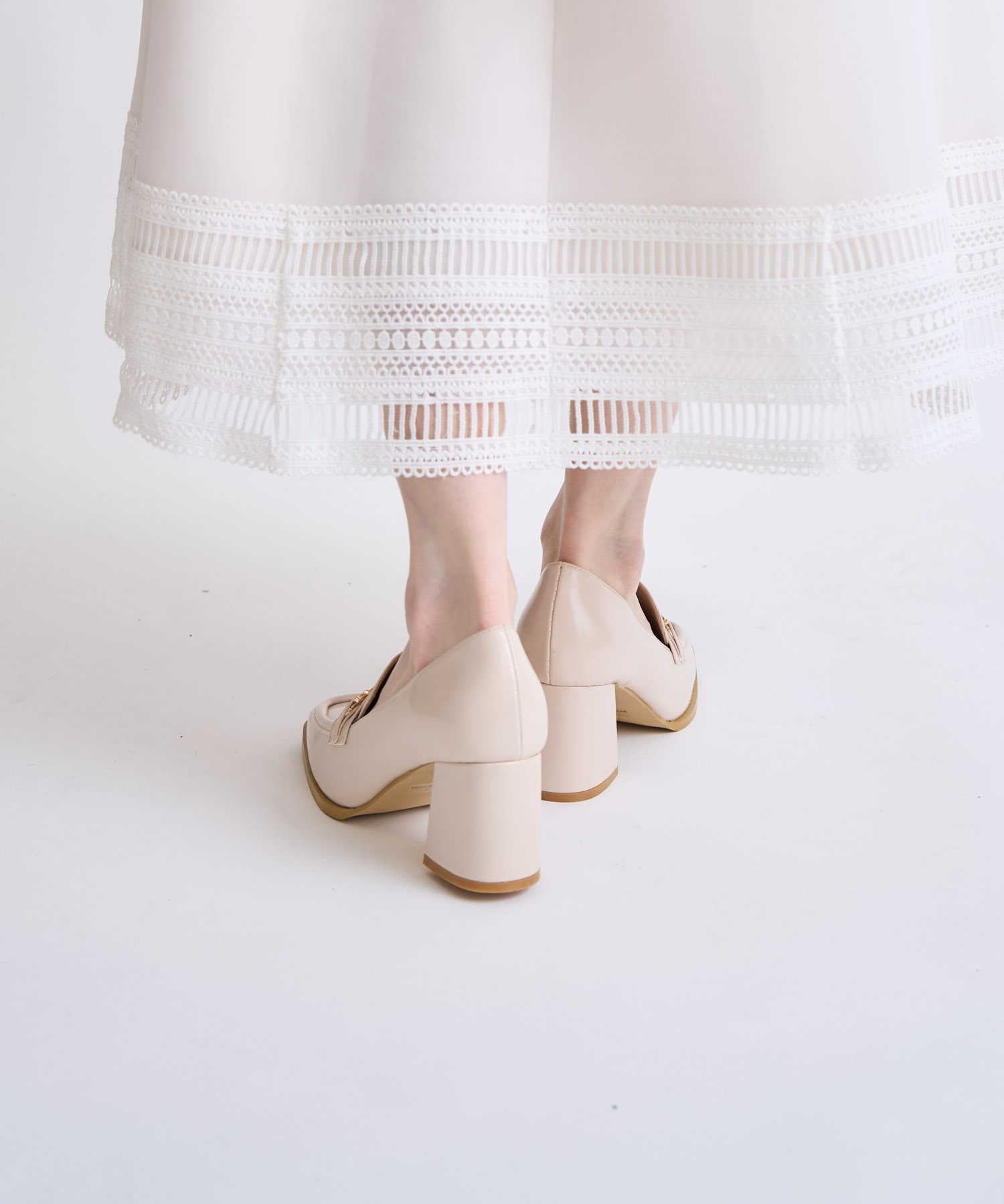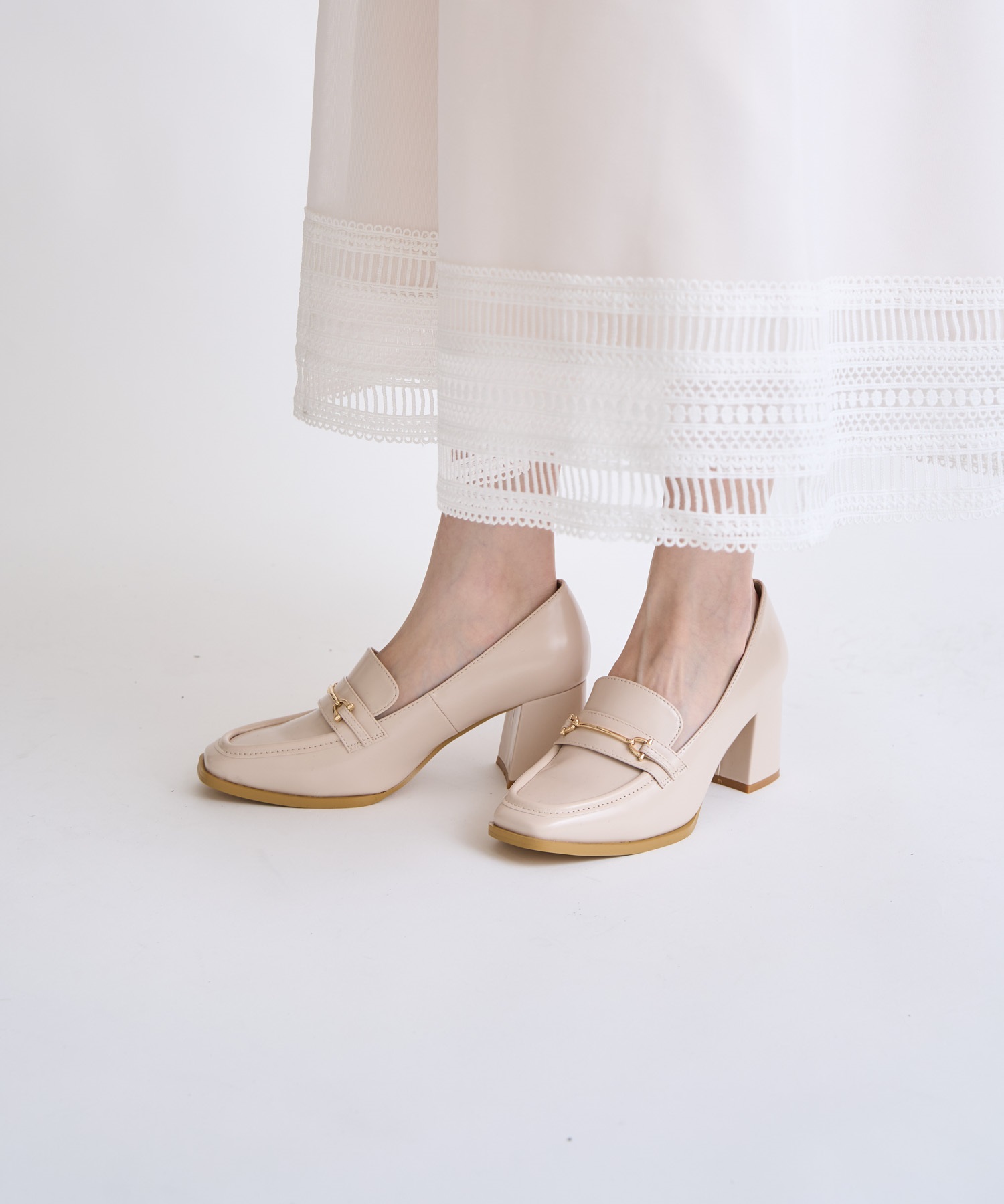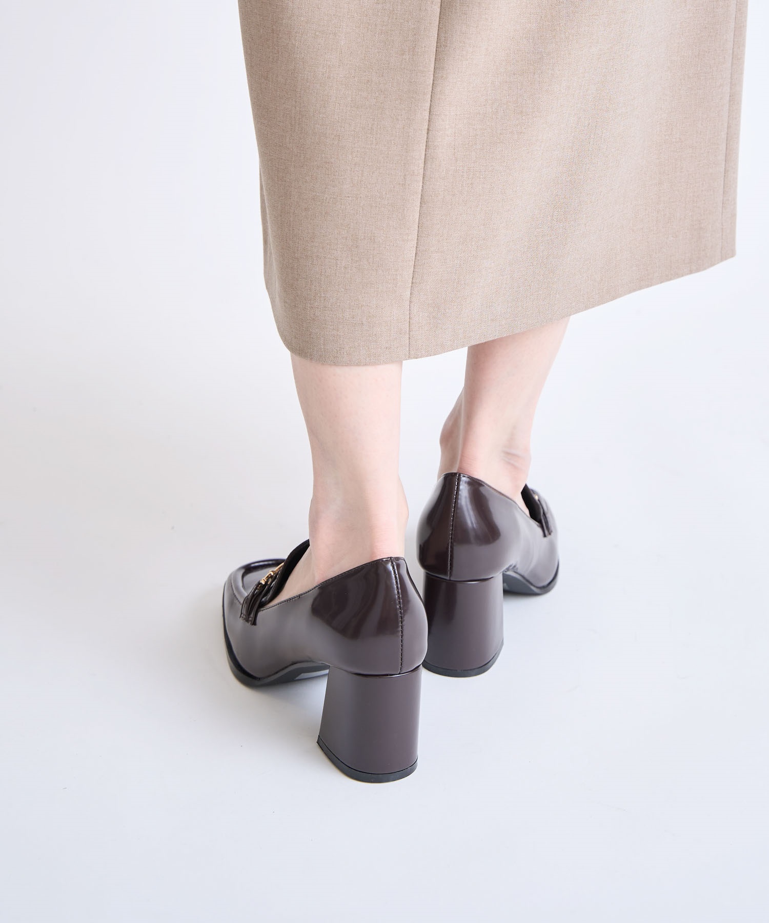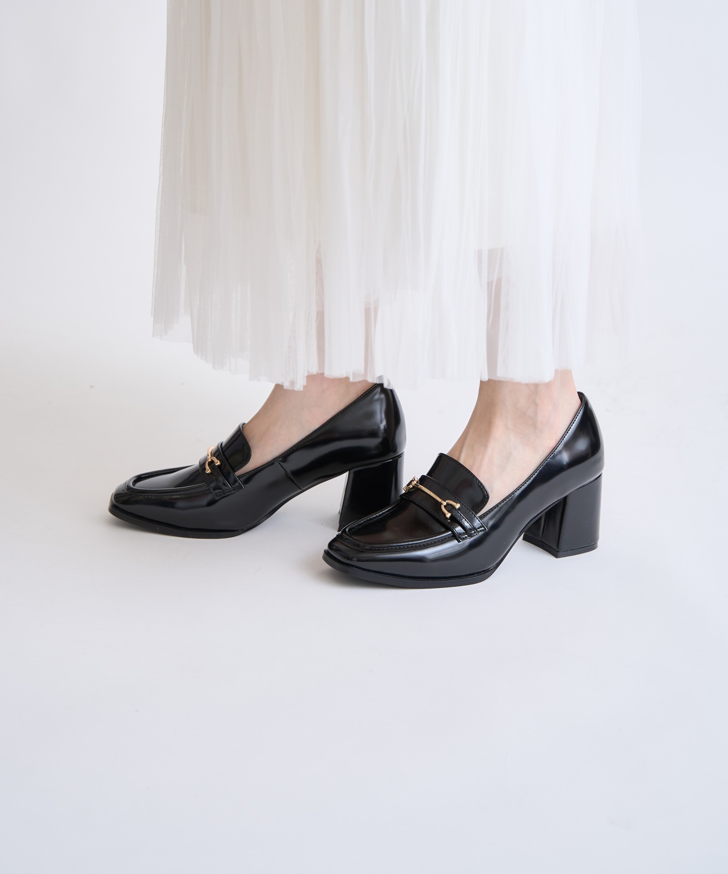 スクエアトゥとチャンキーヒールが柔らかな印象を添えるローファーデザインパンプス。