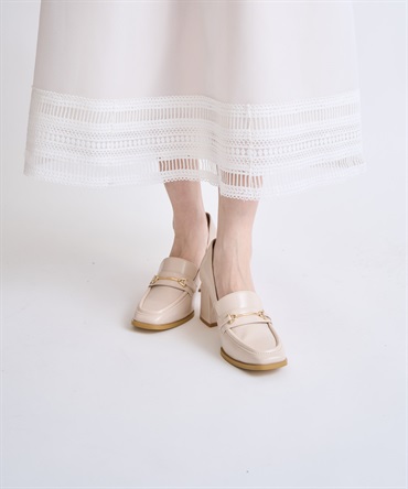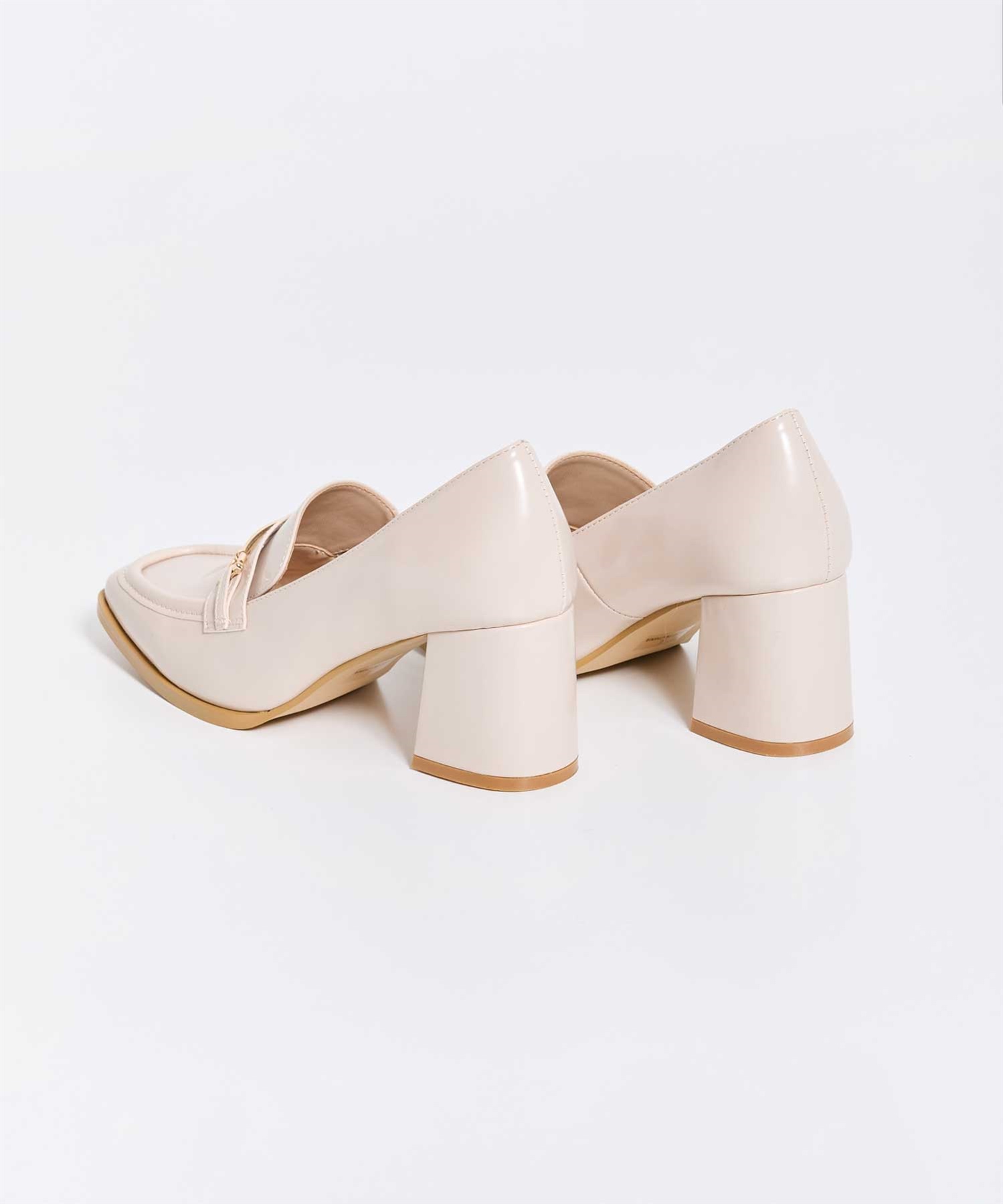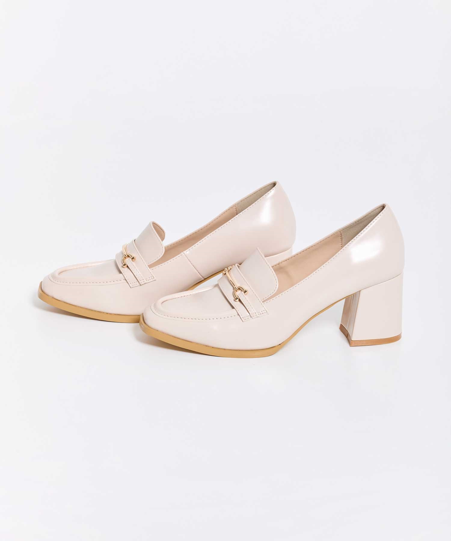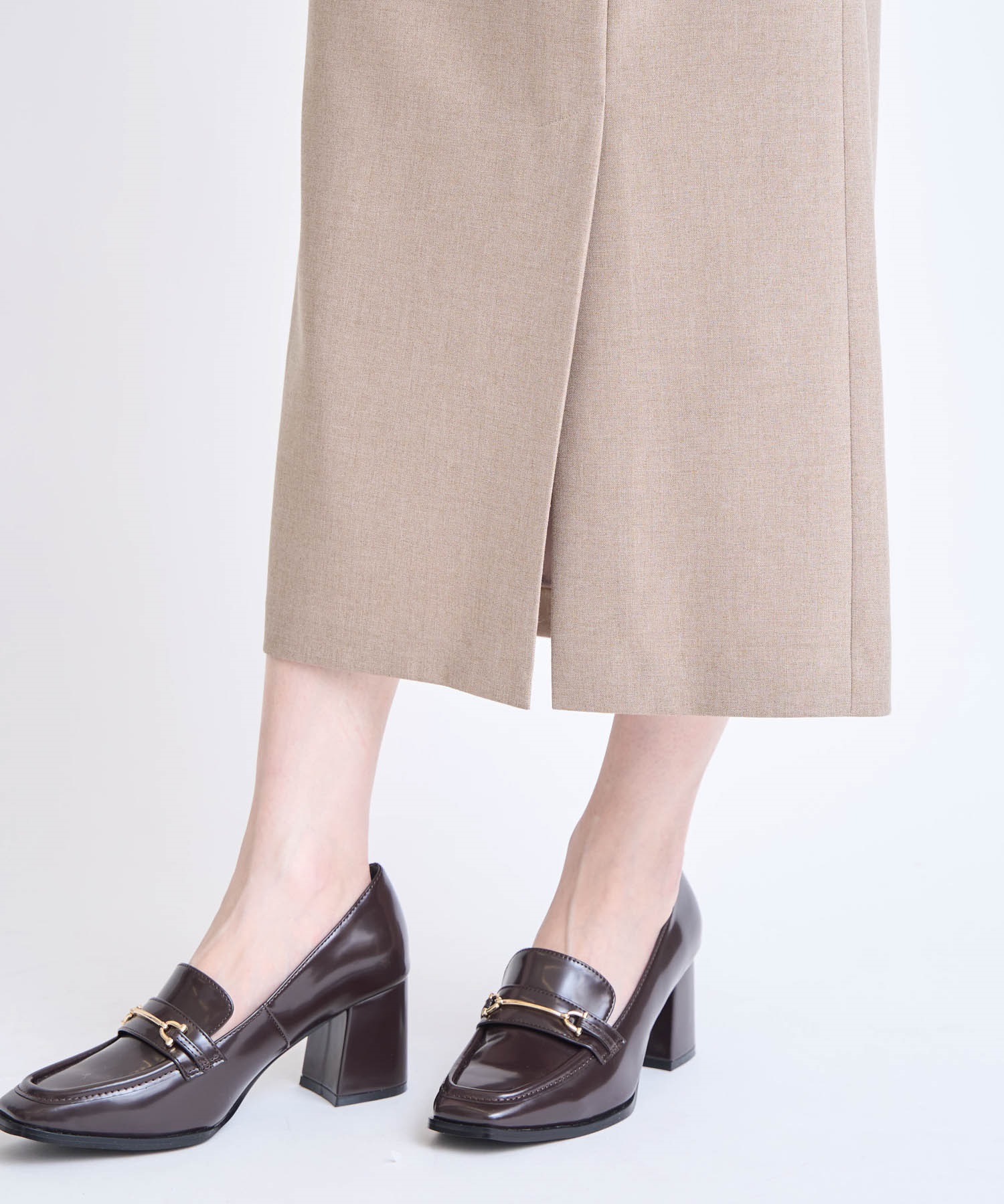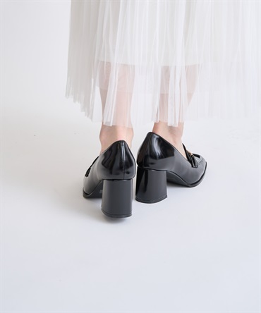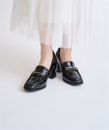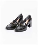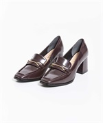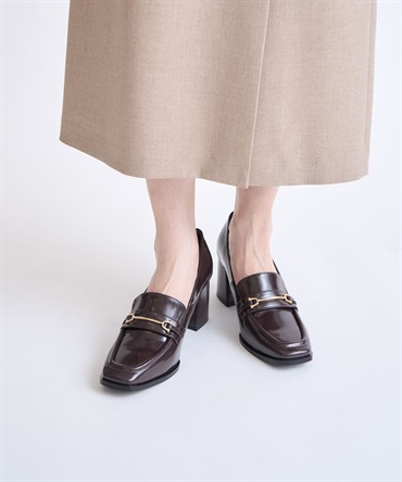 スクエアトゥとチャンキーヒールが柔らかな印象を添えるローファーデザインパンプス。