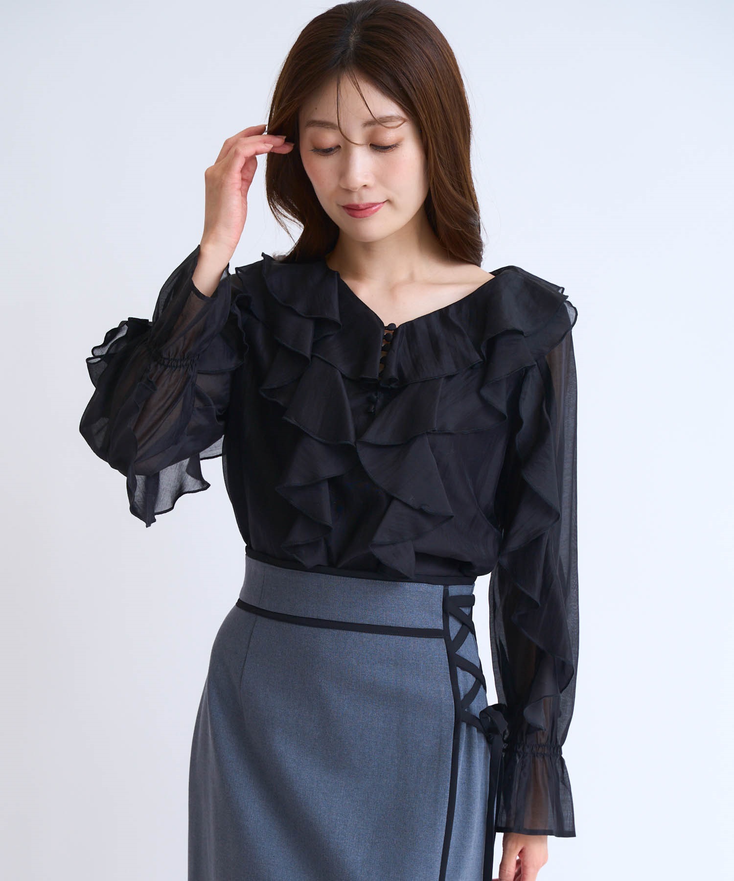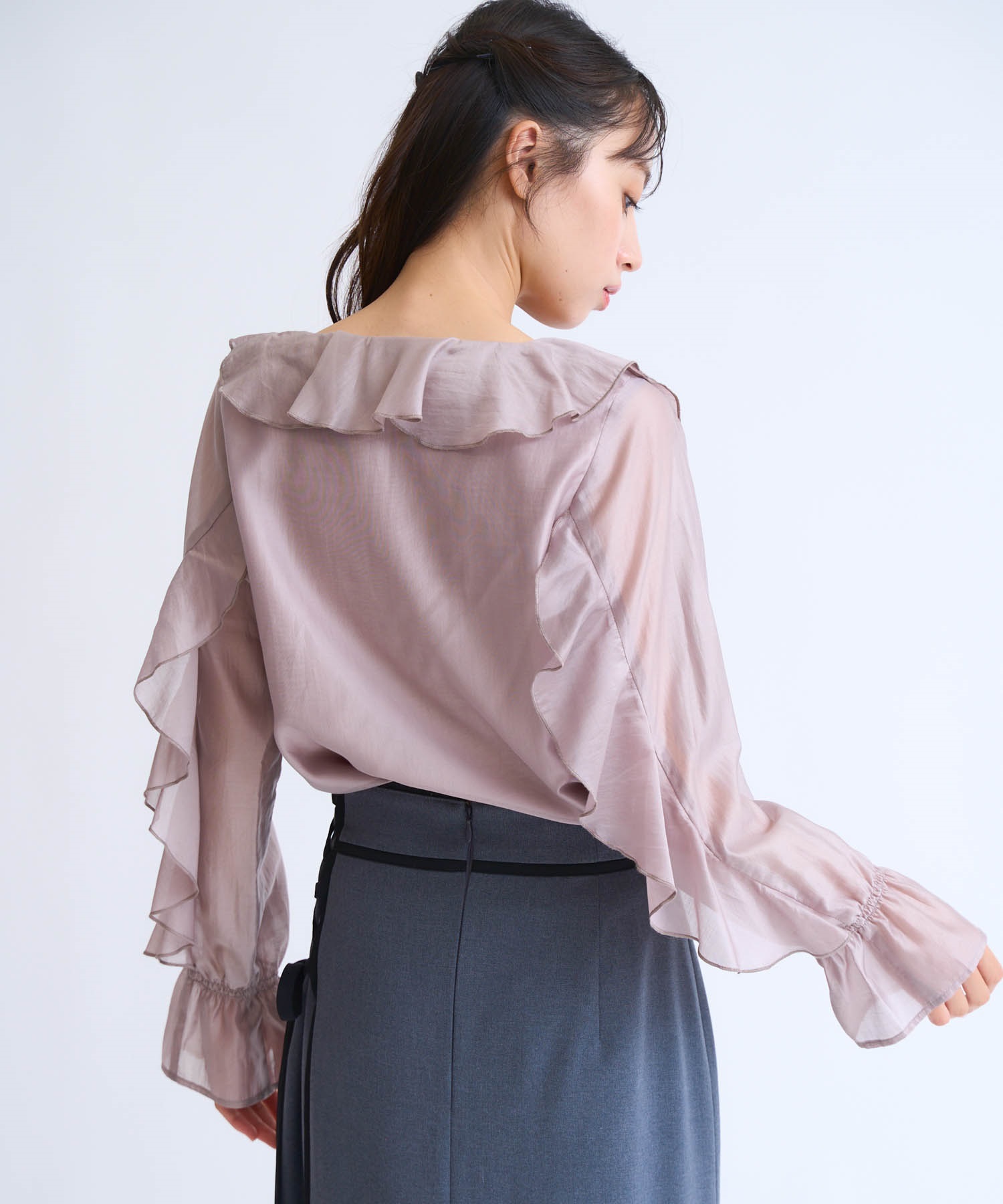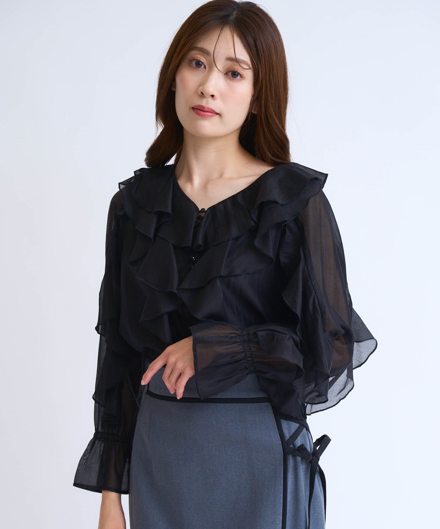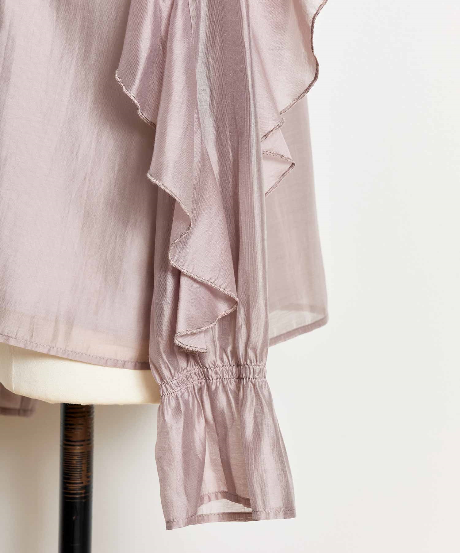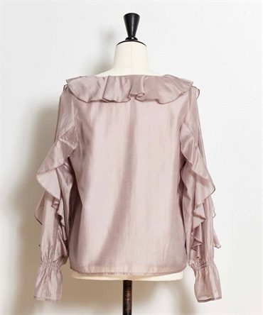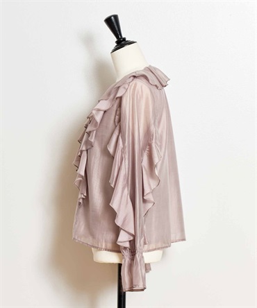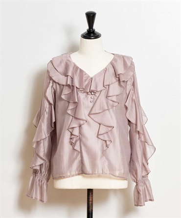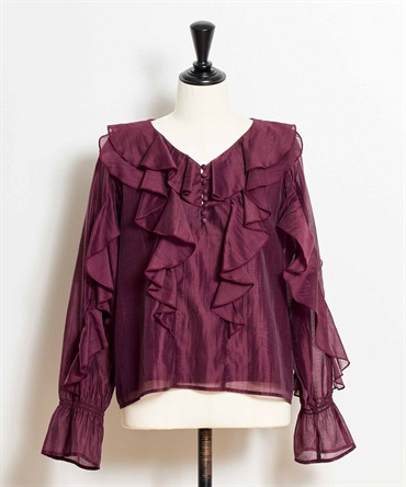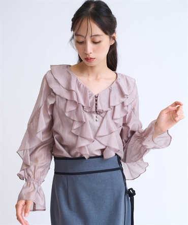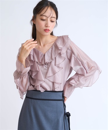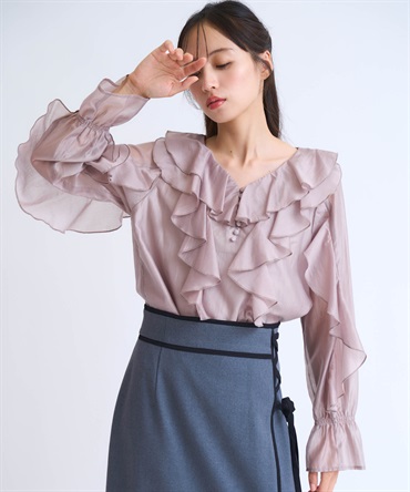 ふんだんにあしらったフリルが華やかなシアーブラウス。