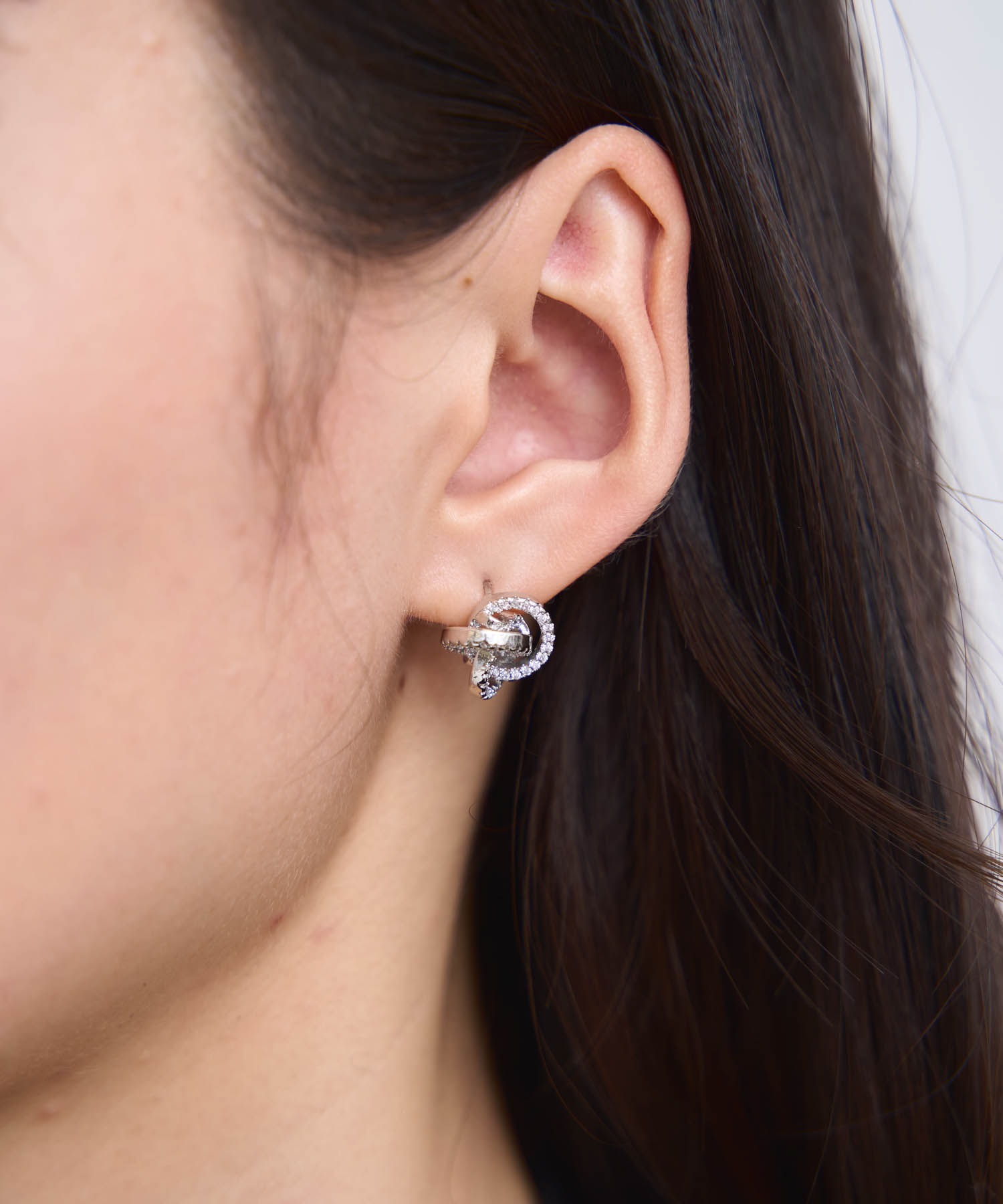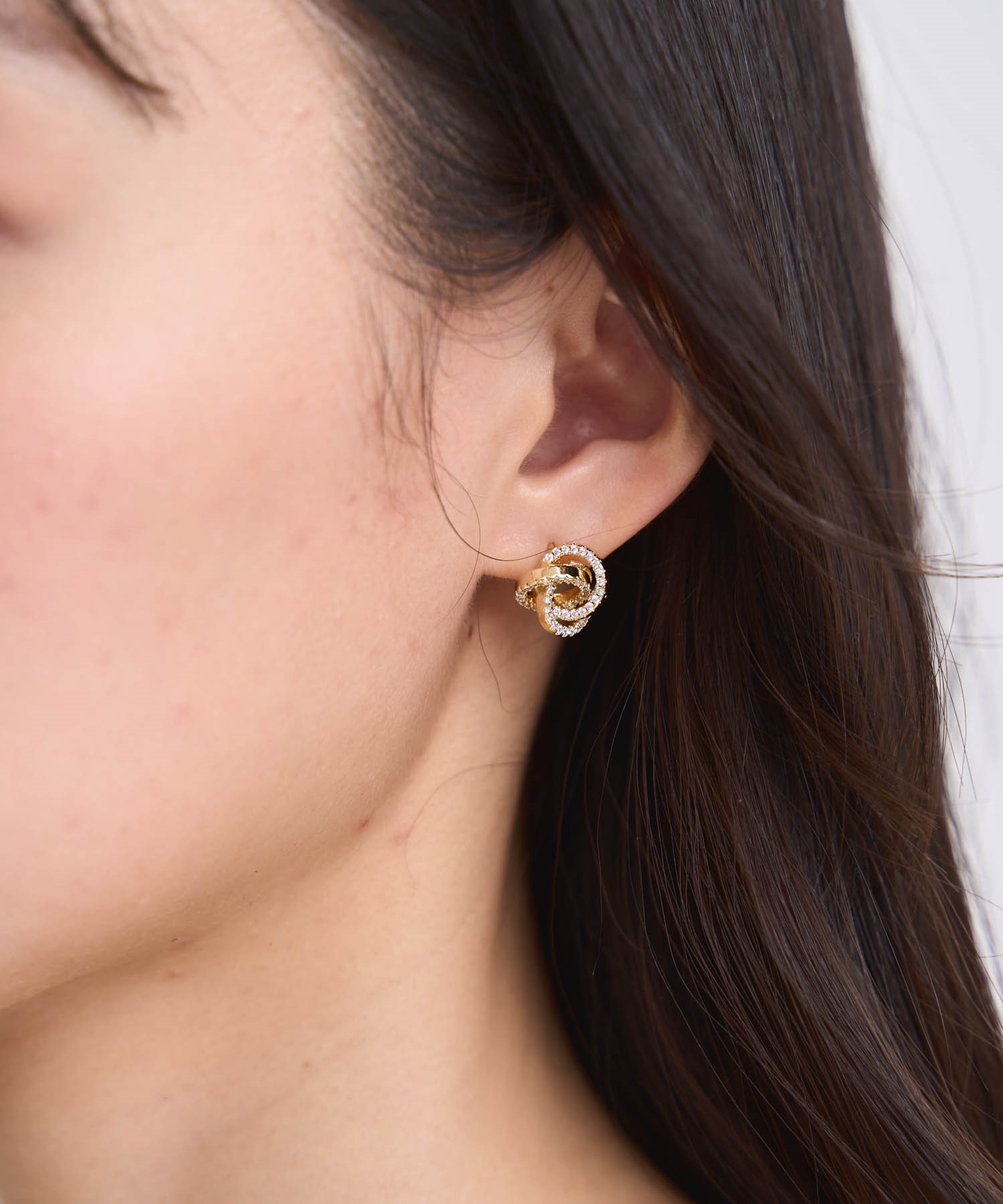 3連のビジューが耳元で輝きを放つ、存在感のあるピアス。