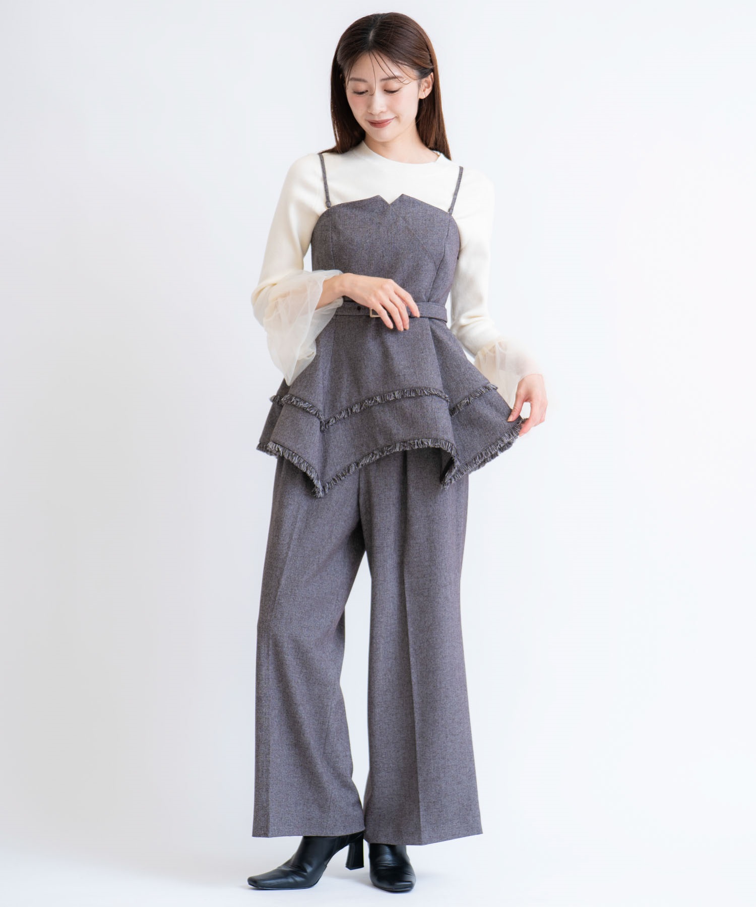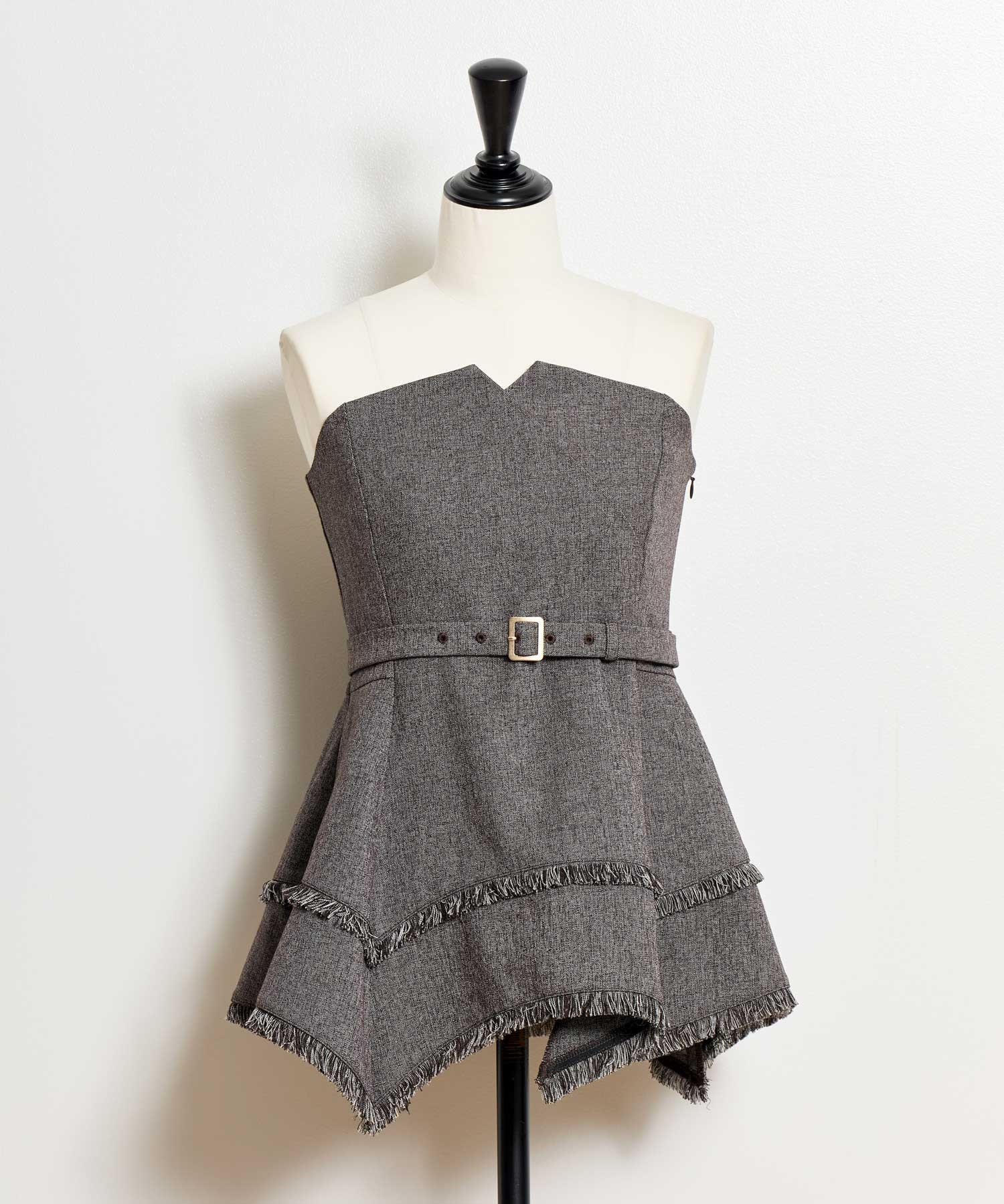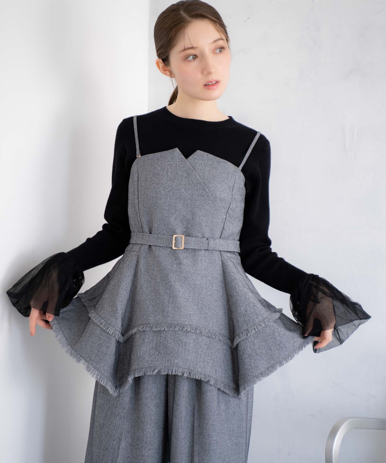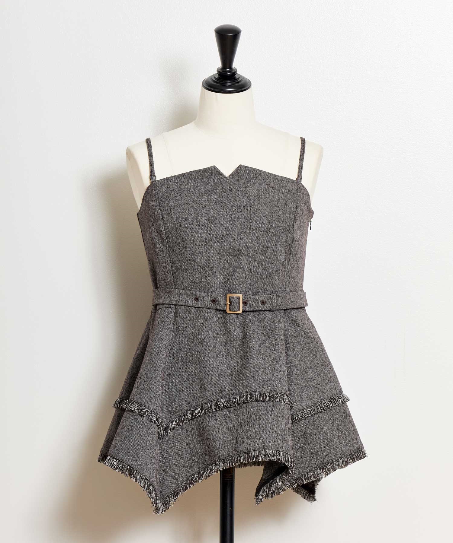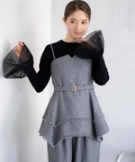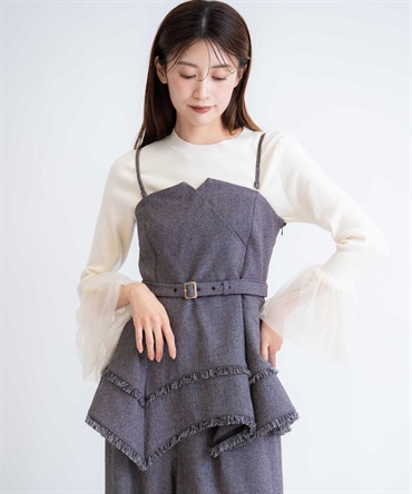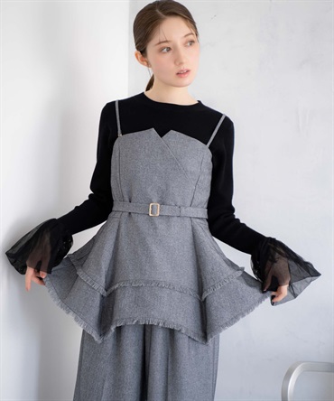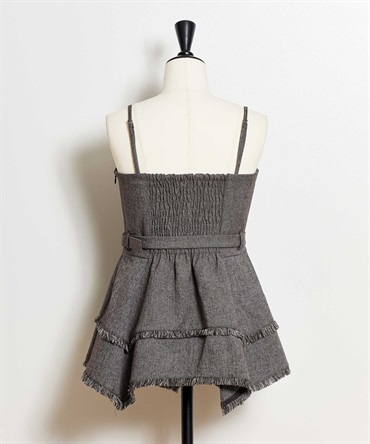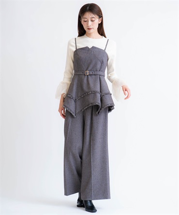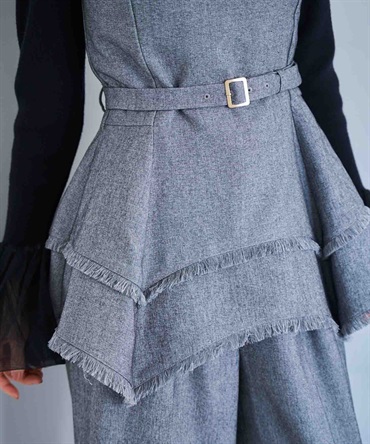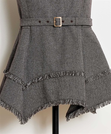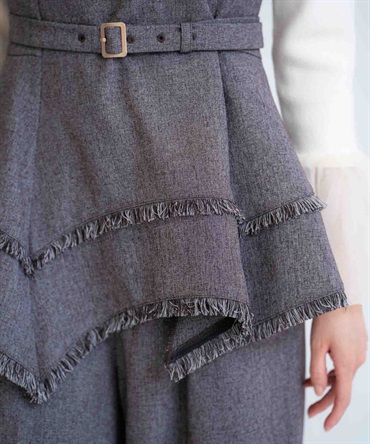 イレヘムシルエットとフリンジが目を引く、デザイン性の高いビスチェ。 ウエストを引き締めるベルト付きで、スタイルアップ効果も抜群。 共地のツイードワイドパンツ(品番:5562510)やデニムと合わせれば、旬のセットアップ風コーデが完成します。 1枚で主役級の華やかさを放つアイテムです。
