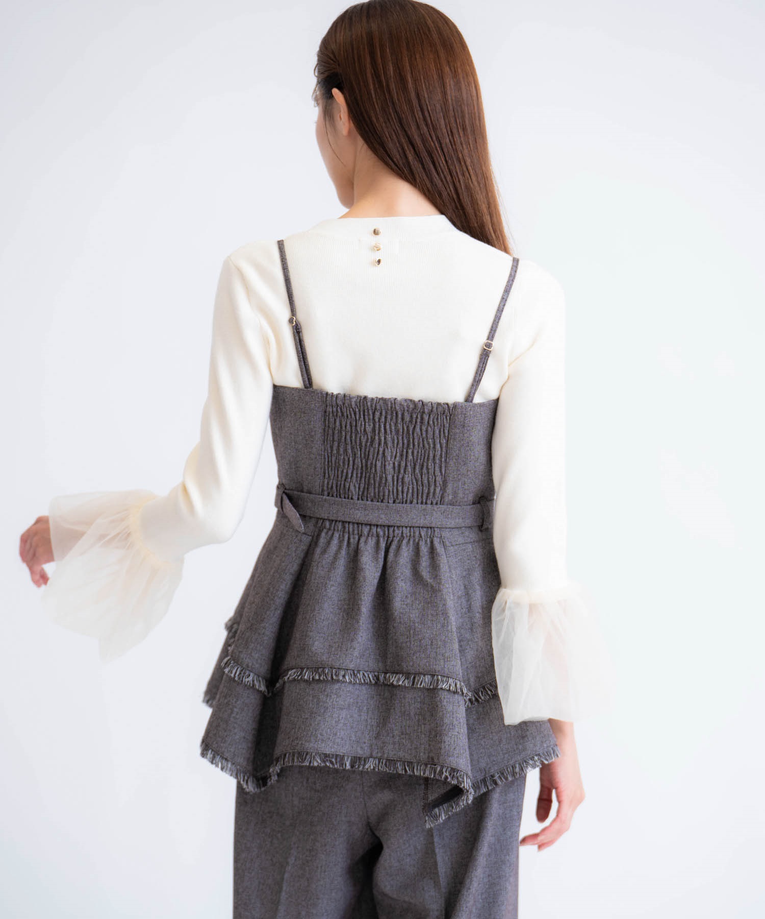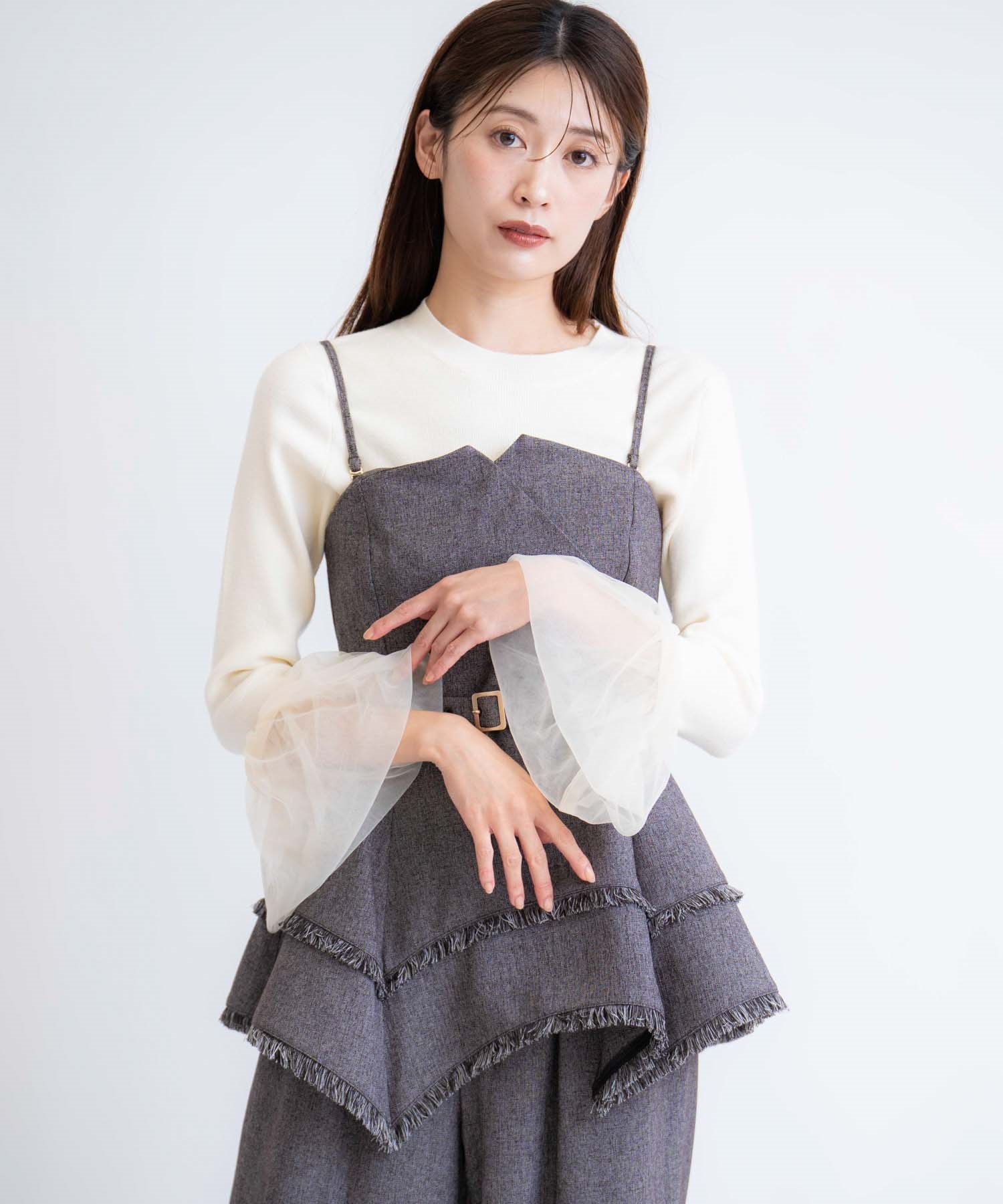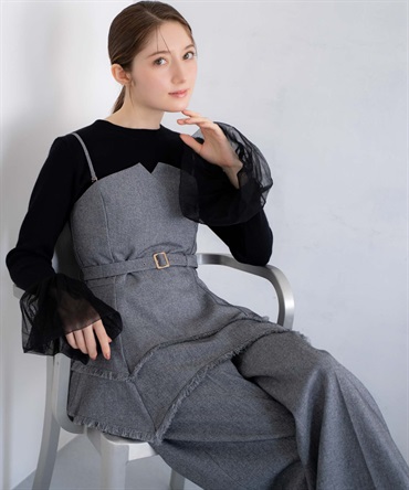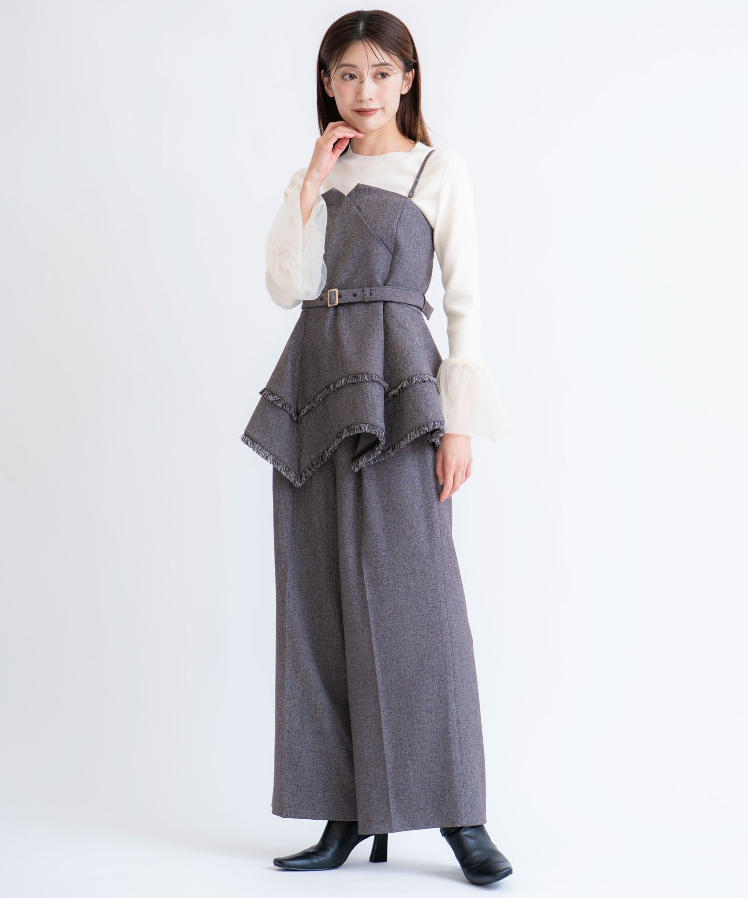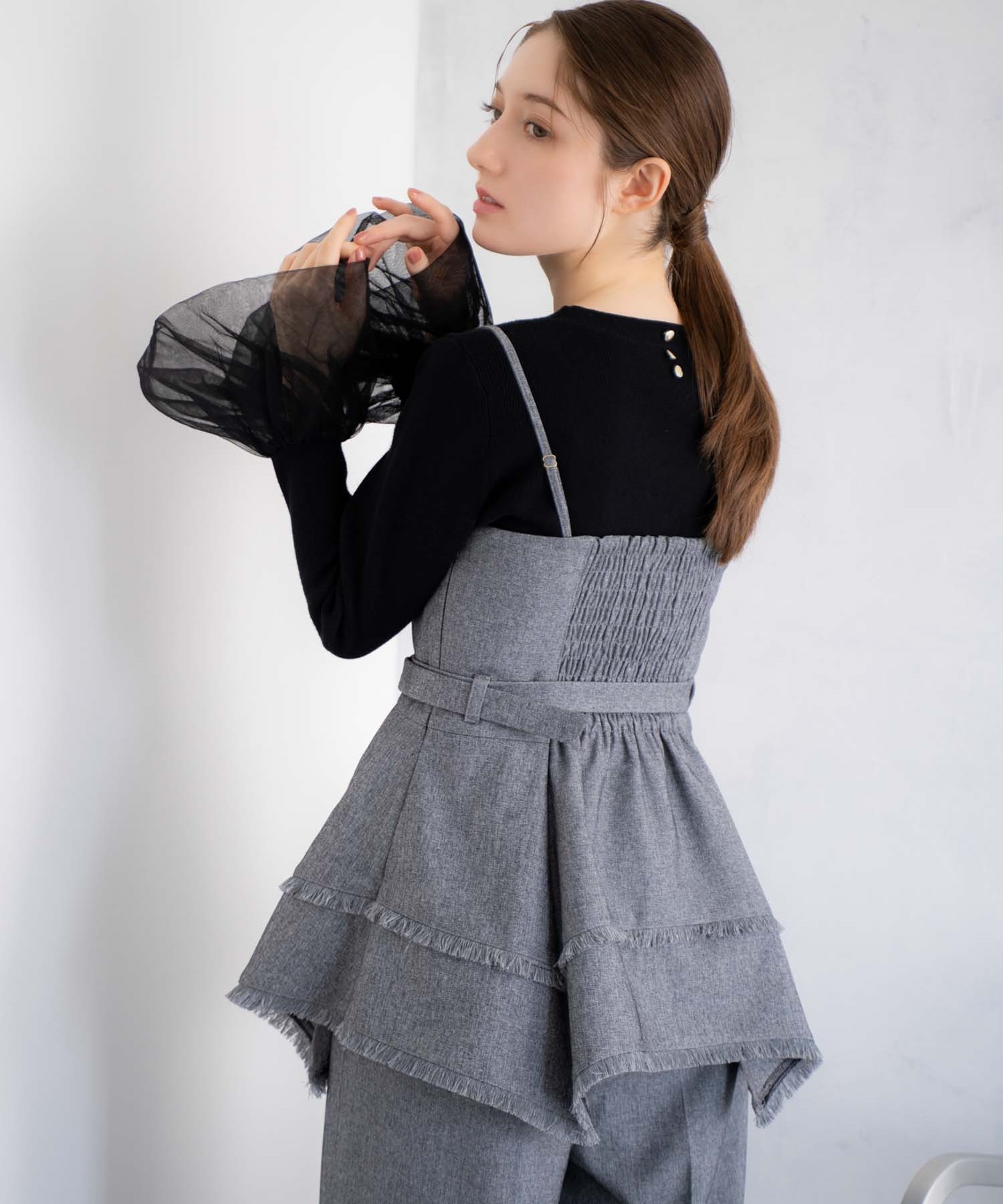 イレヘムシルエットとフリンジが目を引く、デザイン性の高いビスチェ。 ウエストを引き締めるベルト付きで、スタイルアップ効果も抜群。 共地のツイードワイドパンツ(品番:5562510)やデニムと合わせれば、旬のセットアップ風コーデが完成します。 1枚で主役級の華やかさを放つアイテムです。
