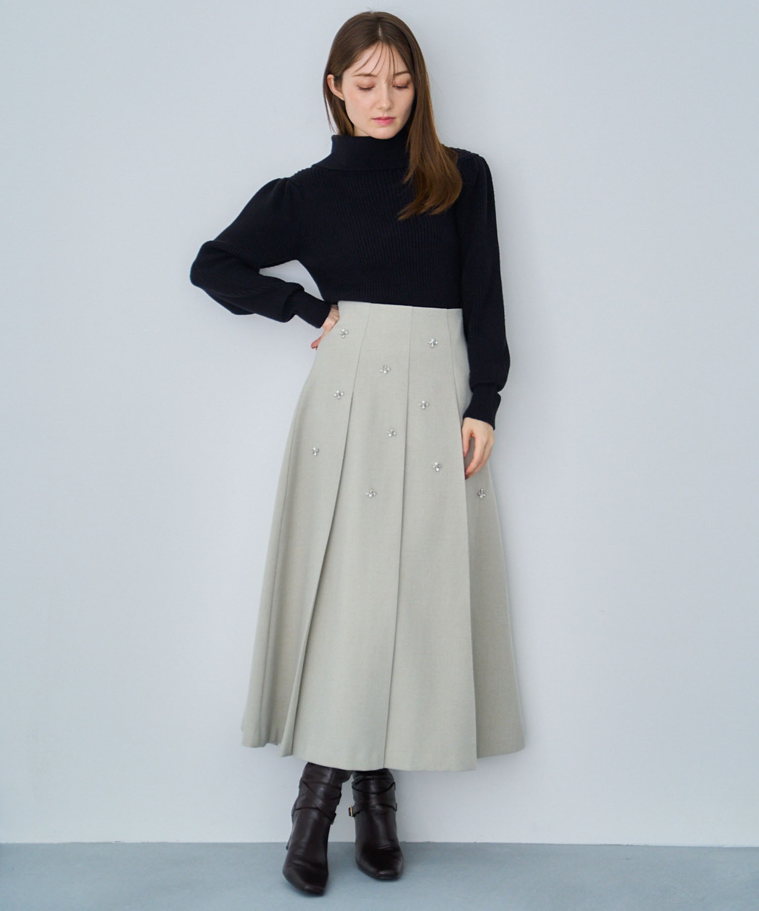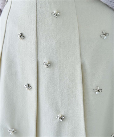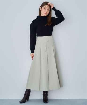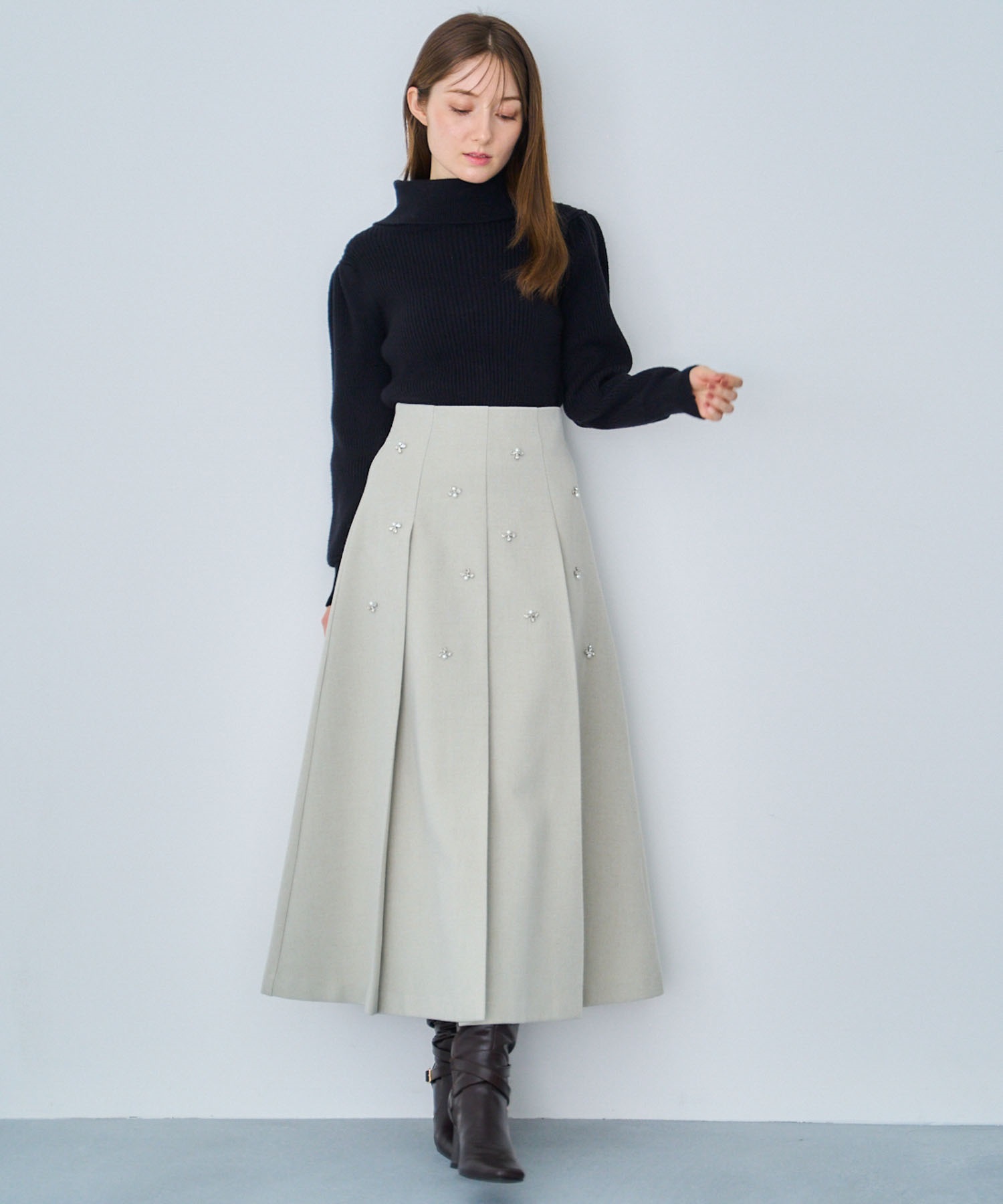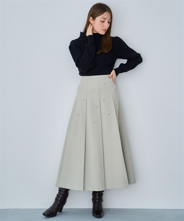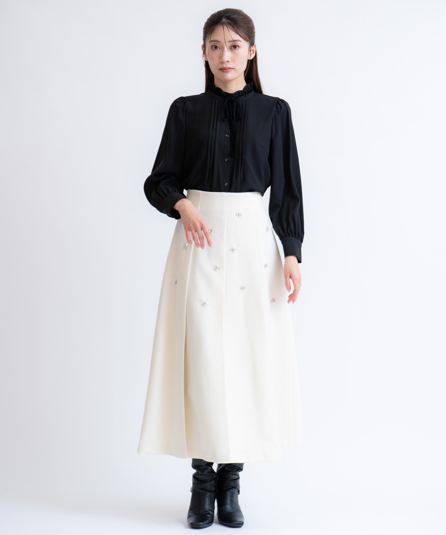 大きめのタックに、パールやビジューを贅沢にあしらったフレアスカート。