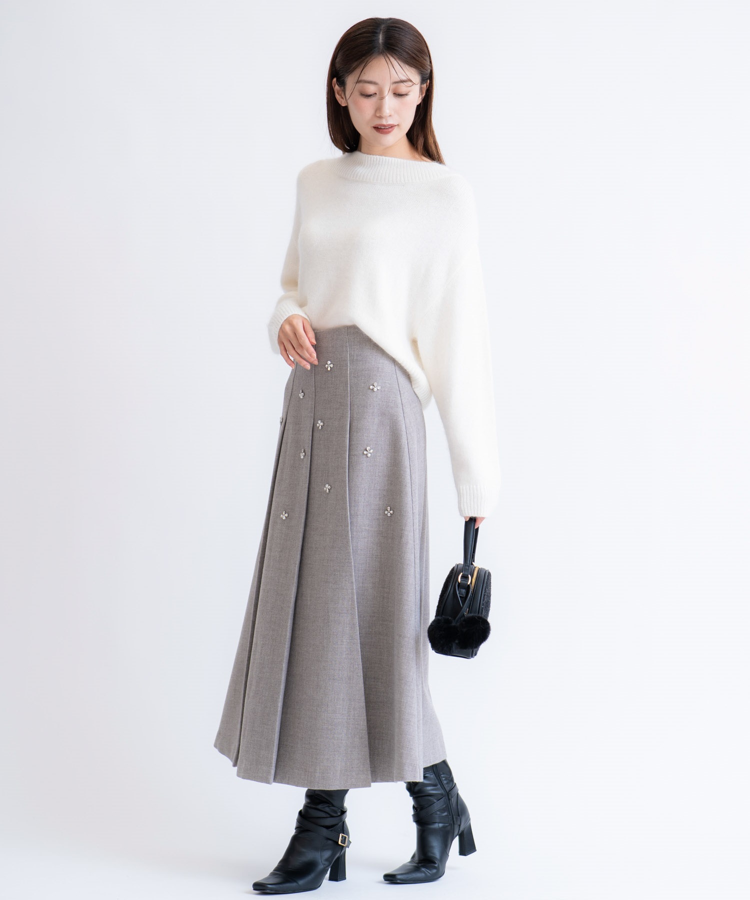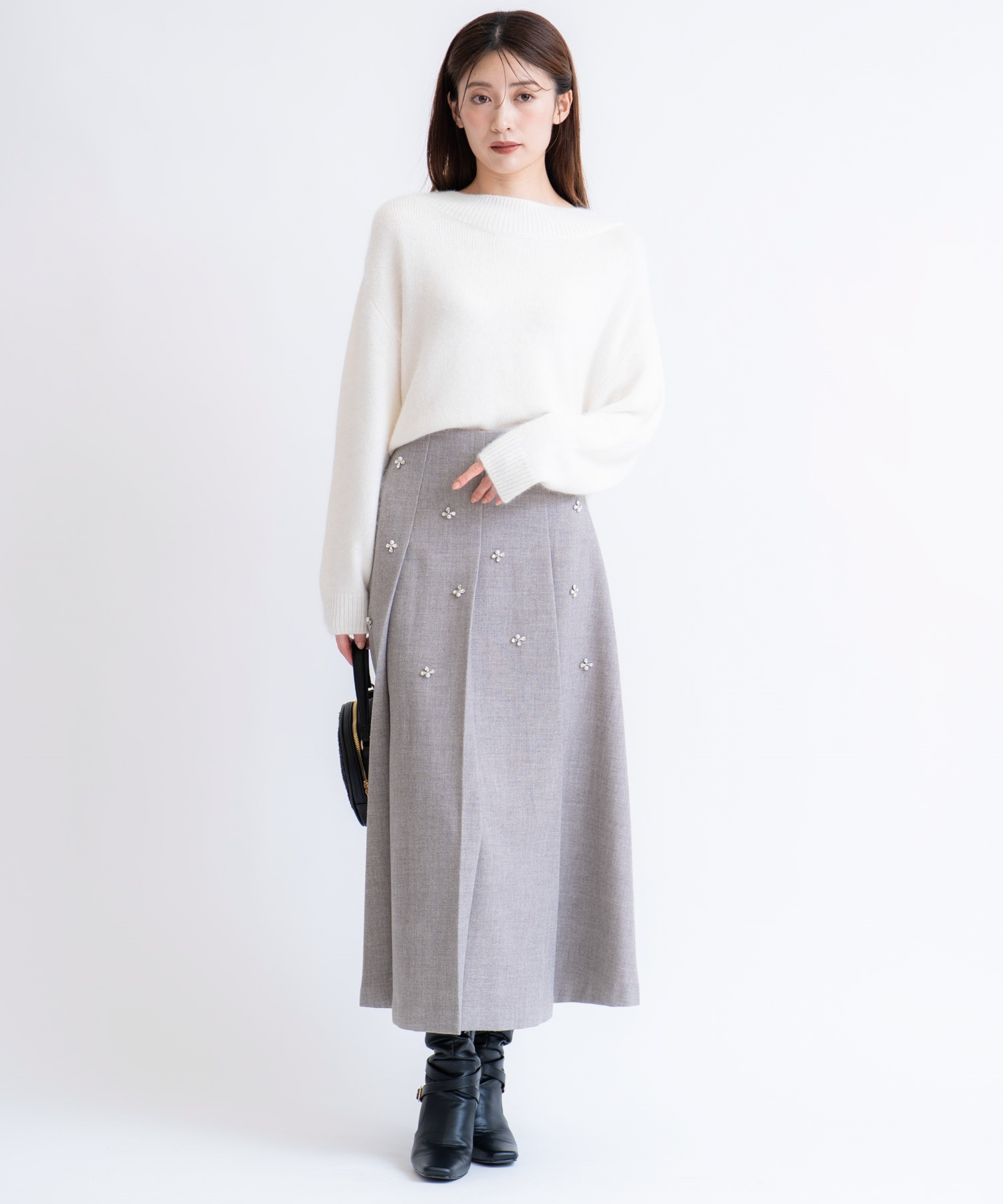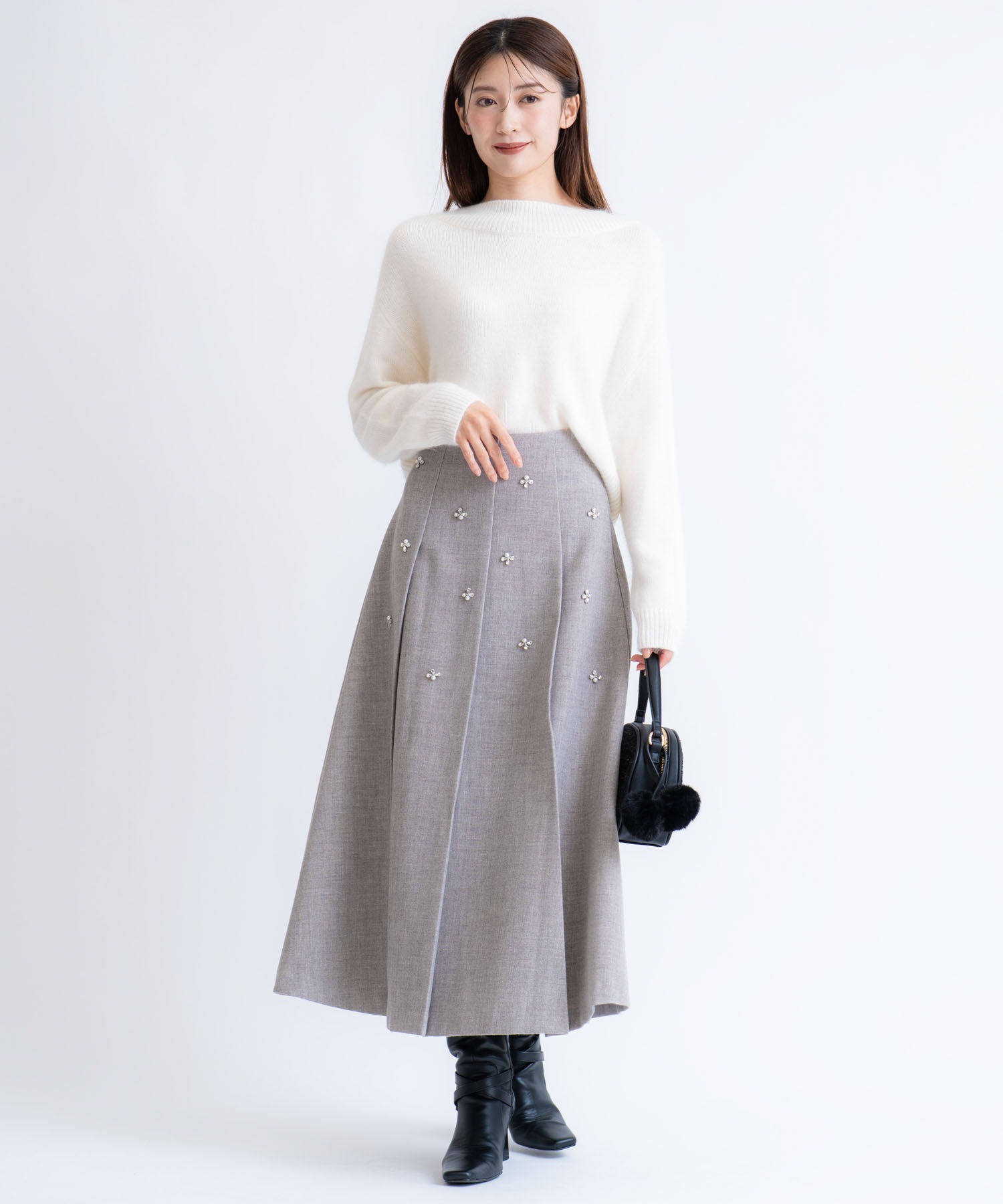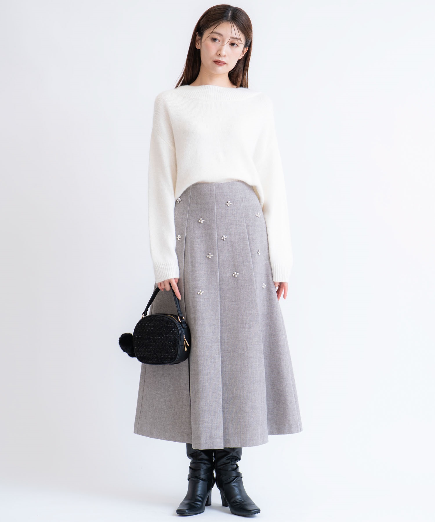 大きめのタックに、パールやビジューを贅沢にあしらったフレアスカート。