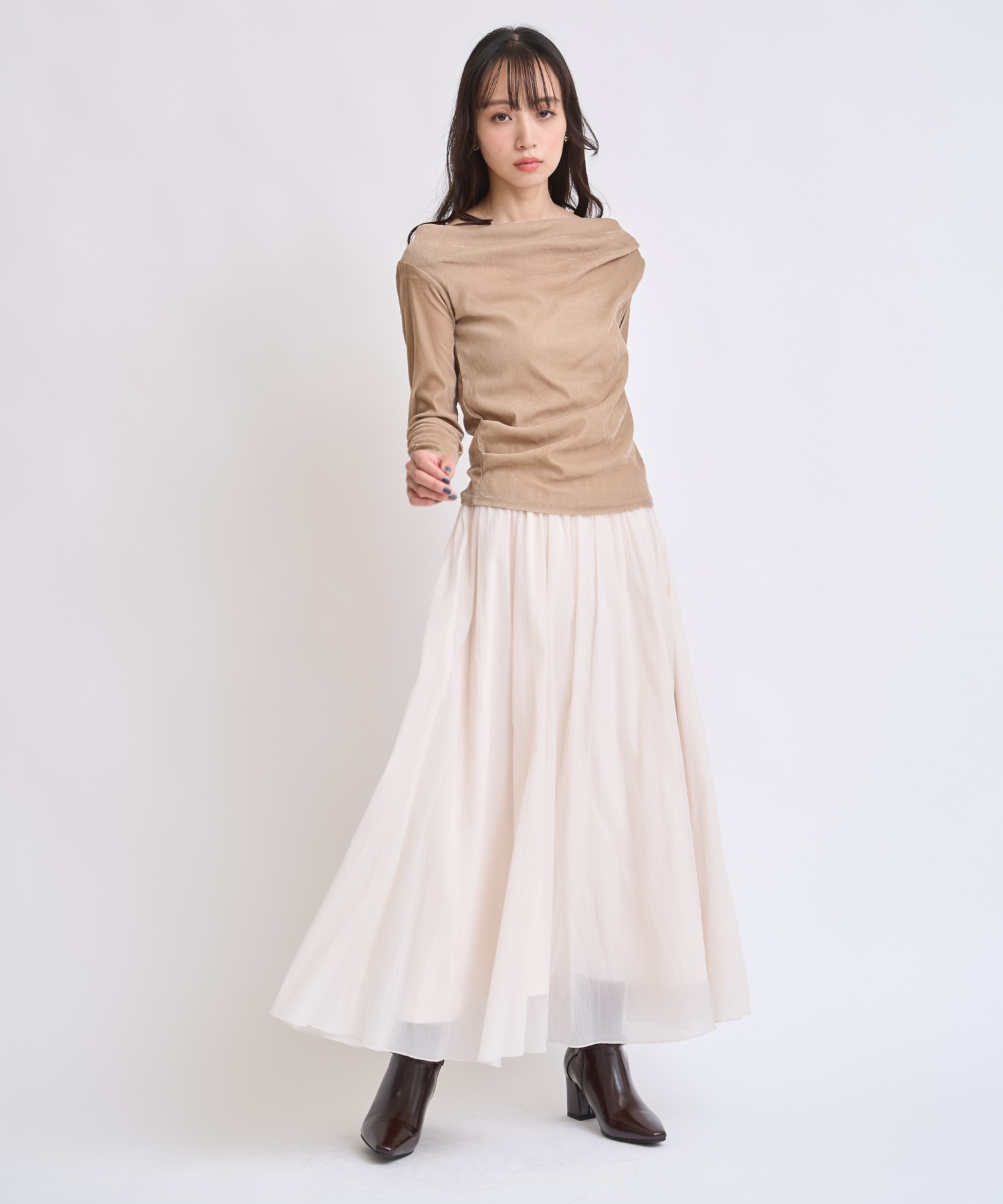 ほんのりとしぼ感があり、表面感のある素材を使用したギャザーフレアスカート。