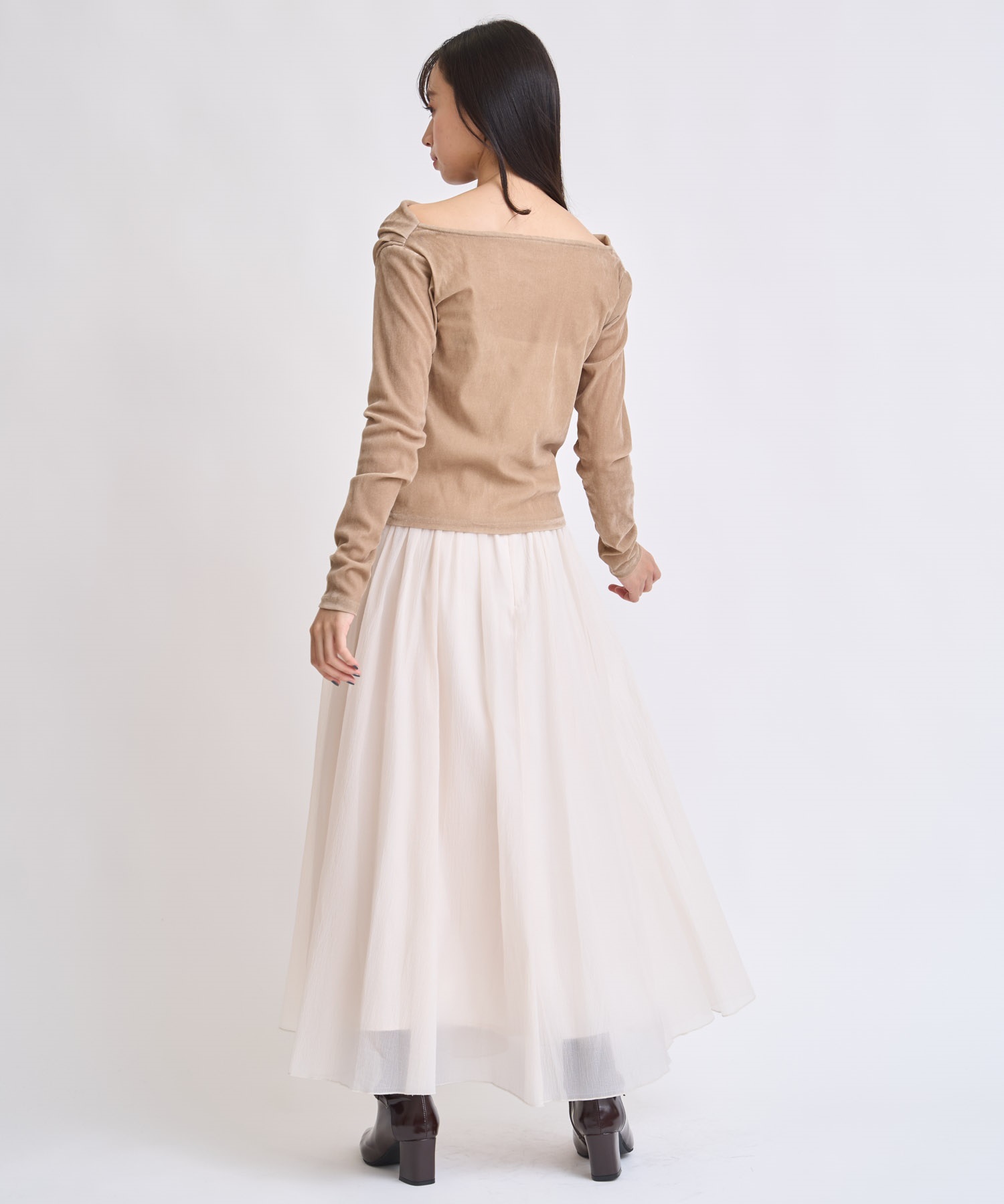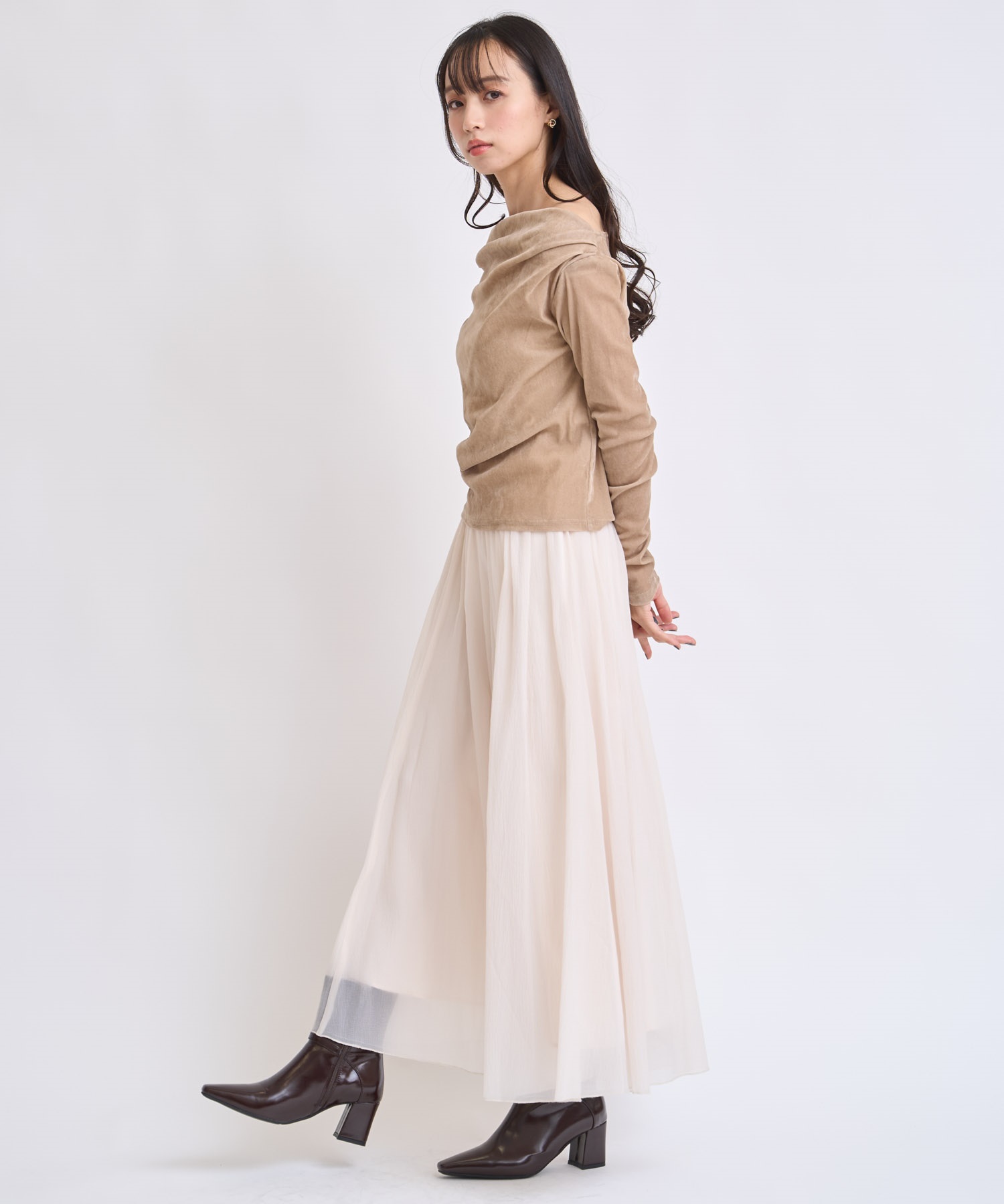 冬でもシアー感や軽やかさがトレンドの中、抜け感のある1枚に仕上げました。