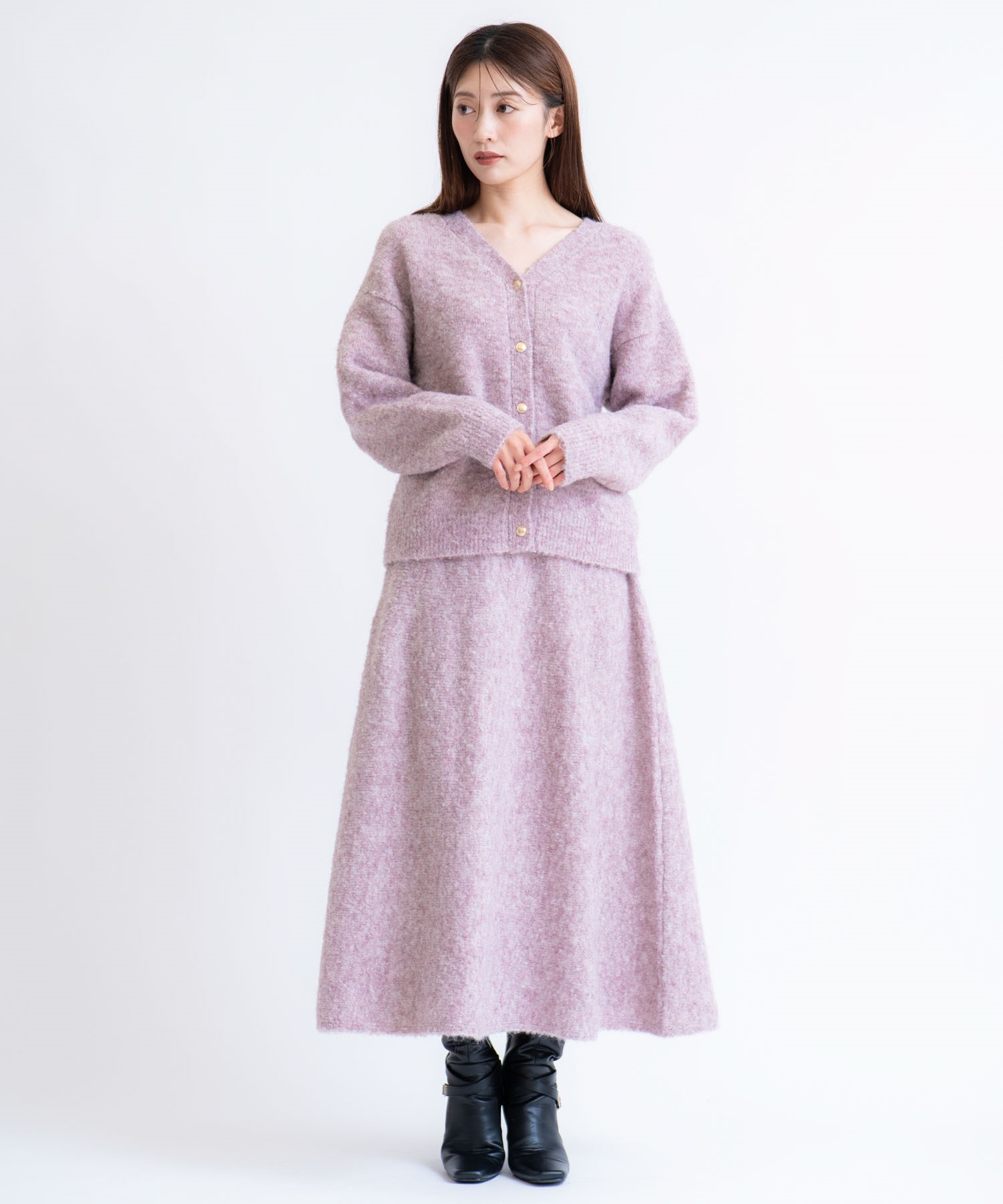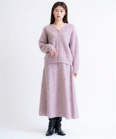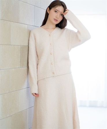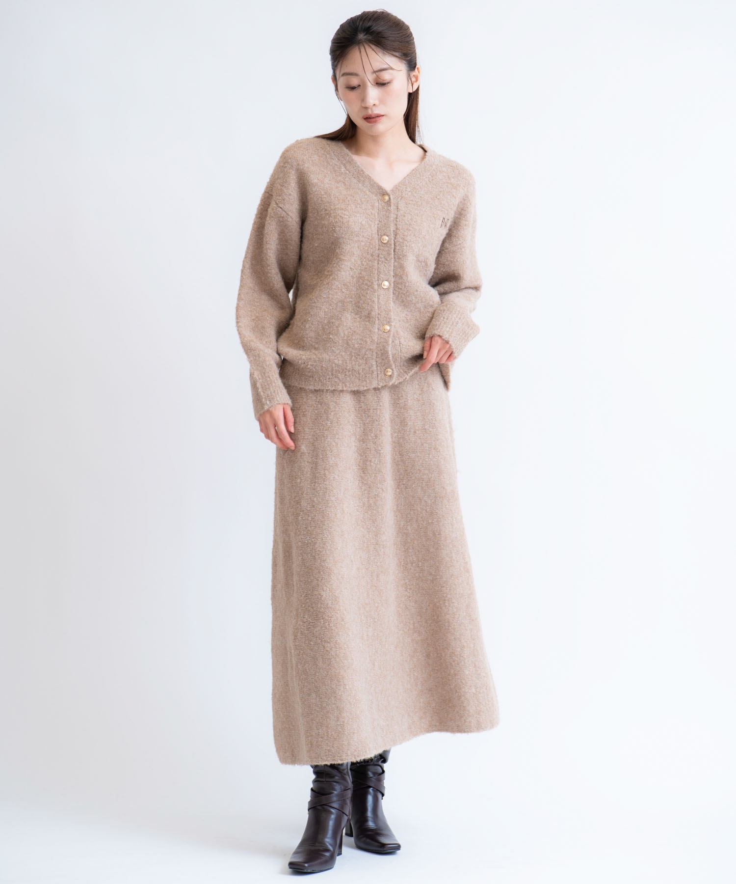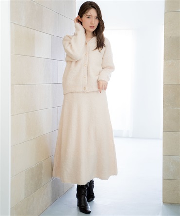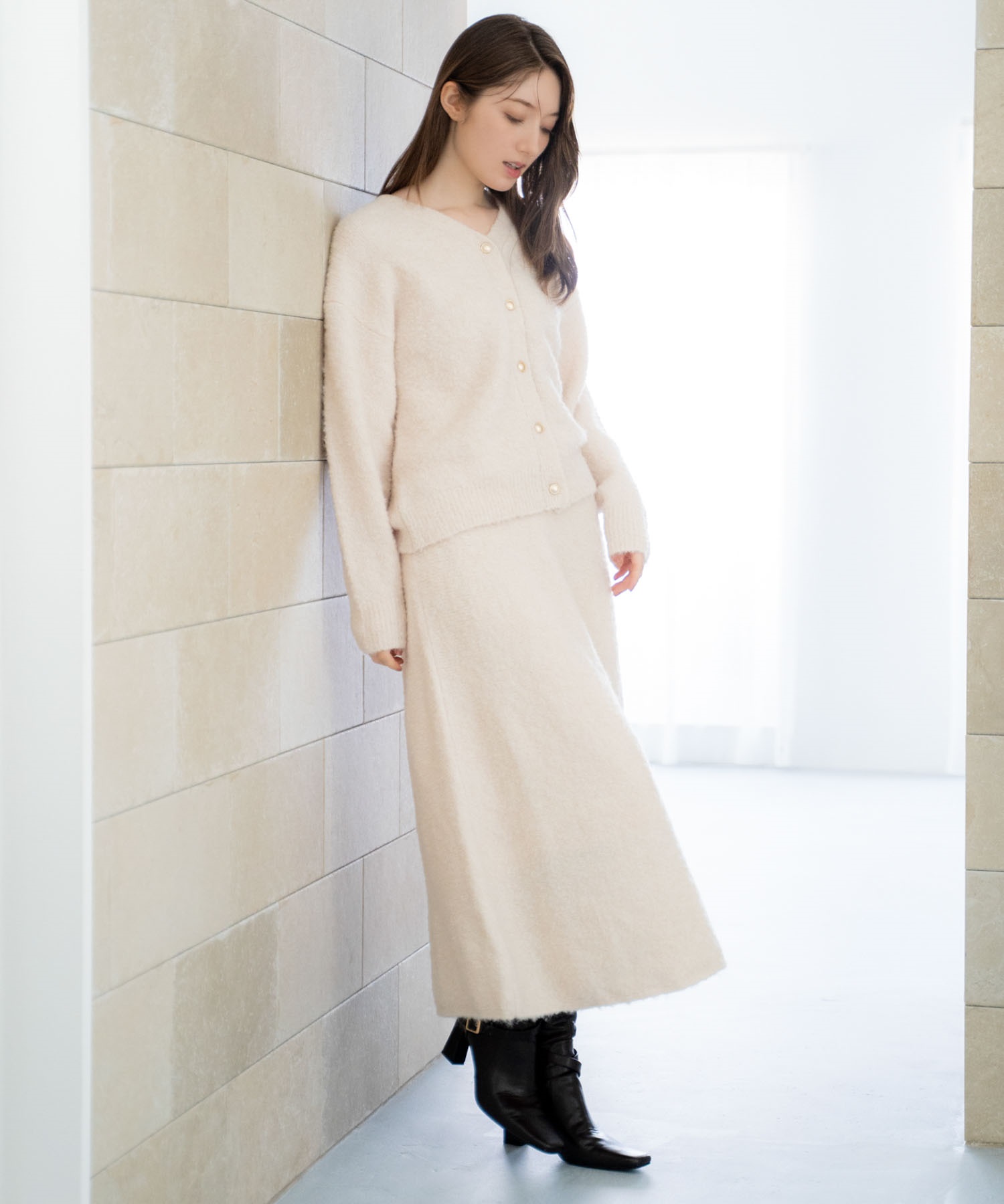 ゆったりシルエットのカーデトップスと、同素材のスカートで抜け感ある着こなしに。