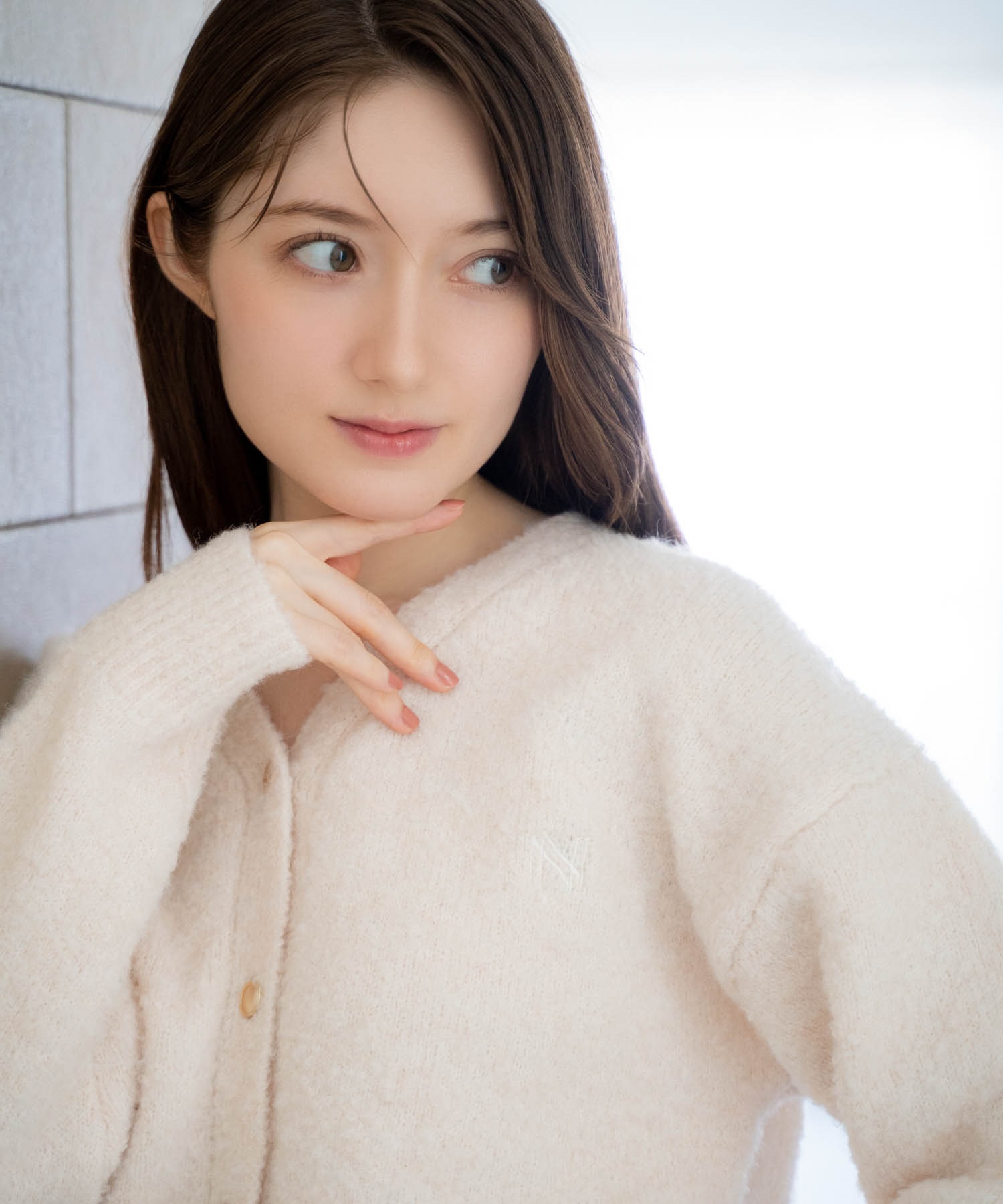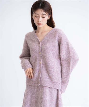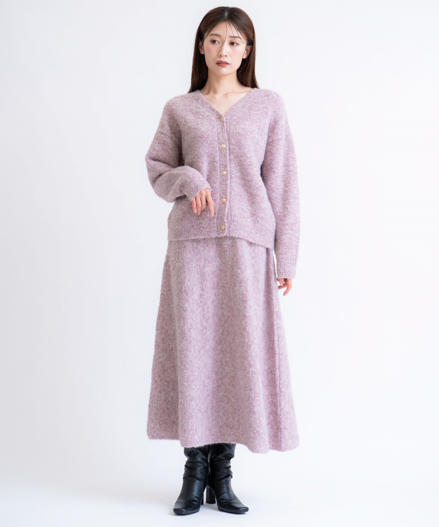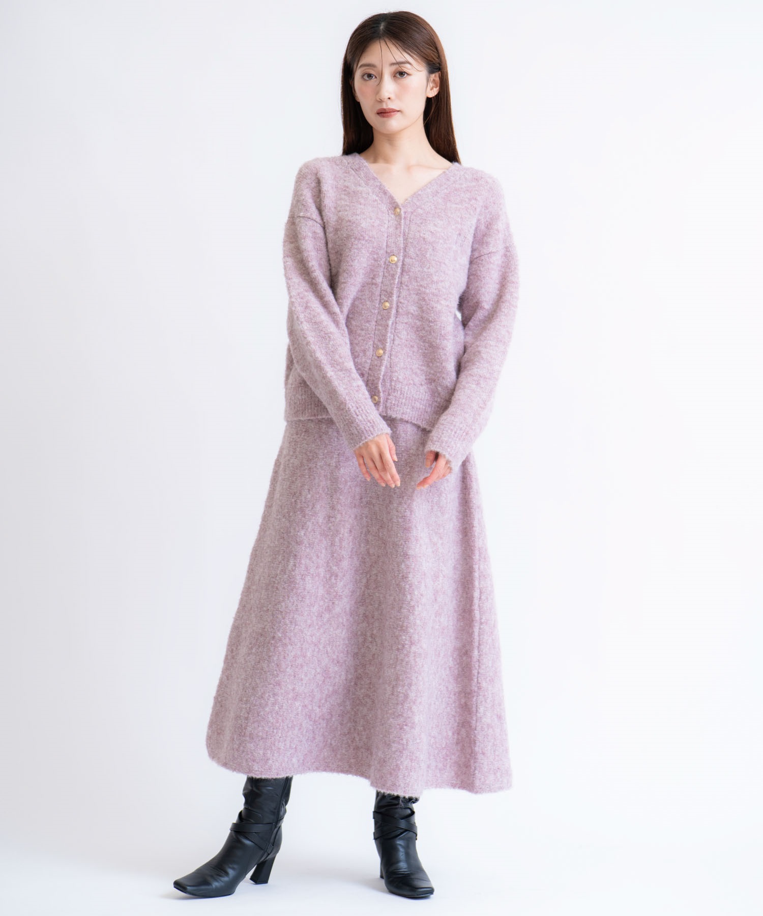 ゆったりシルエットのカーデトップスと、同素材のスカートで抜け感ある着こなしに。