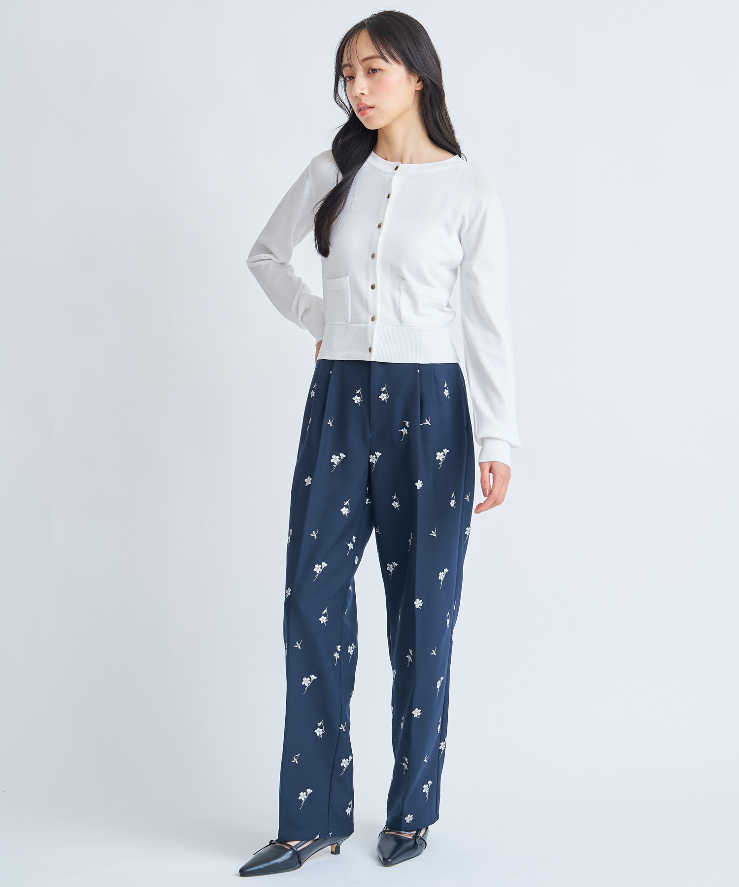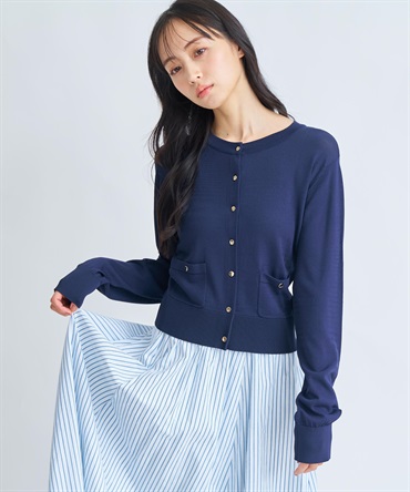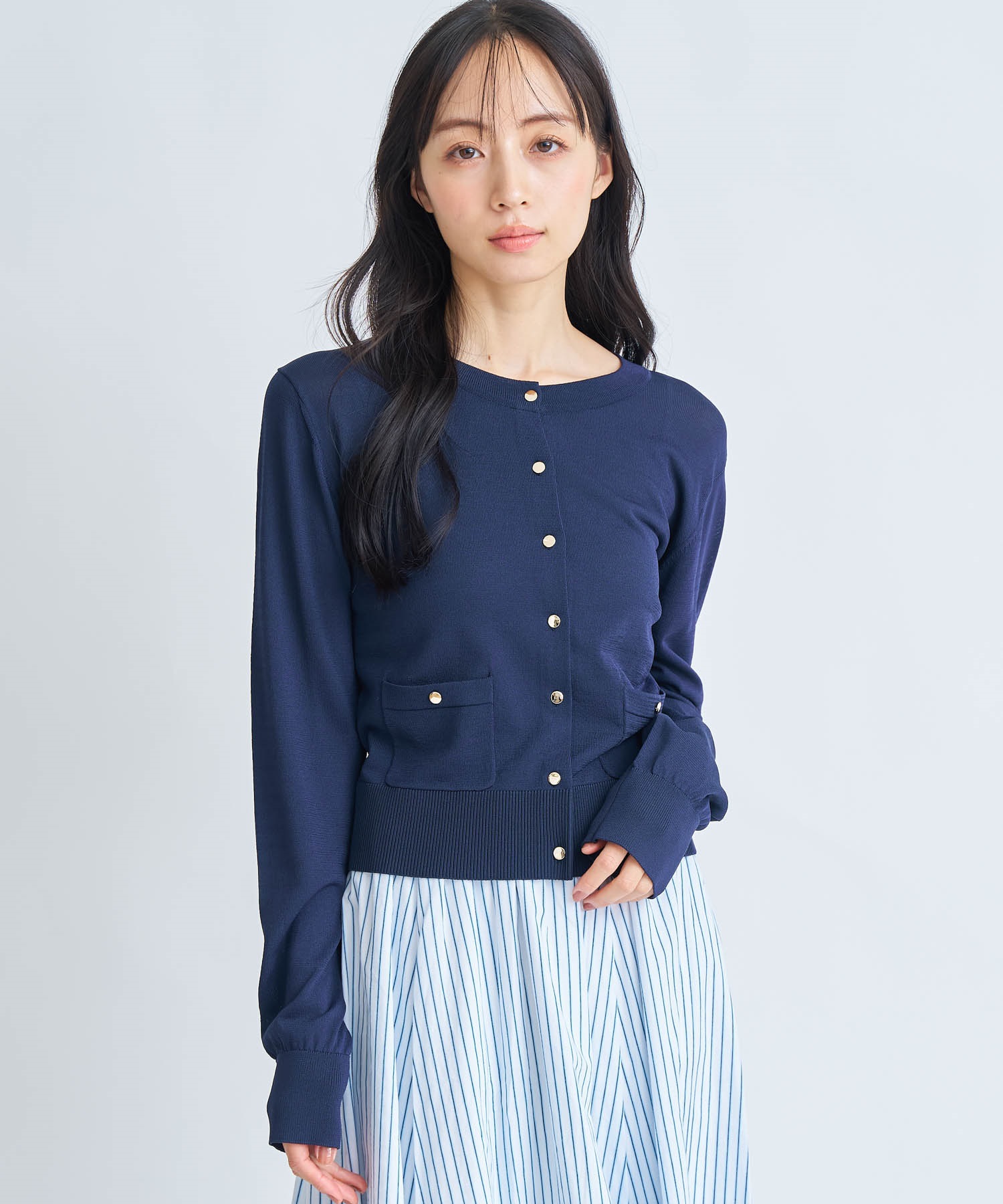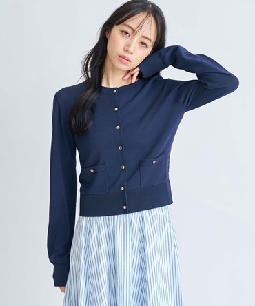 コンパクトな丈感とフロントのゴールドボタンが、スタイルをすっきり見せるポイント。