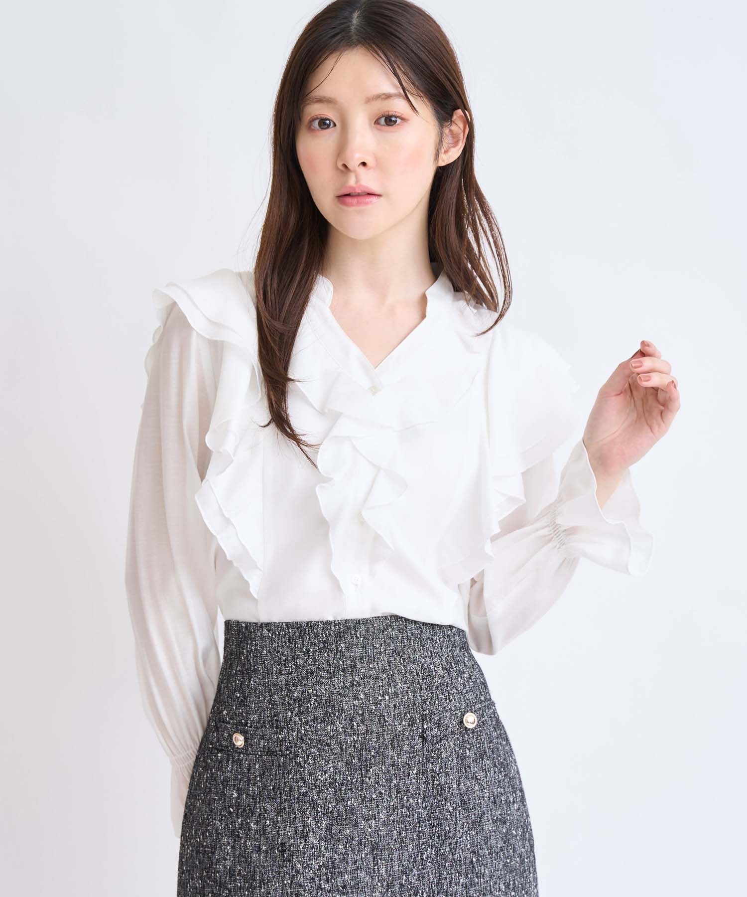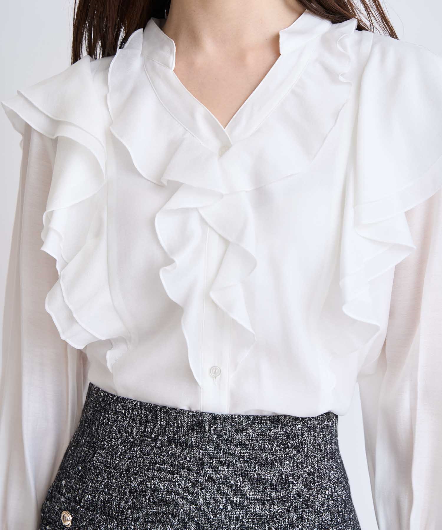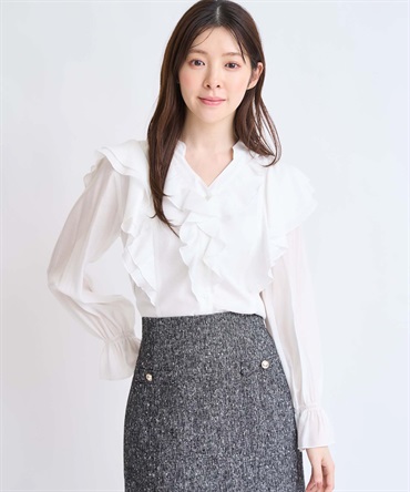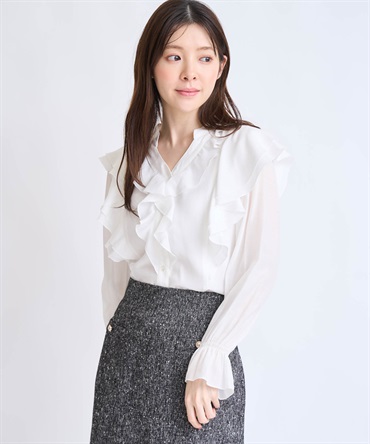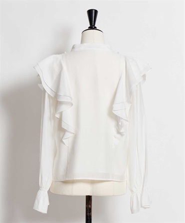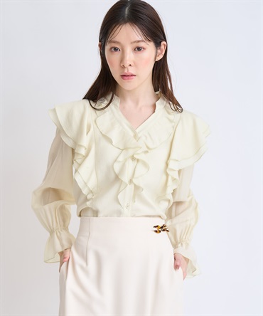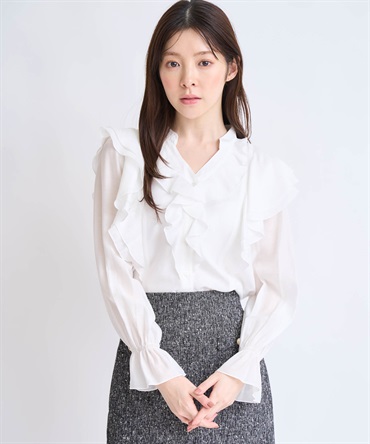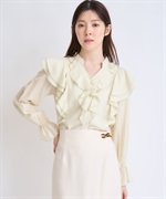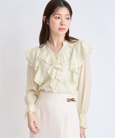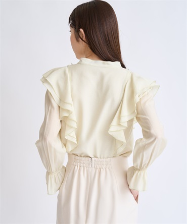 柔らかく程よいシアー素材を使用したフリルブラウス。