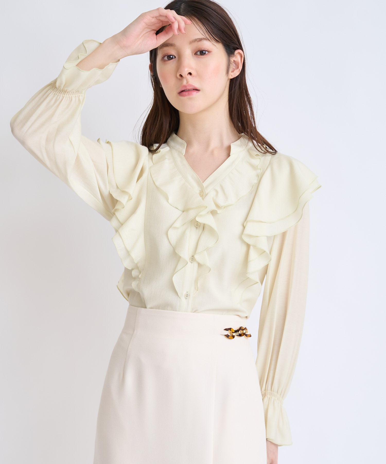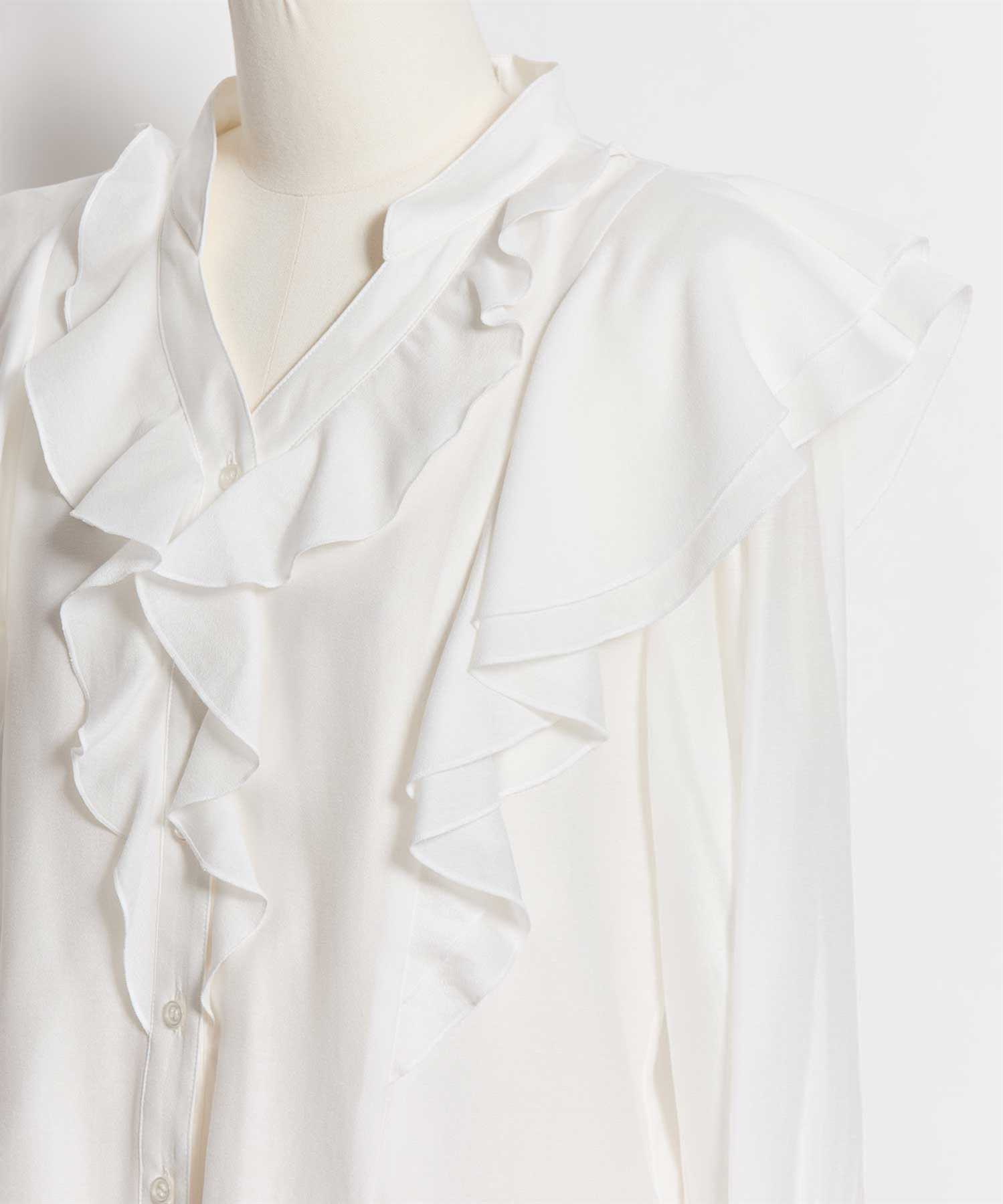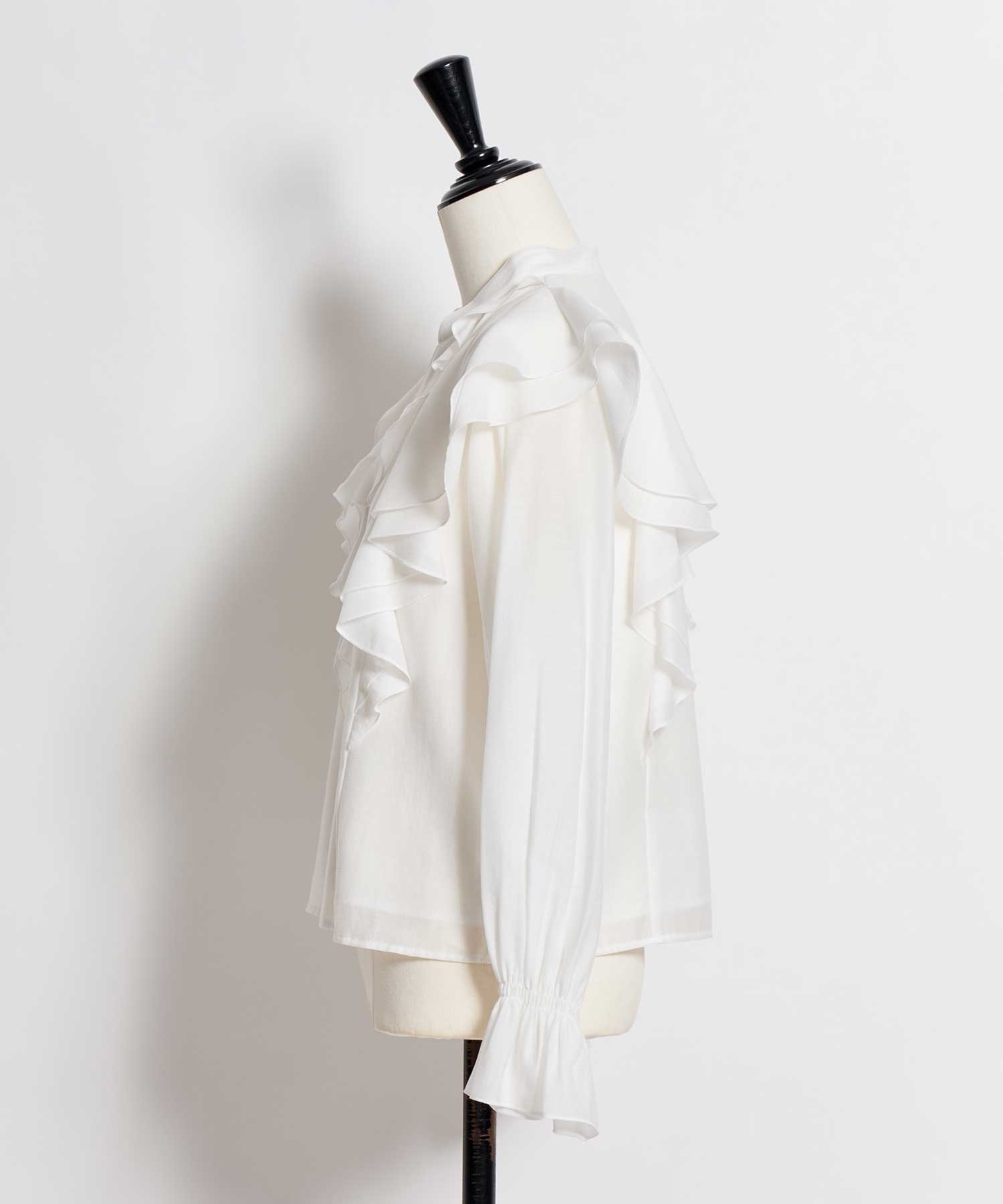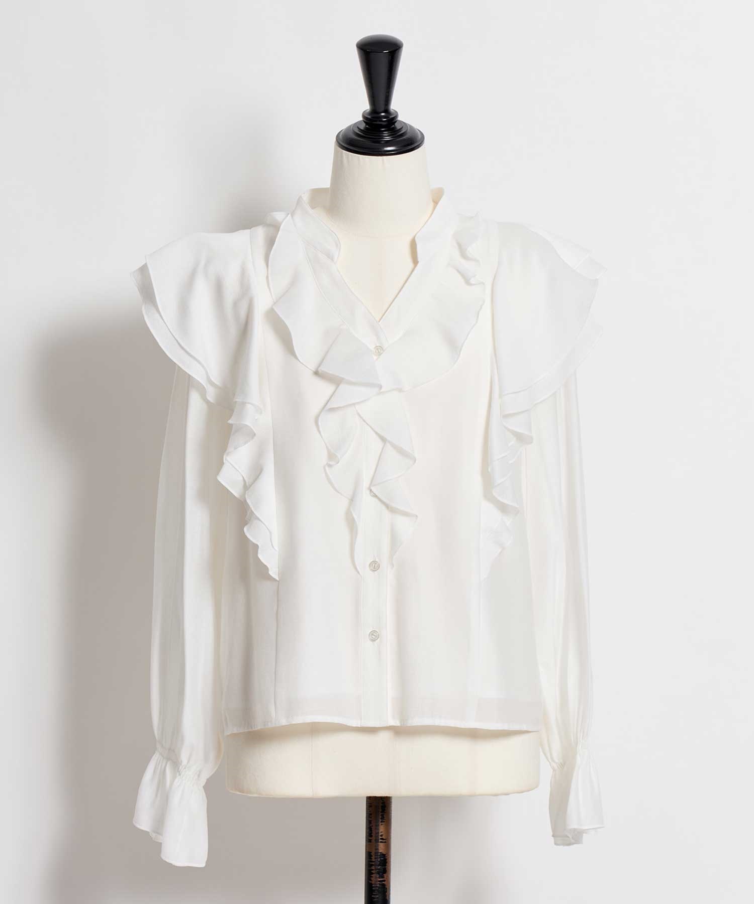 柔らかく程よいシアー素材を使用したフリルブラウス。