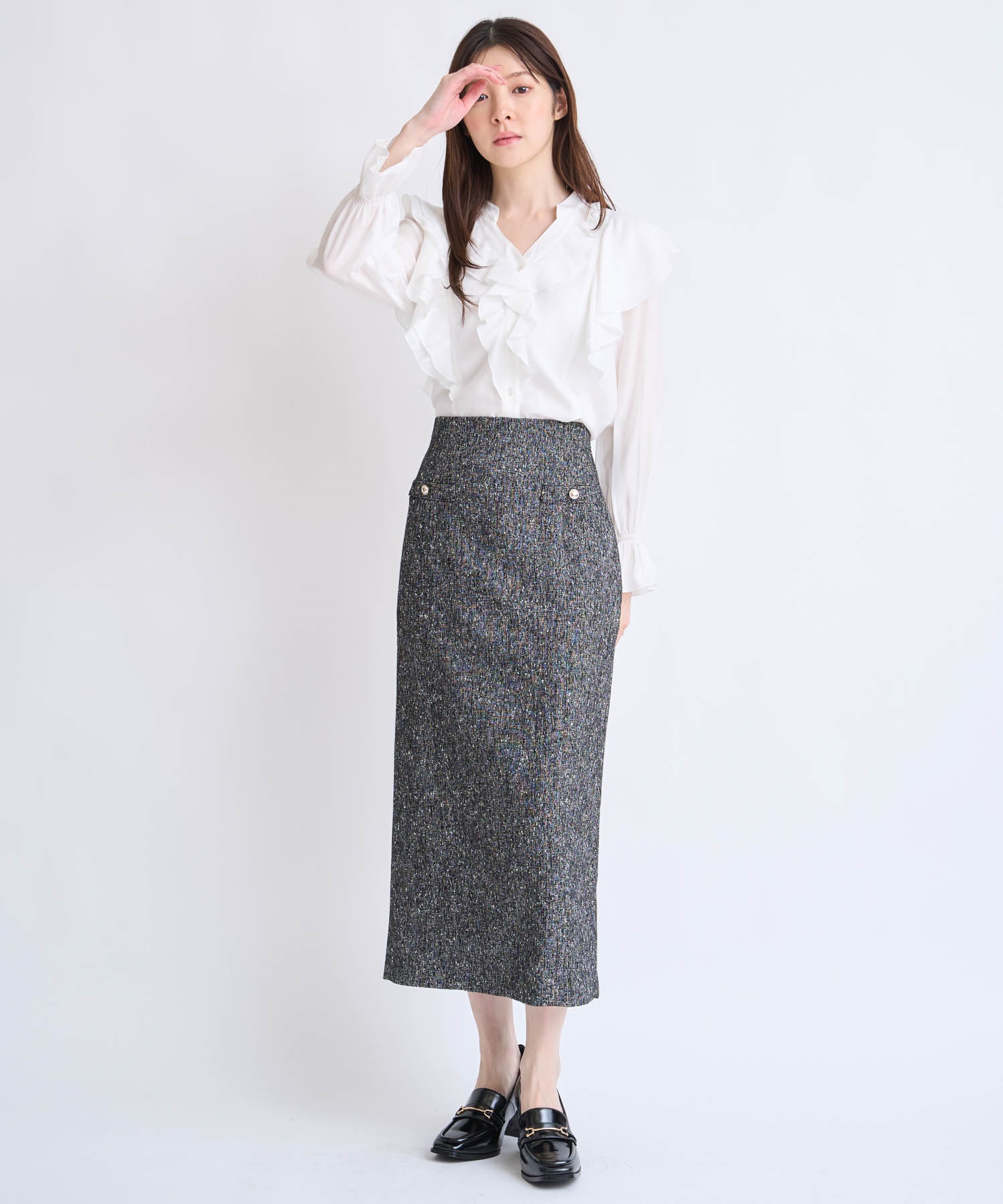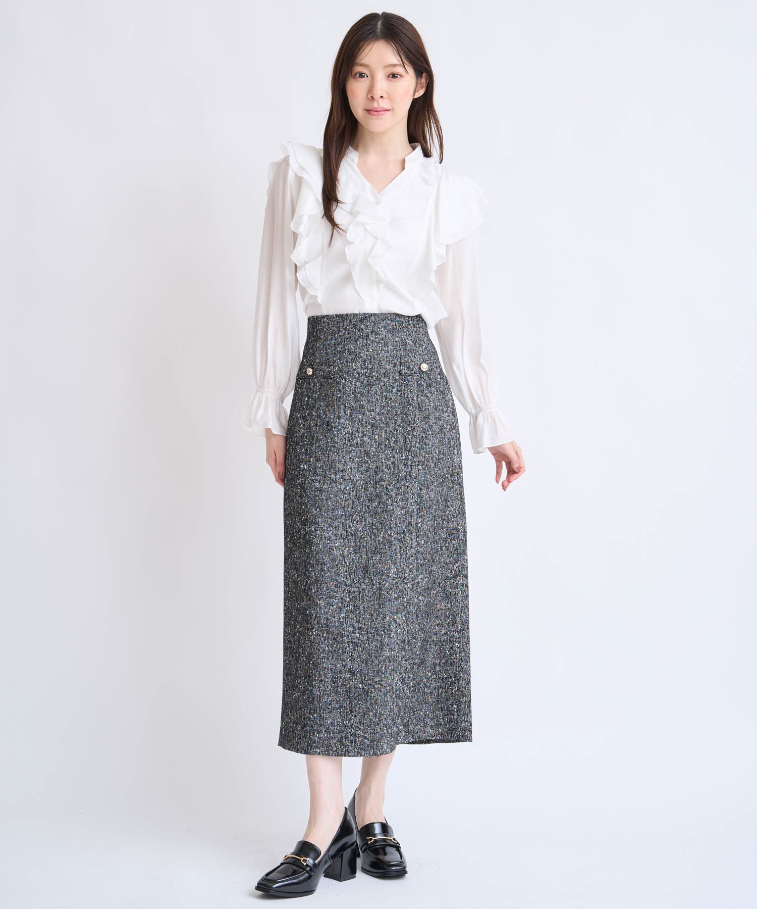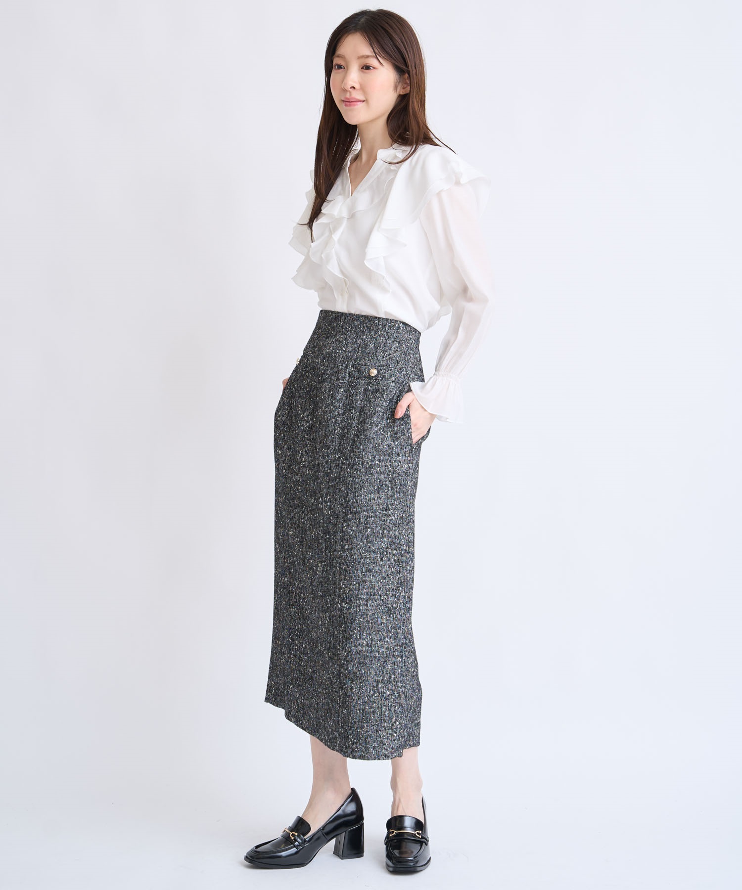縦に落ちるフリルが華やかさを添えつつ、主張しすぎない絶妙なボリューム感。