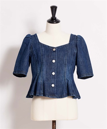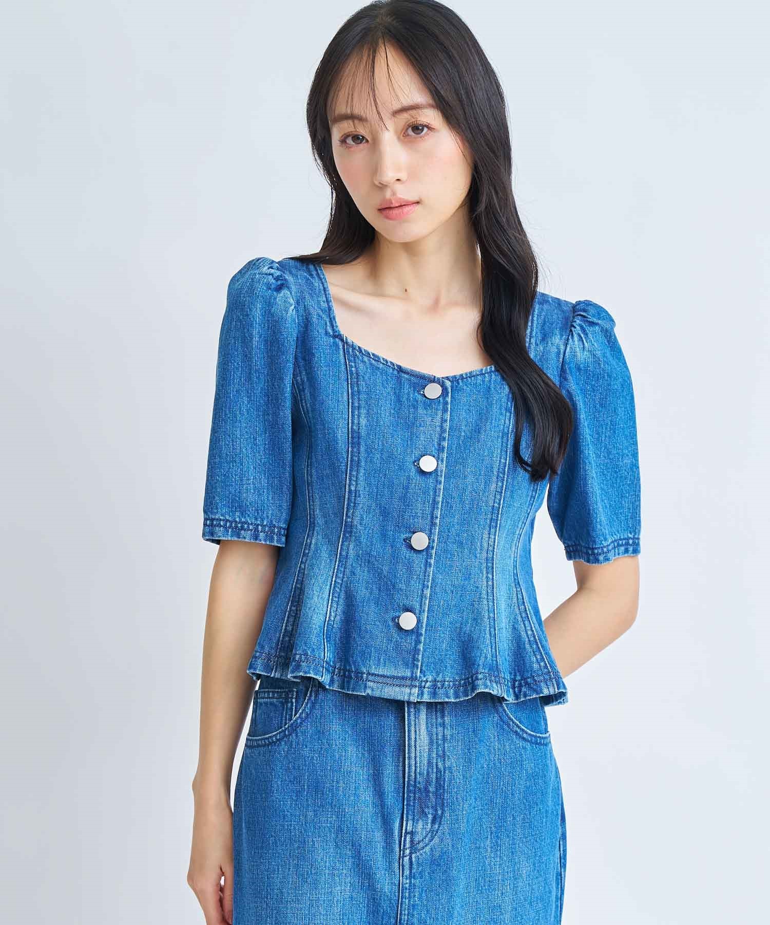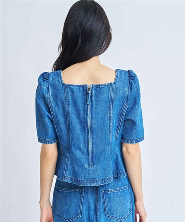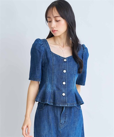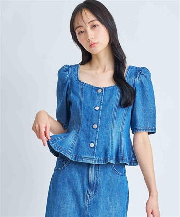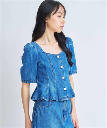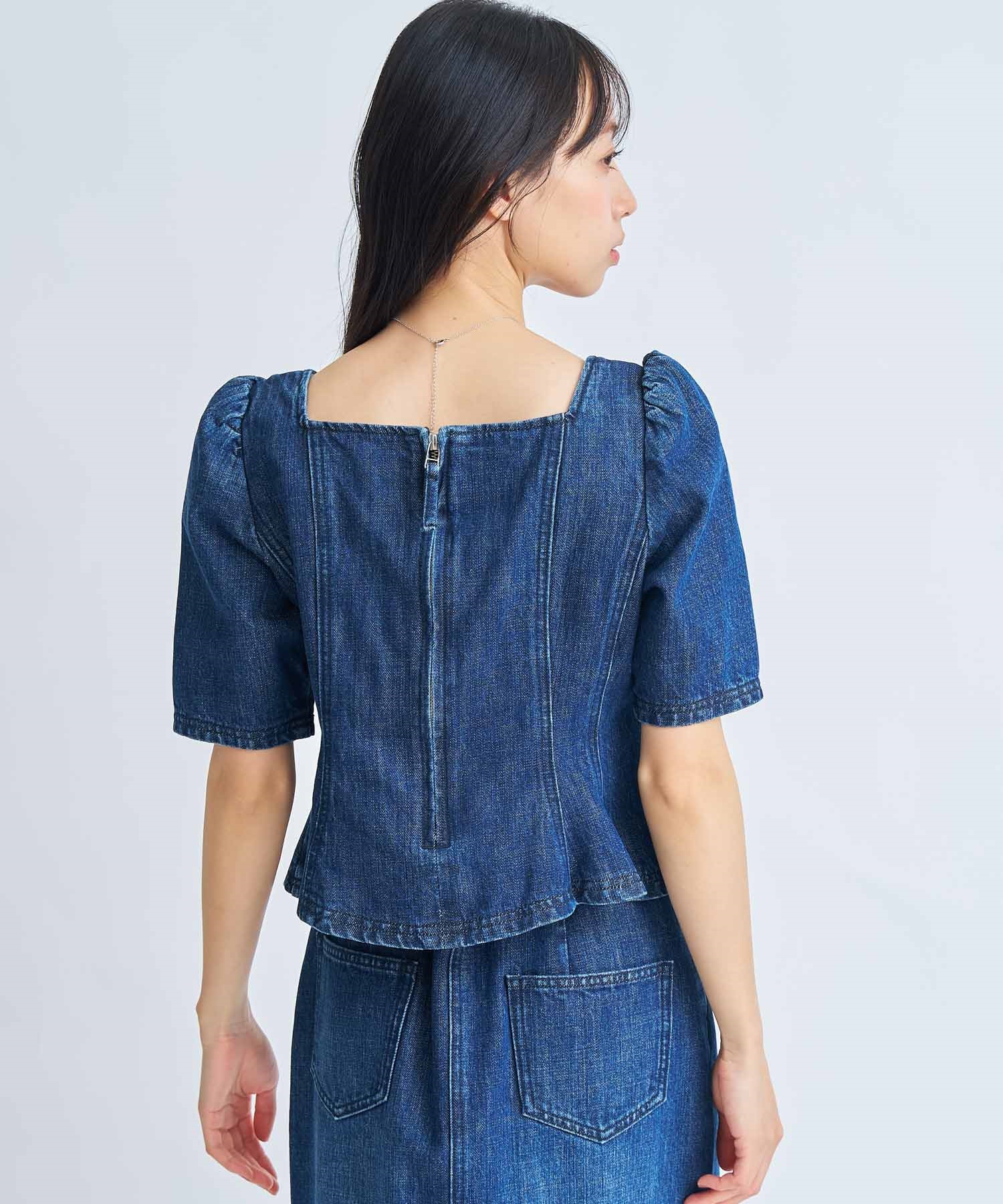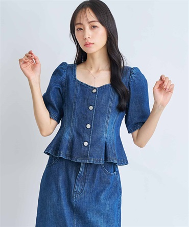 デニム素材を使用した、程よくカジュアルで女性らしさを添えるトップス。