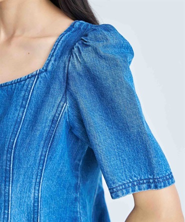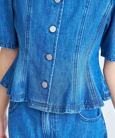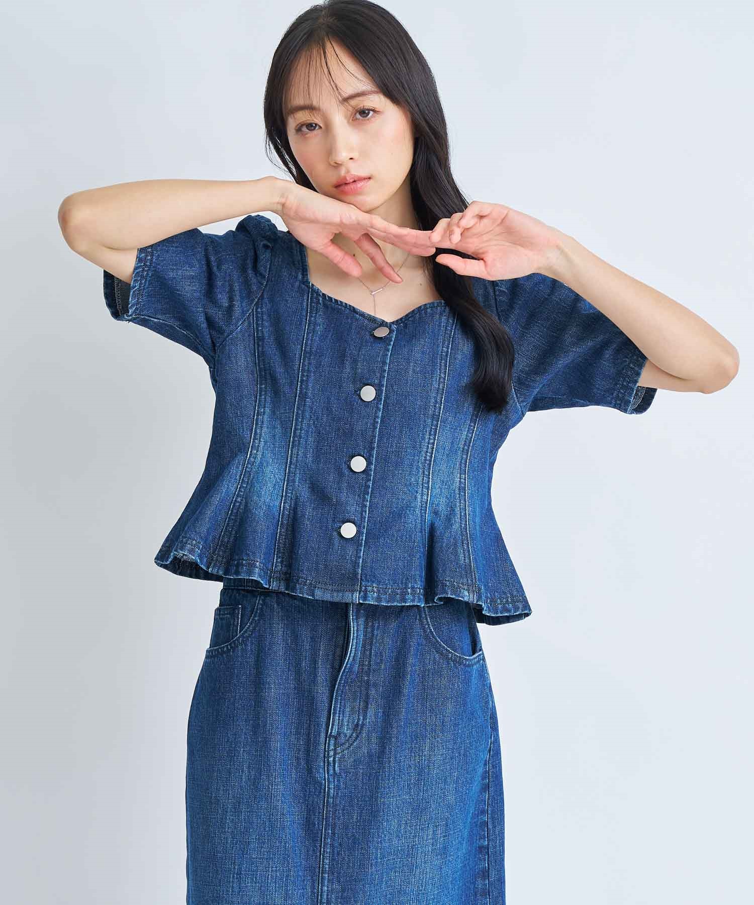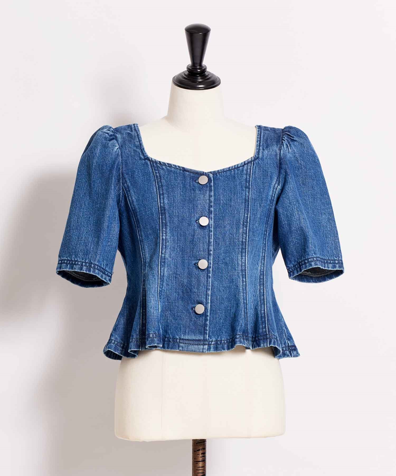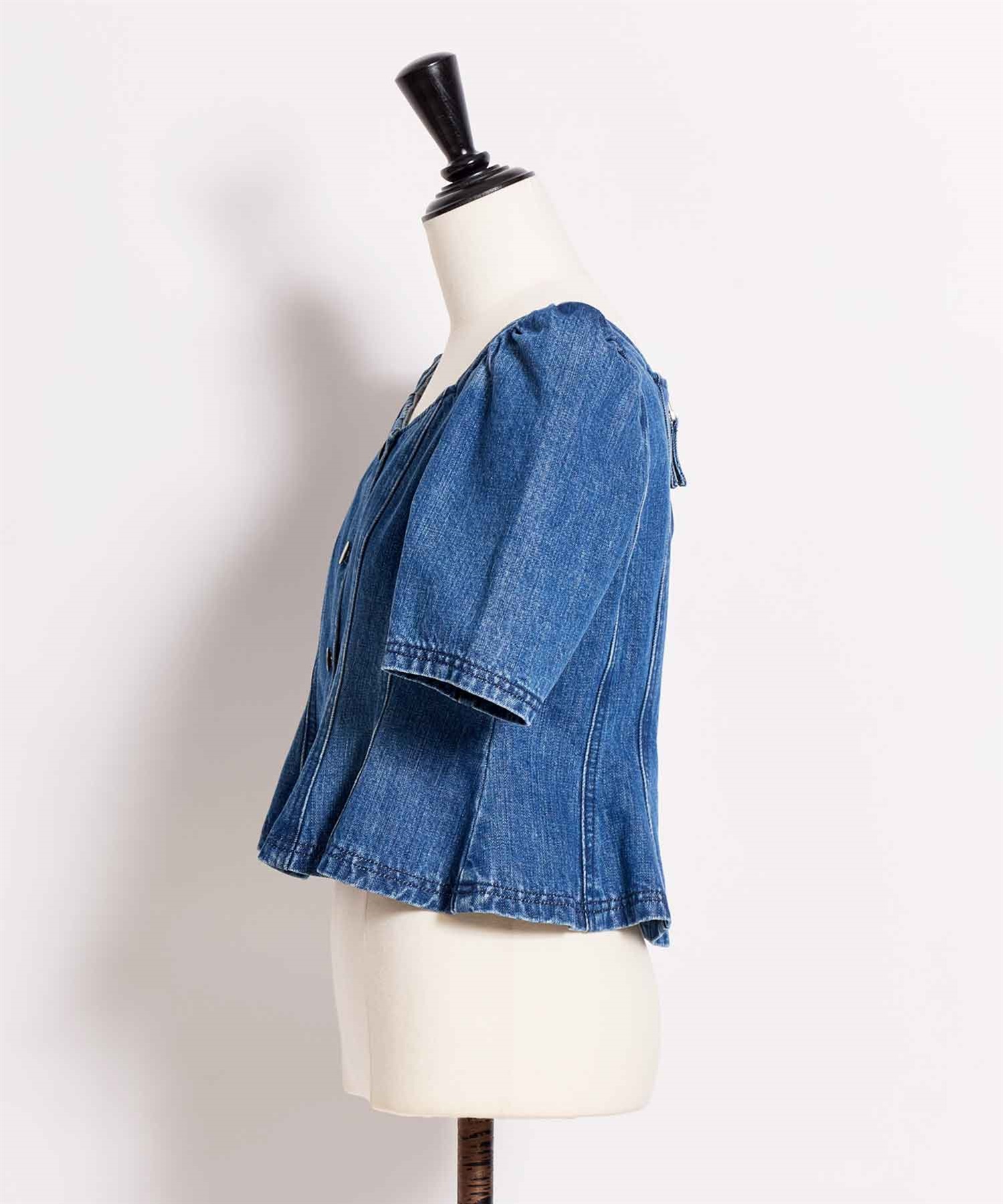デニム素材を使用した、程よくカジュアルで女性らしさを添えるトップス。