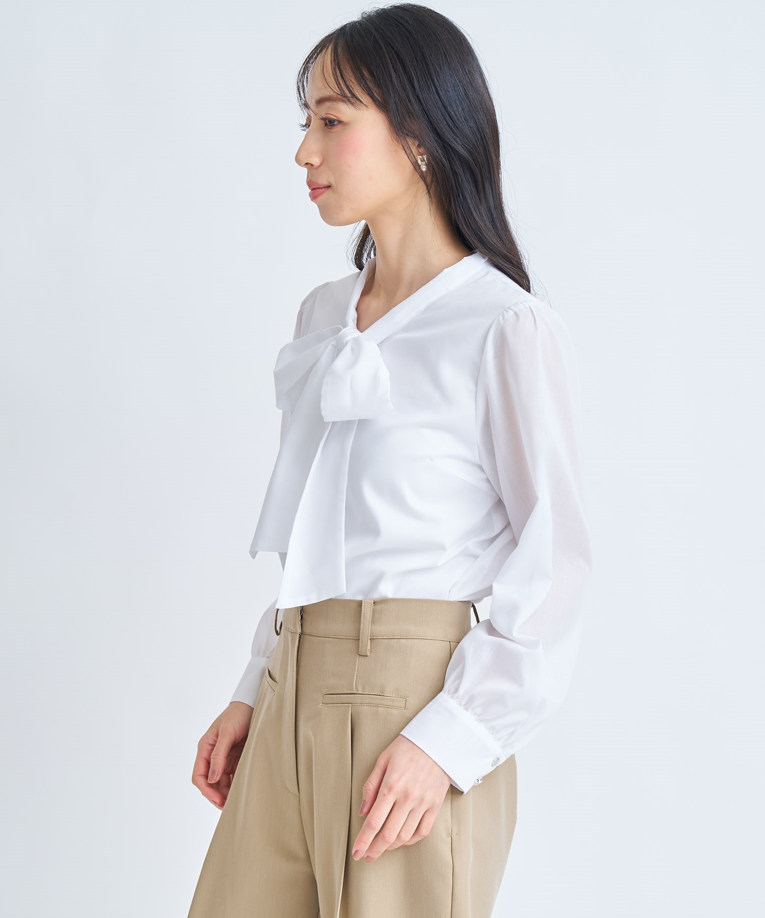 大きめのボウタイリボンが視線を惹く、華やかなデザインブラウス。