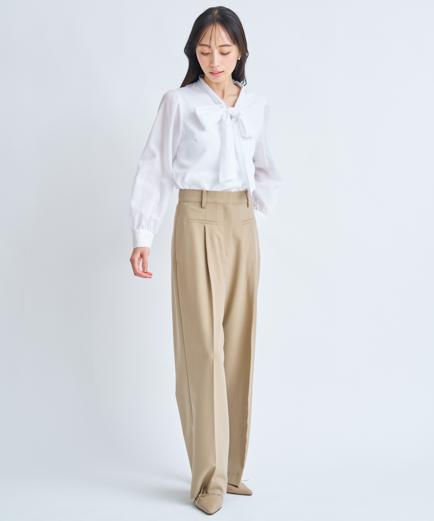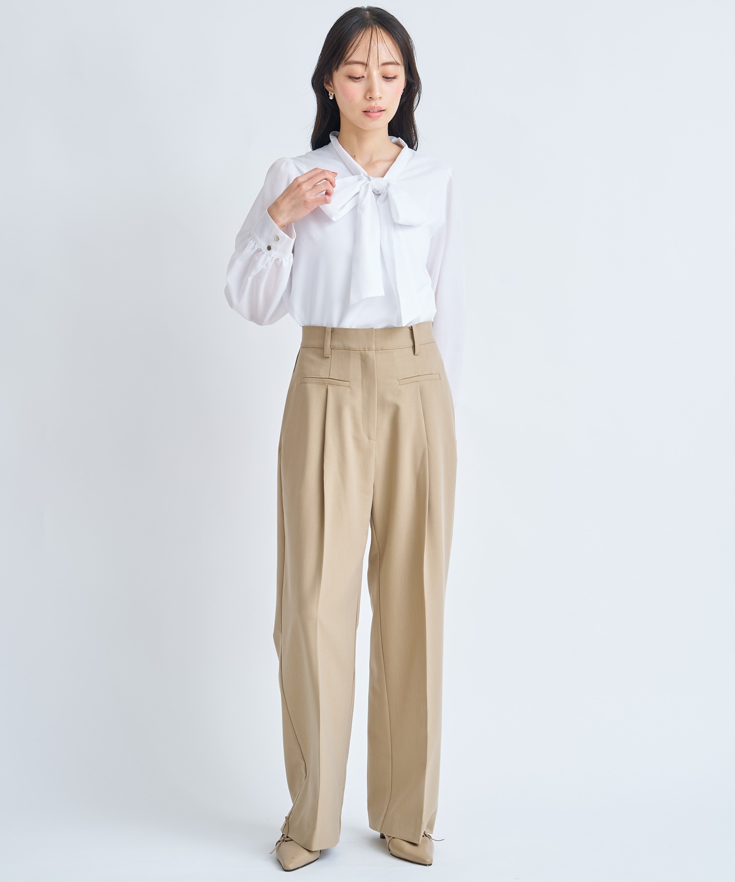 滑らかで落ち感のある軽やかな素材を使用し、上品な印象に。