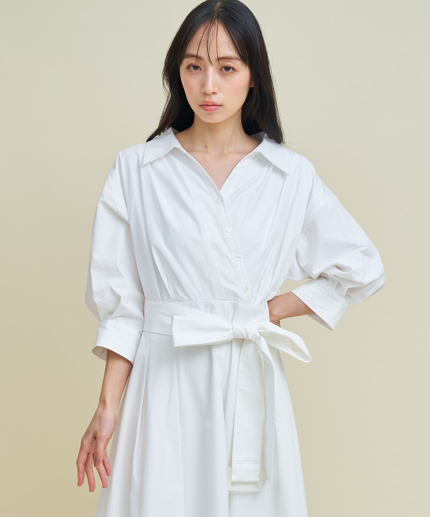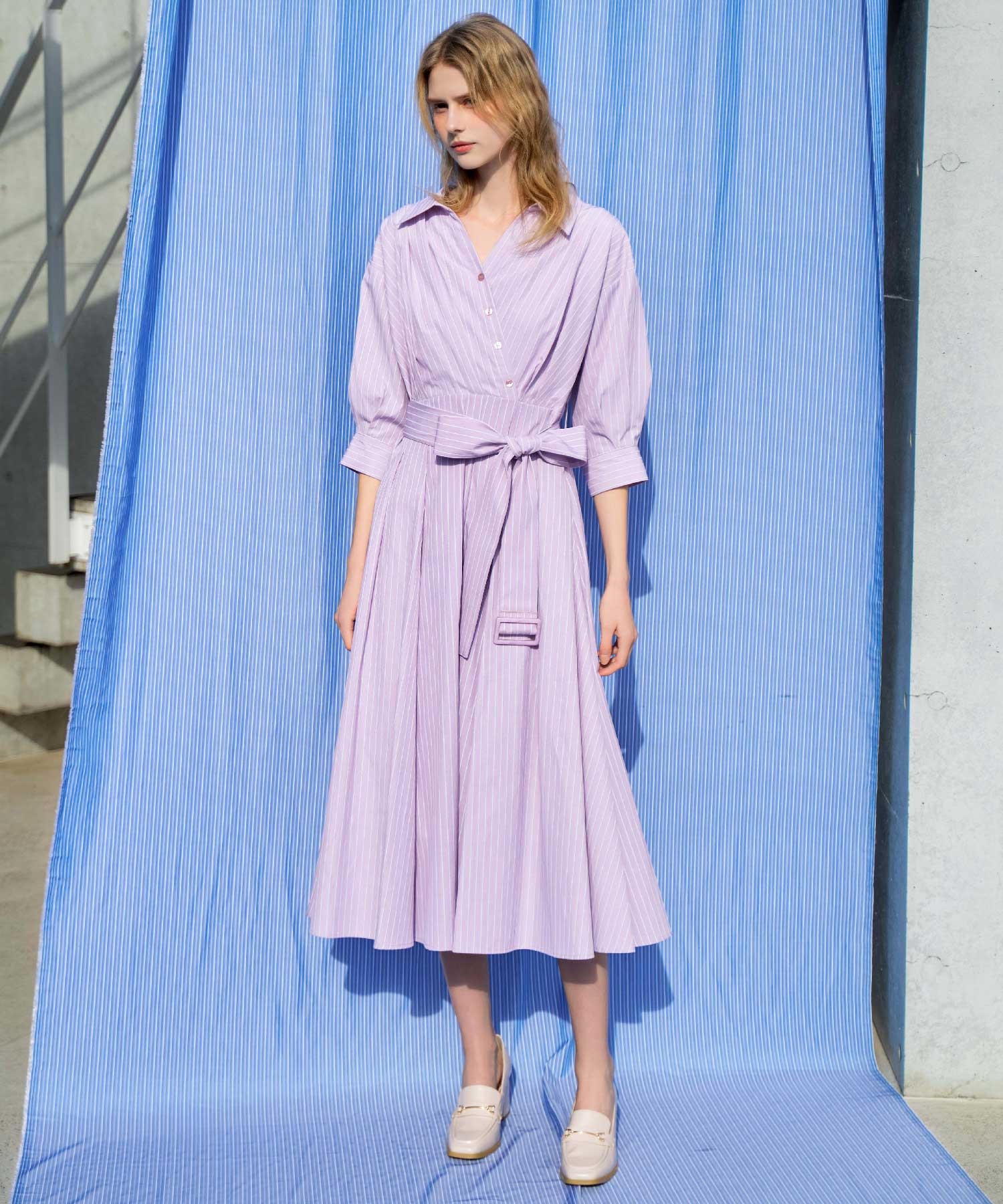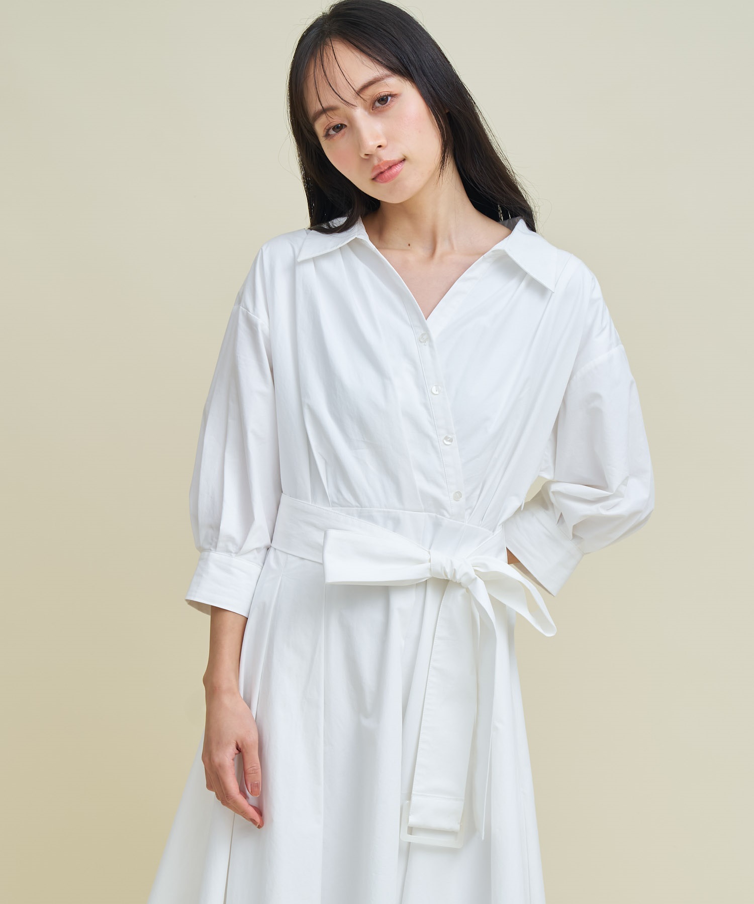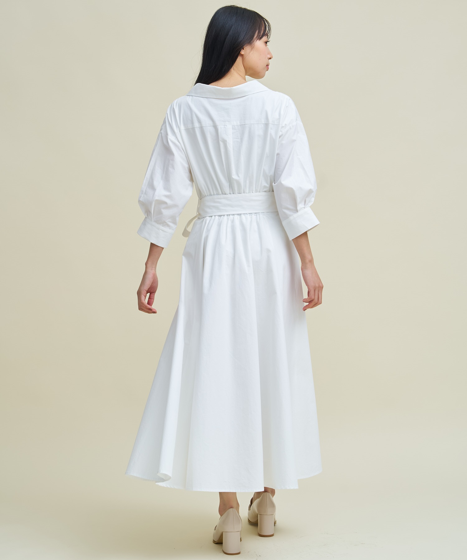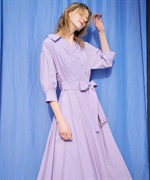 共地のウエストベルトで目線を上げ、裾にたっぷりとフレア分量を施して女性らしい印象に。