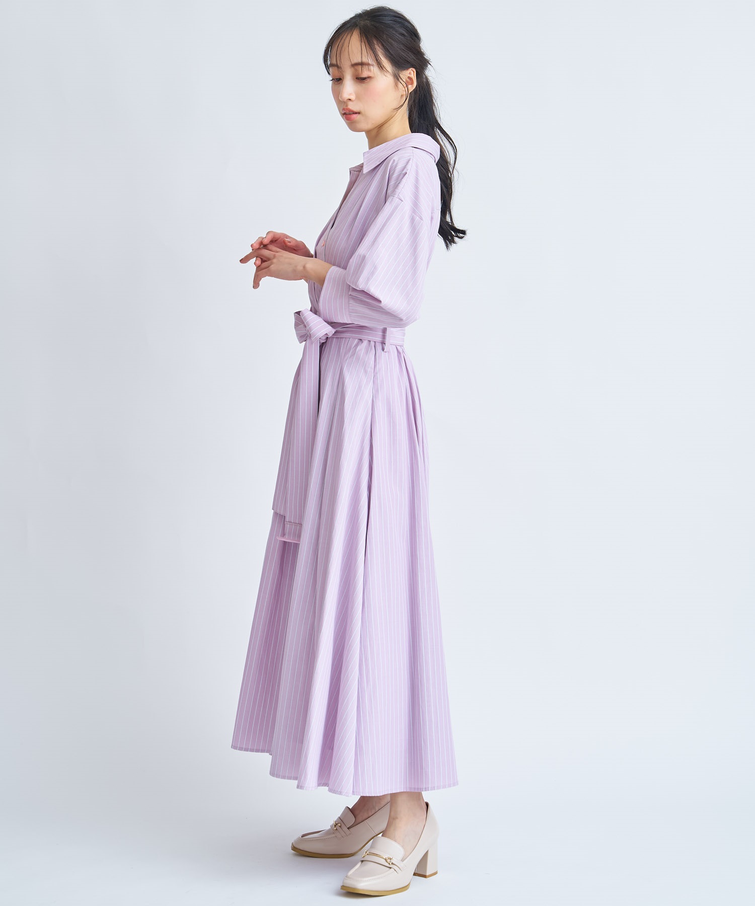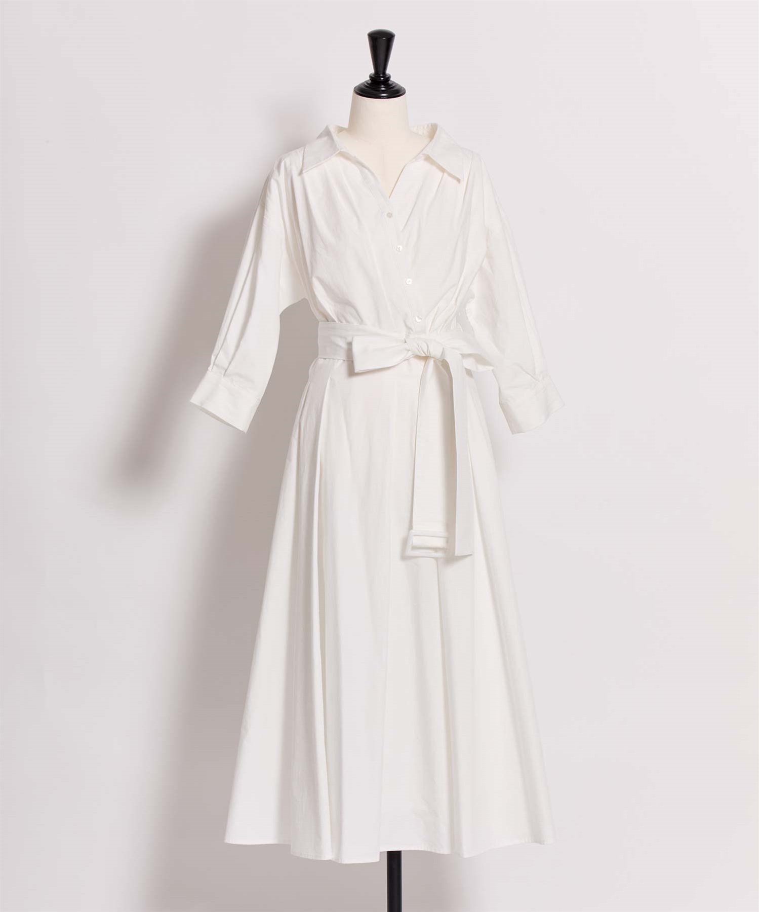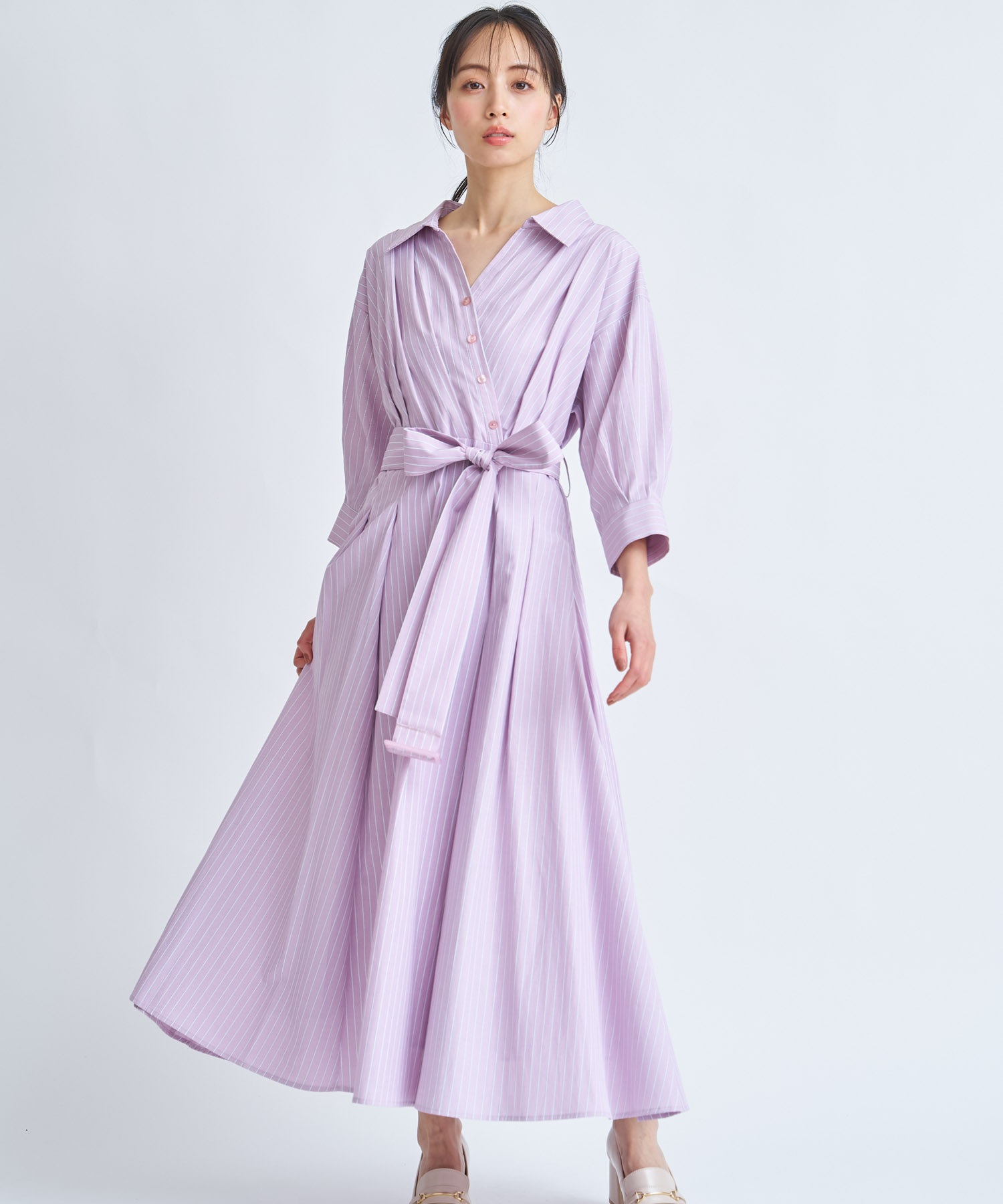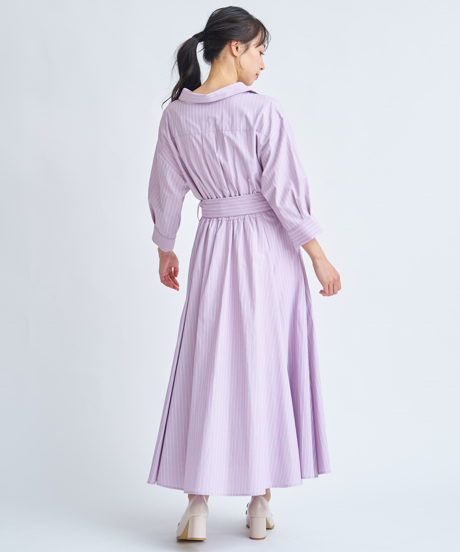 共地のウエストベルトで目線を上げ、裾にたっぷりとフレア分量を施して女性らしい印象に。