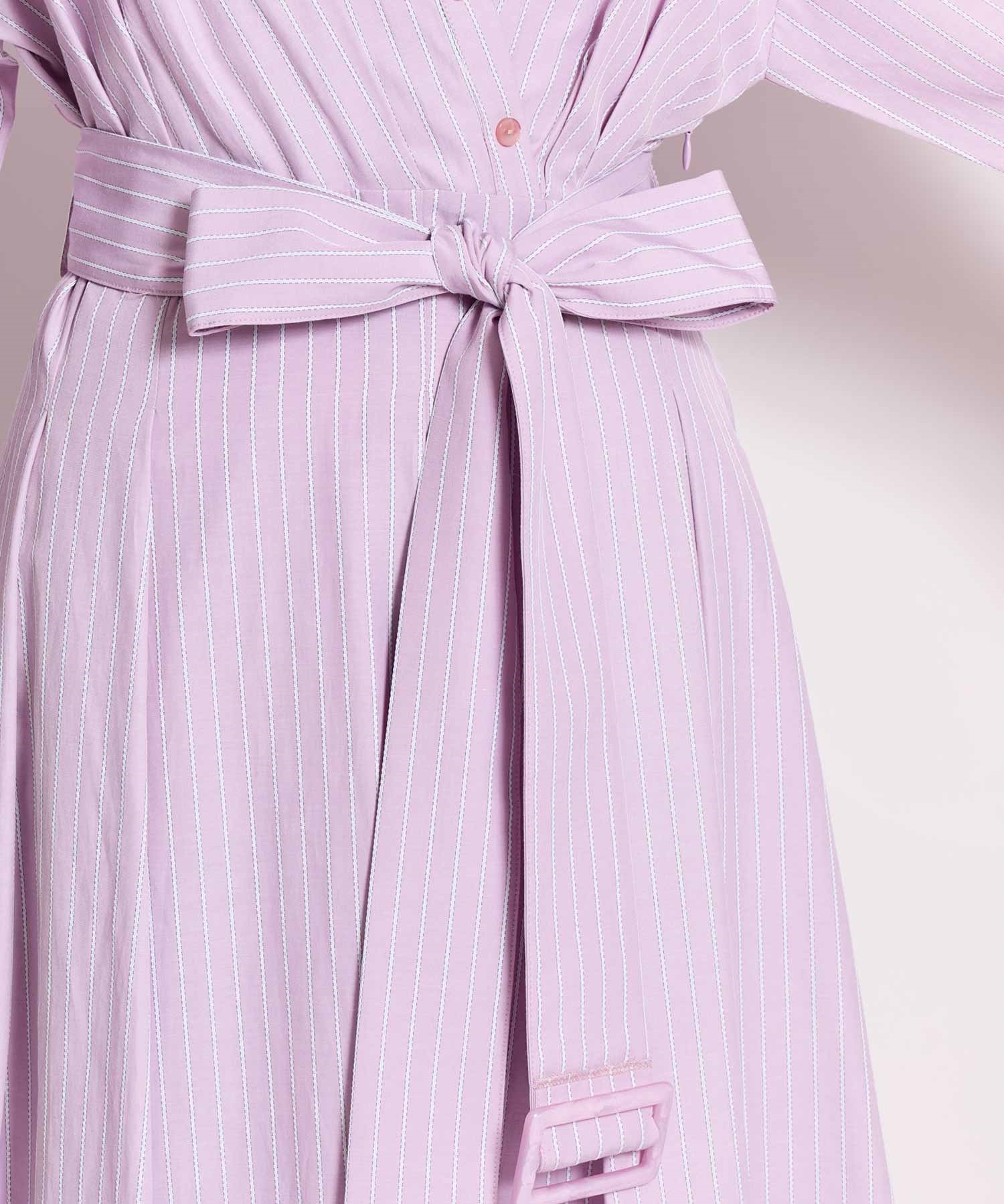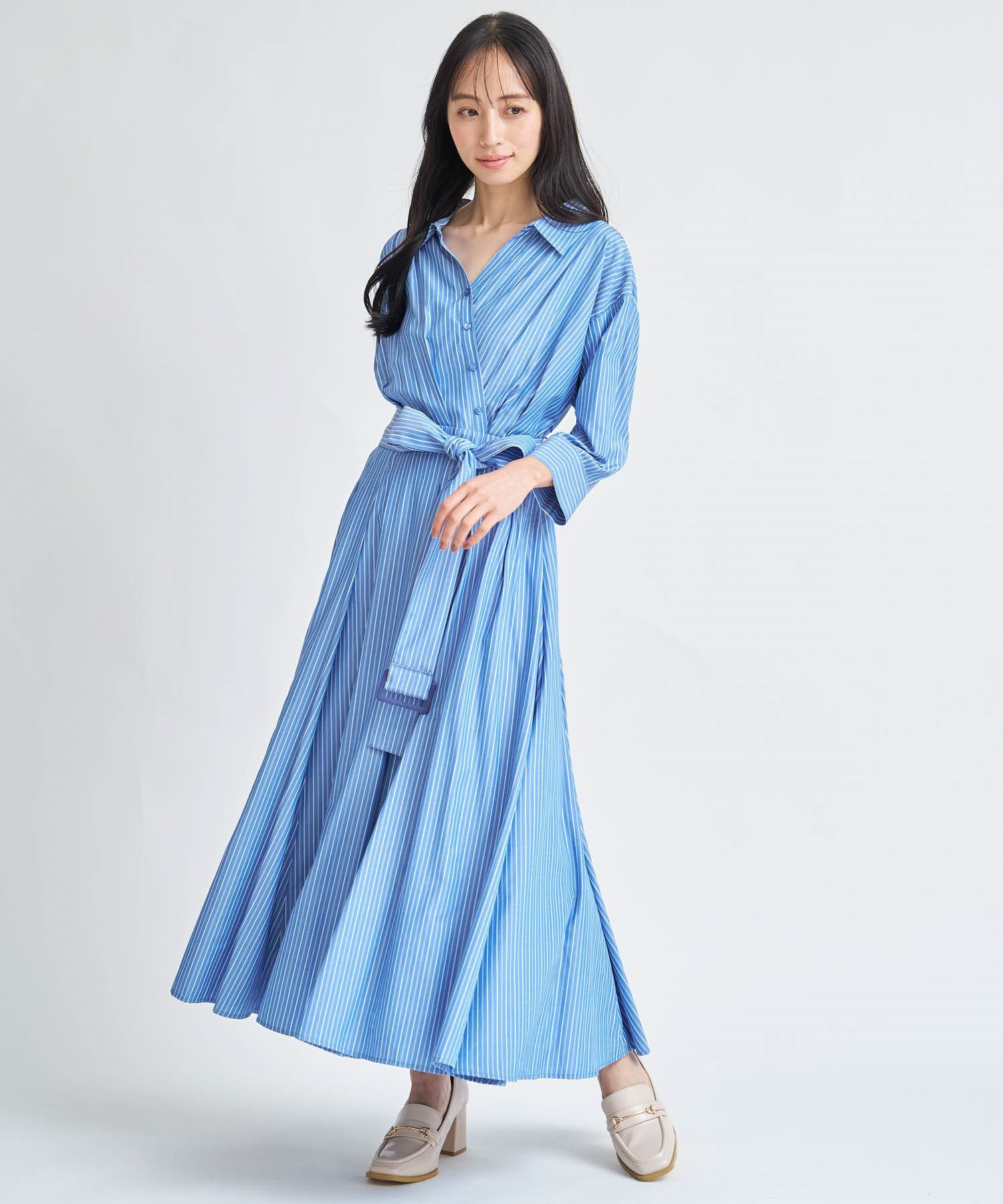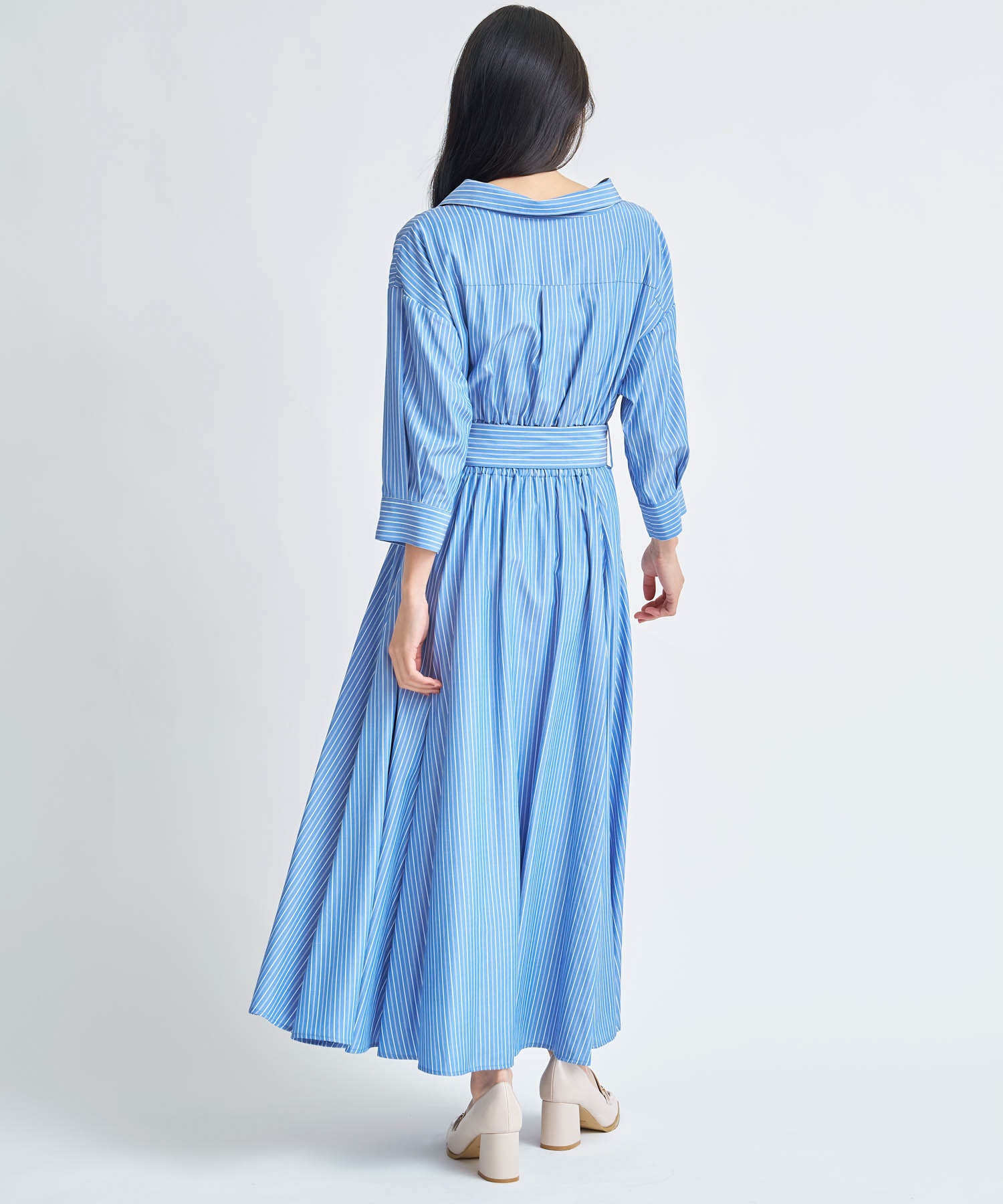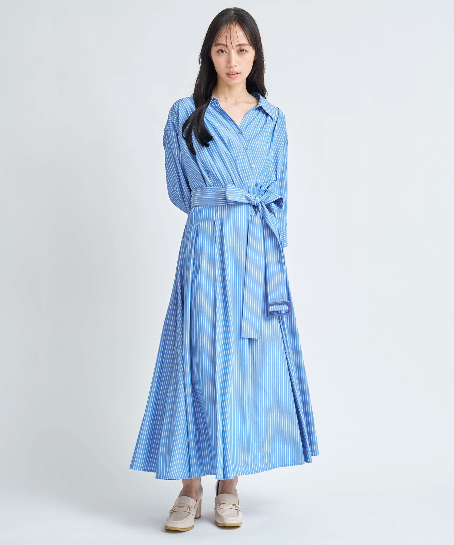 共地のウエストベルトで目線を上げ、裾にたっぷりとフレア分量を施して女性らしい印象に。