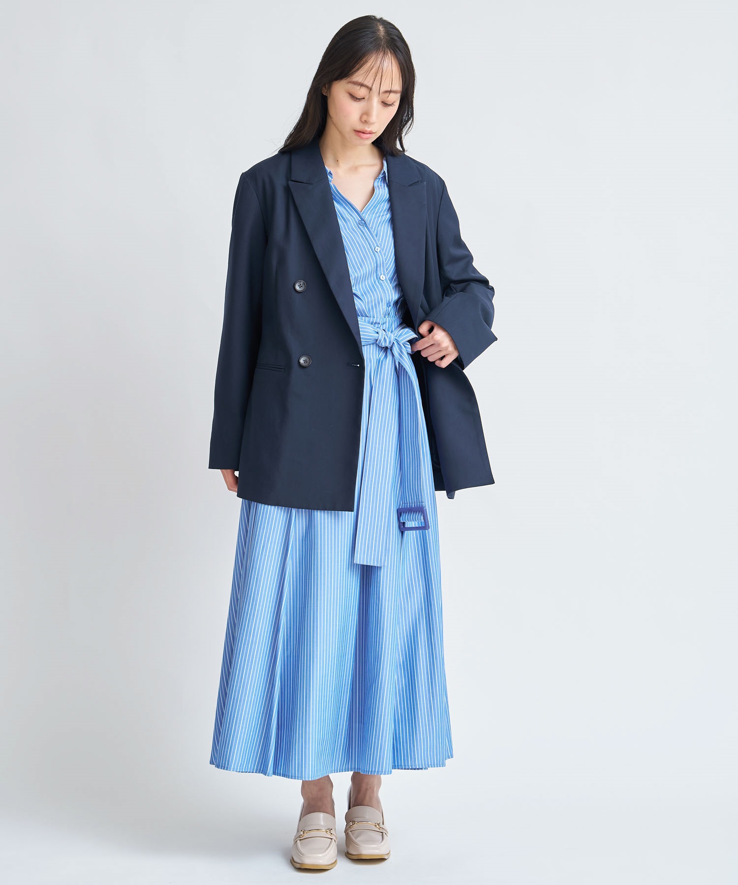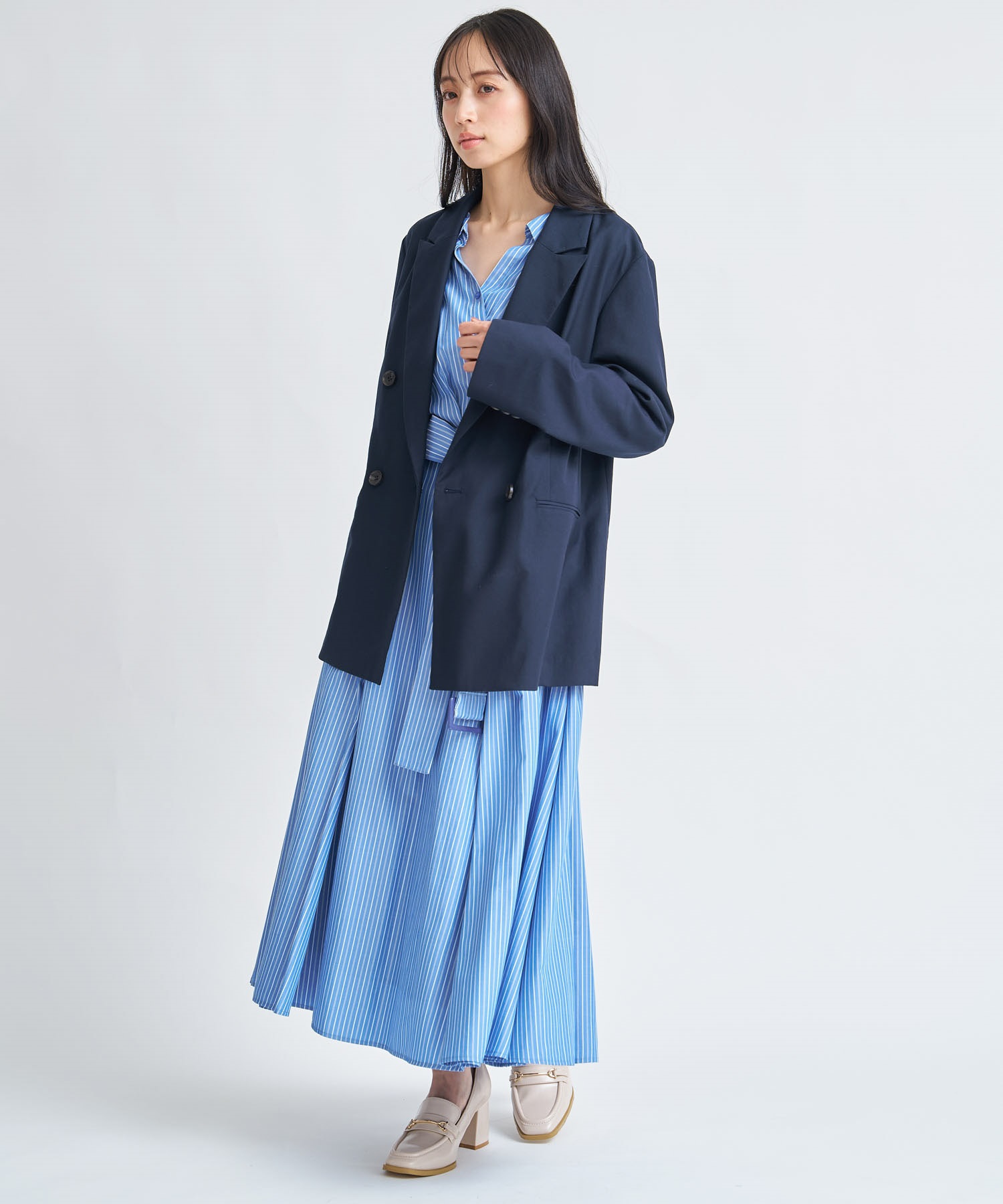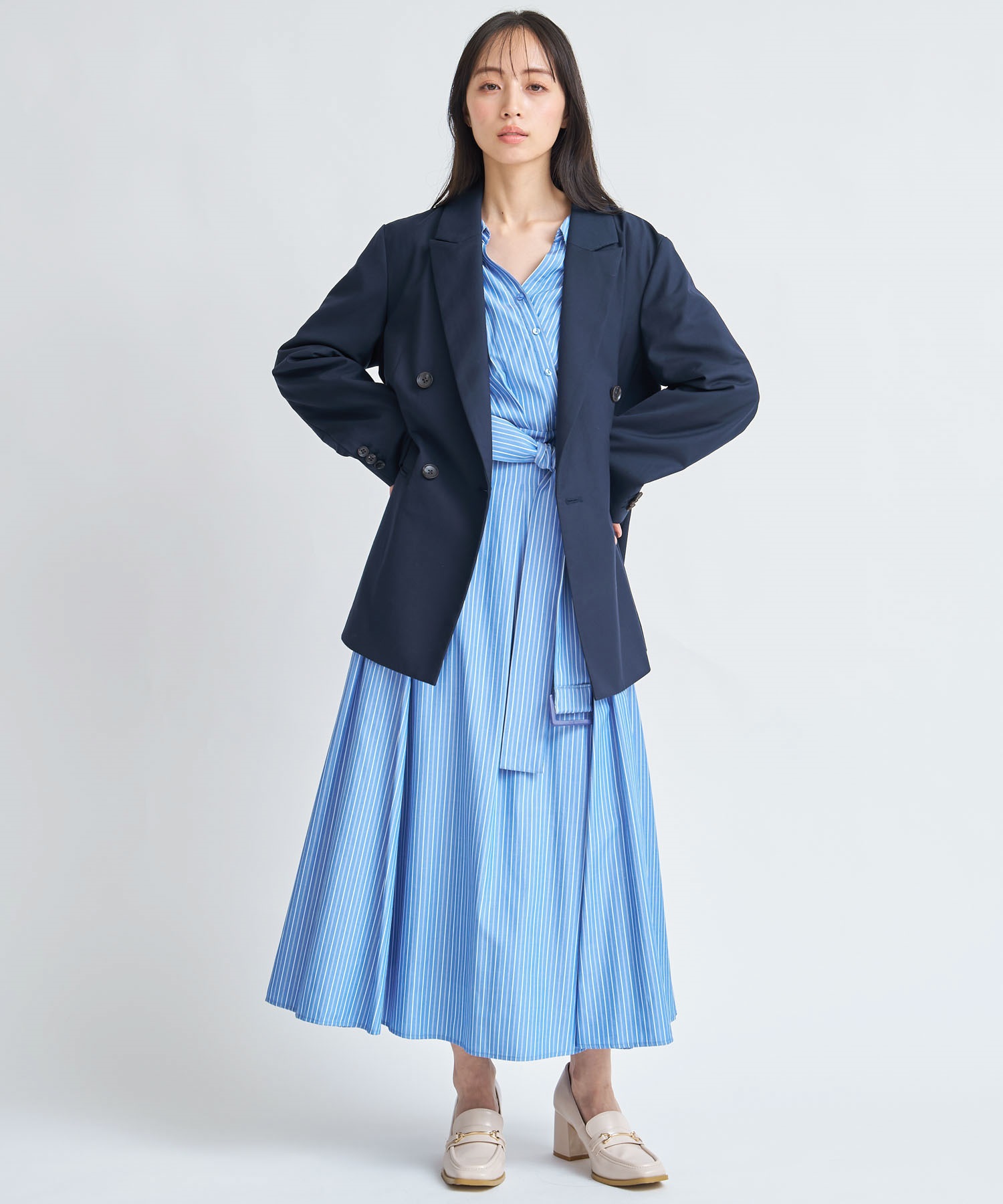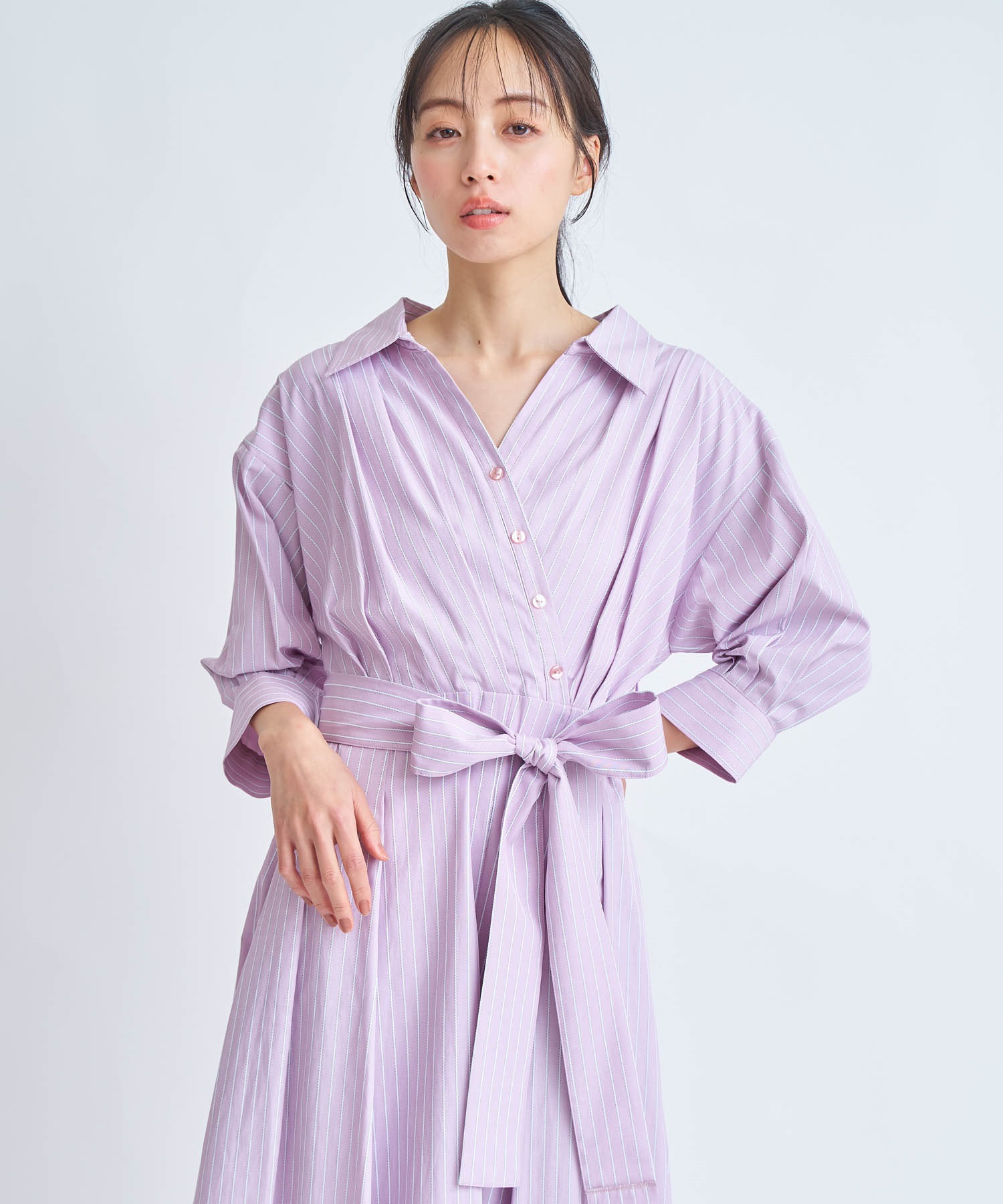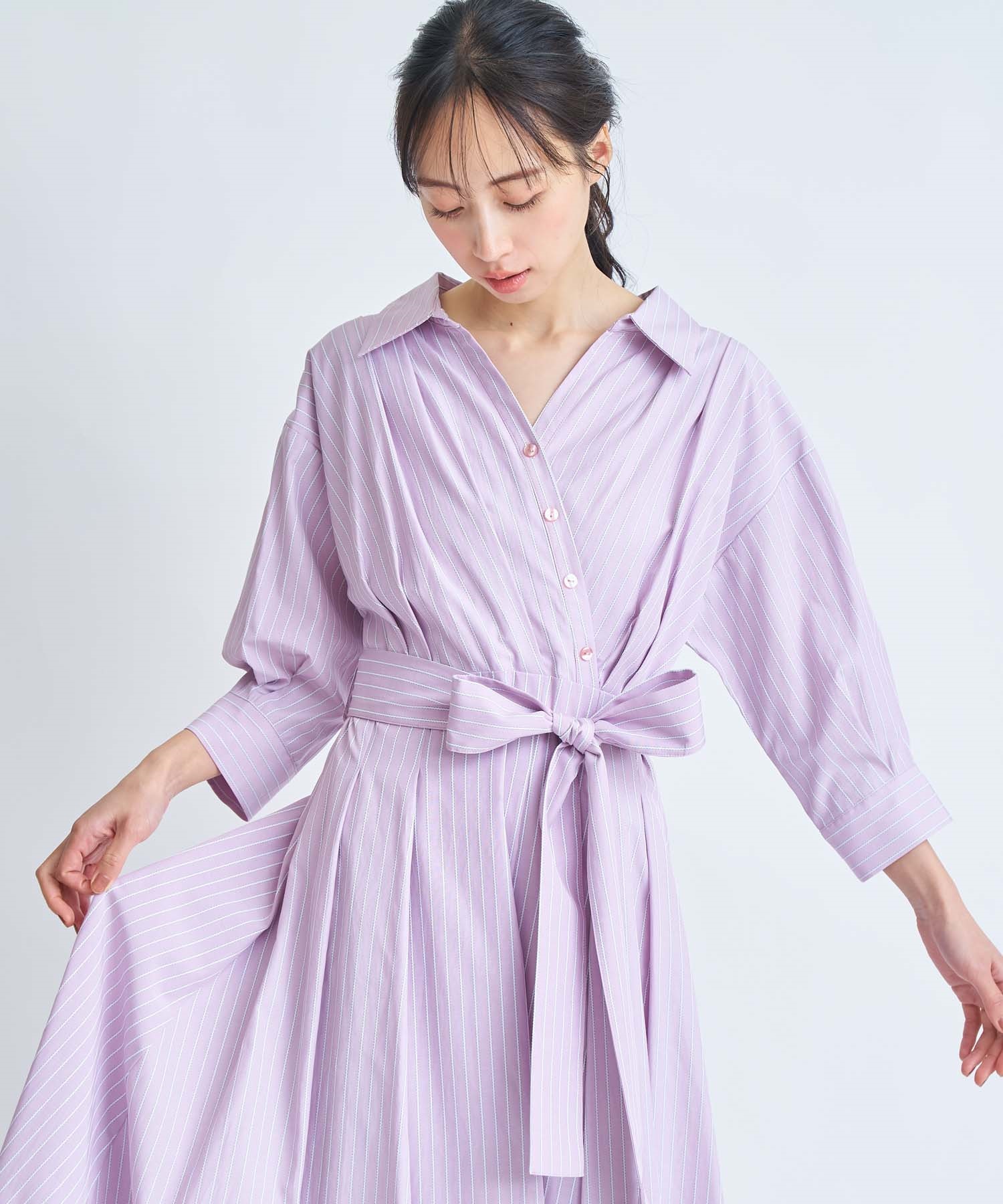 爽やかなストライプ柄と春らしいホワイト無地の展開で、オフィスやお出かけシーンにも活躍する1着です。