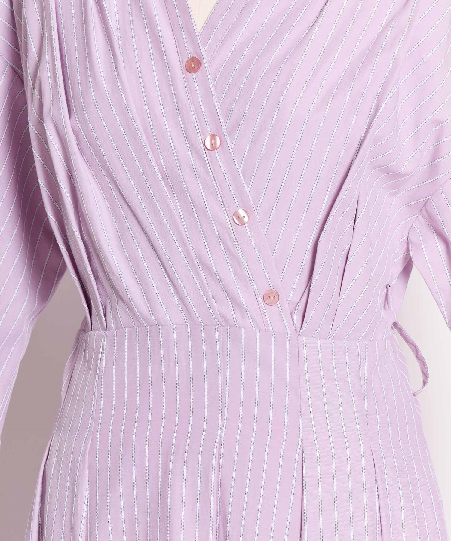 身頃は程よくラフなドルマンシルエットで、襟元はカシュクールデザインが華やかさを添えます。
