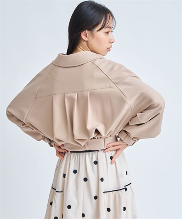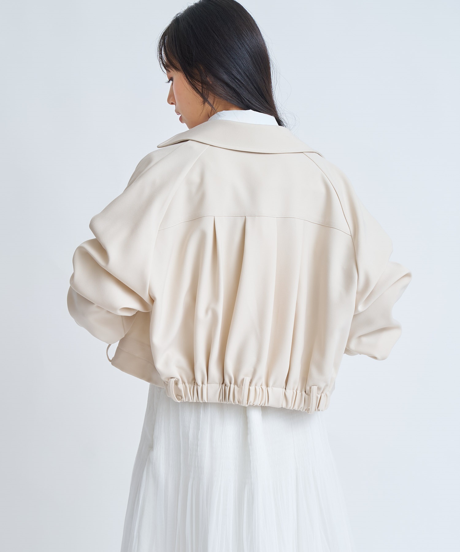 ラグランスリーブとバックタックが生む柔らかな丸みが、短丈でも窮屈さのない立体的なシルエットを演出。