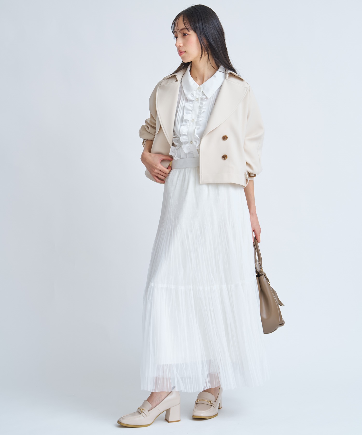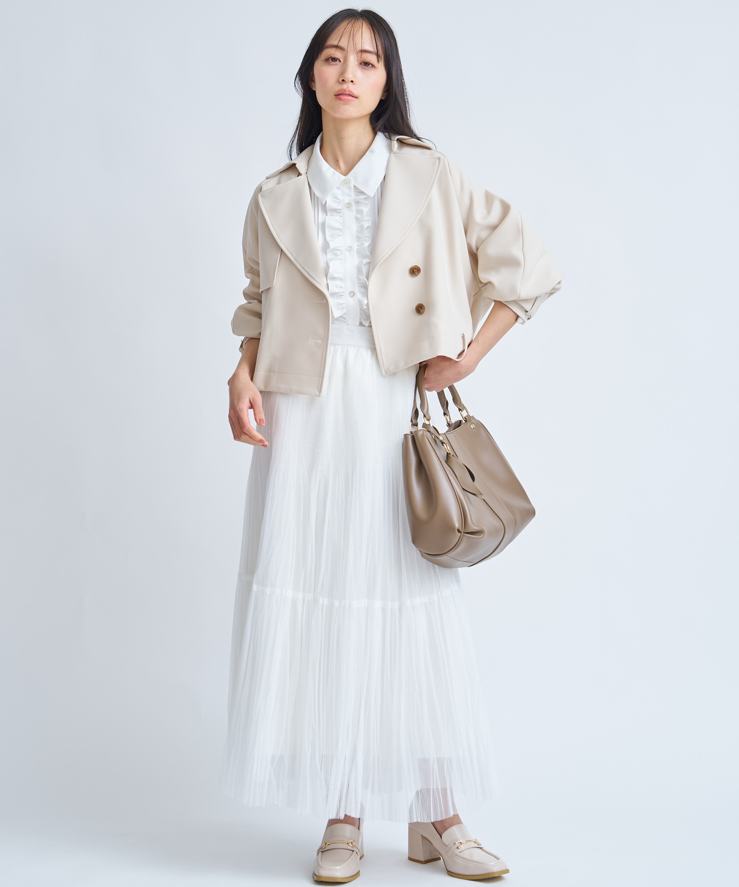 さらっと羽織るだけで女性らしいバランスが整い、フェミニンにもカジュアルにも寄せられる1着です。